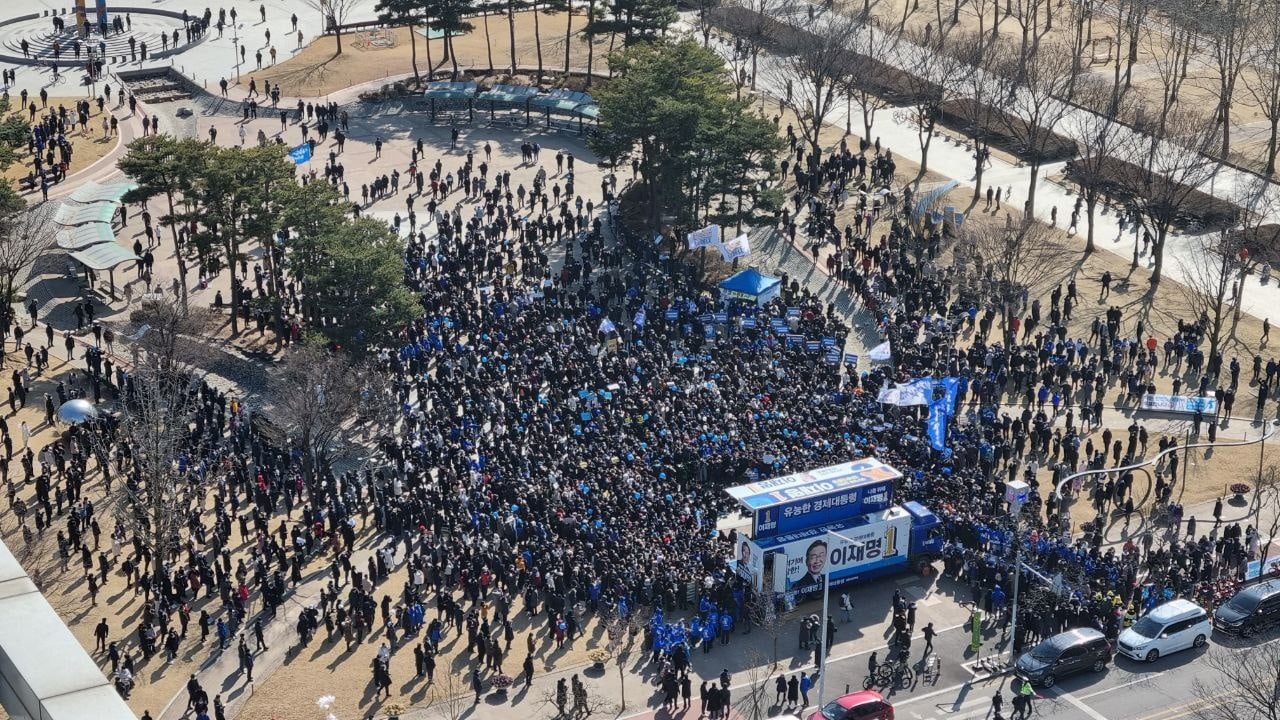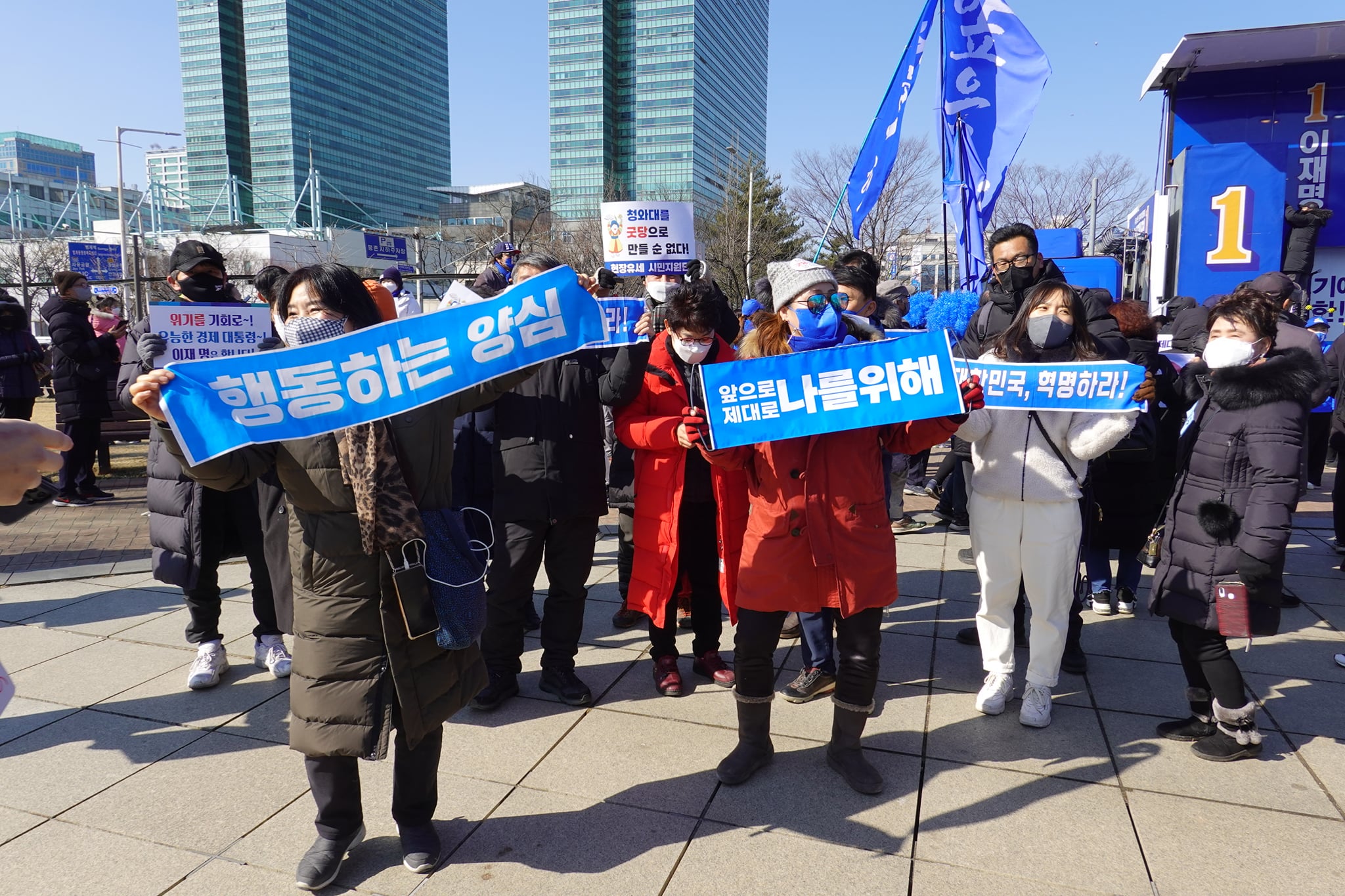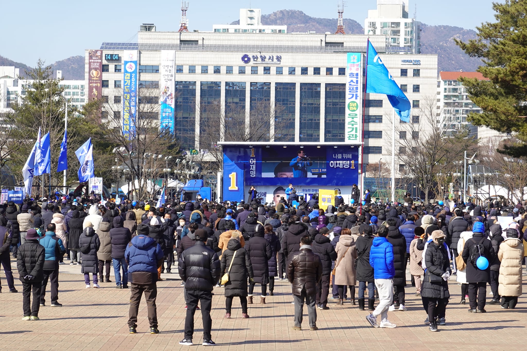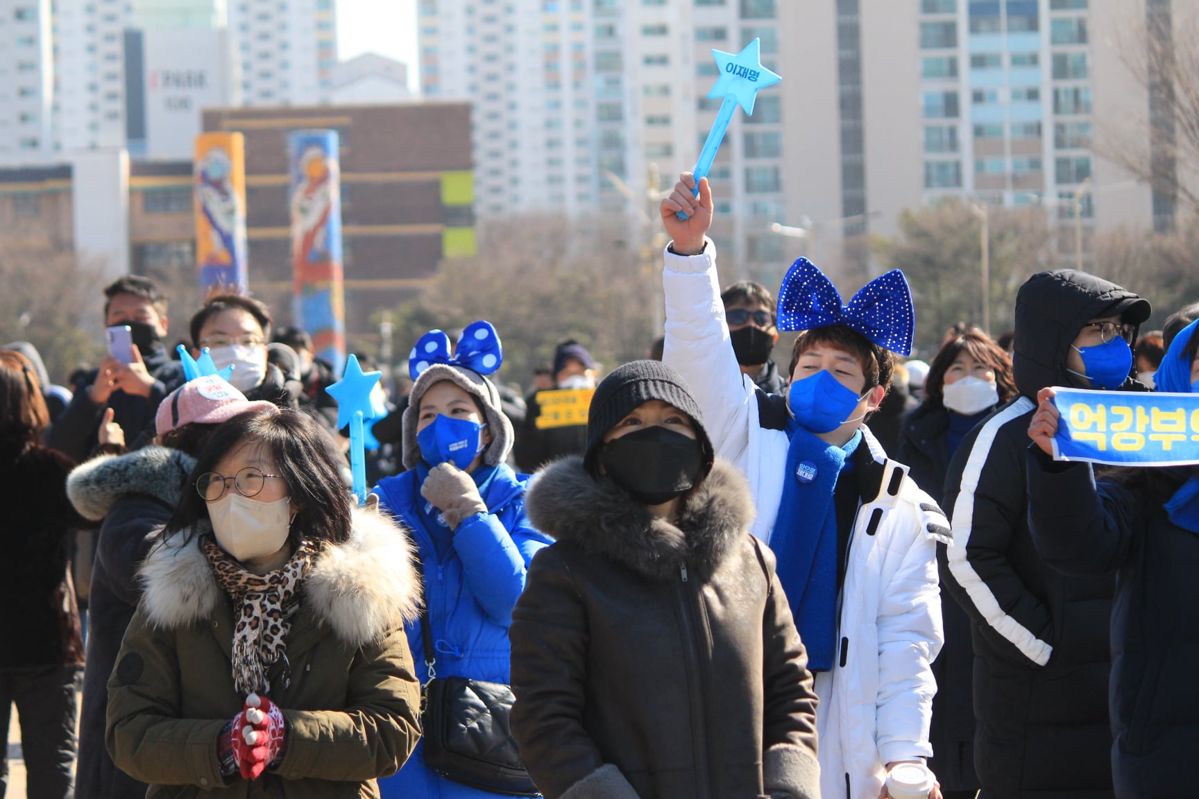 2022.02.20/ #안양 #20대대통령선거 #중앙공원 #선거유세 #이재명/ 안양 평촌 중앙공원 이재명후보 유세장 풍경. 20대 대통령 선거 투표를 20여 일 앞둔 20일 안양 평촌공원에서 열린 더불어민주당 이재명 후보의 선거 유세장에 옷깃을 여미는 칼바람이 부는 추운 날씨에도 불구하고, 6-7천여명(언론 추산)의 시민들이 운집해 뜨거운 열기를 뿜어냈다.