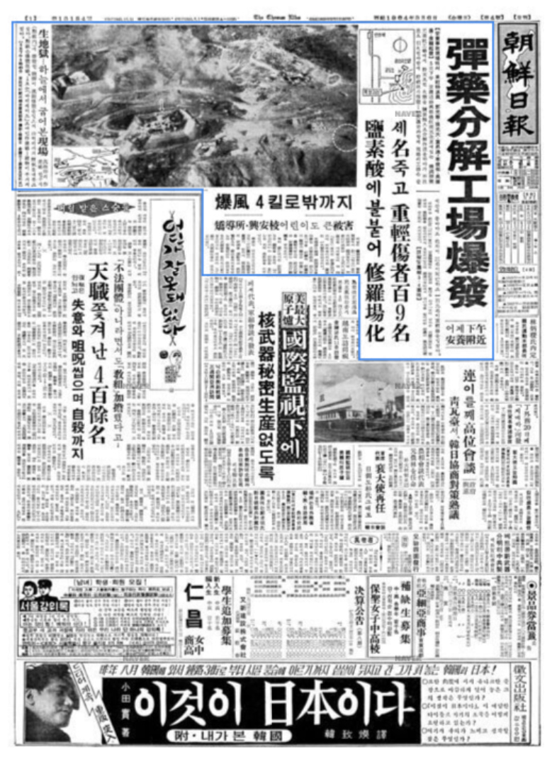 안양의 지축을 뒤흔든 폭발사고 세건이 있다. 그중 옛 신문에서 찾아낸 기록은 1964년 3월 5일 오후 3시경 모락산 자락 안양교도소 인근에 위치한 안양탄약분해소 폭발사건으로 당시 중앙일간지 신문 1면 톱에 실렸던 엄청난 사건이었다.