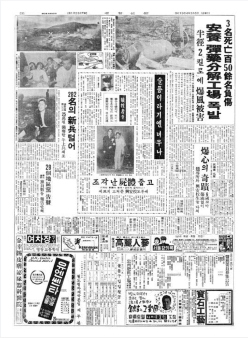 이날 하오 3시 28분 동공사장의 20여개 대형 폭탄이 터지면서 큰폭음과 함께 높이 약 500 미터의 블기둥이 하늘에 치솟았고 현장에서 5백미터」 떨어진 안양교도소, OOO 103명이 깨지는 유리창에 맞아 중경상을 입었으며 1킬로」 떨어진 흥안국민학교 어린이 17명과 교사 6명도 심한 유리의 파편상을 입었 다.