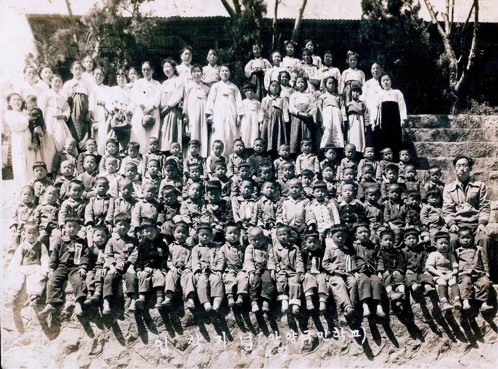 현재 나이 76세 정도 되신 어르신들의 안양초등학교 입학 기념(단기 4286년 4월/ 1953년) 단체사진. 예전 단체사진들을 보면 일반적으로 행사에 참여한 학부모들도 함께 찍었다.