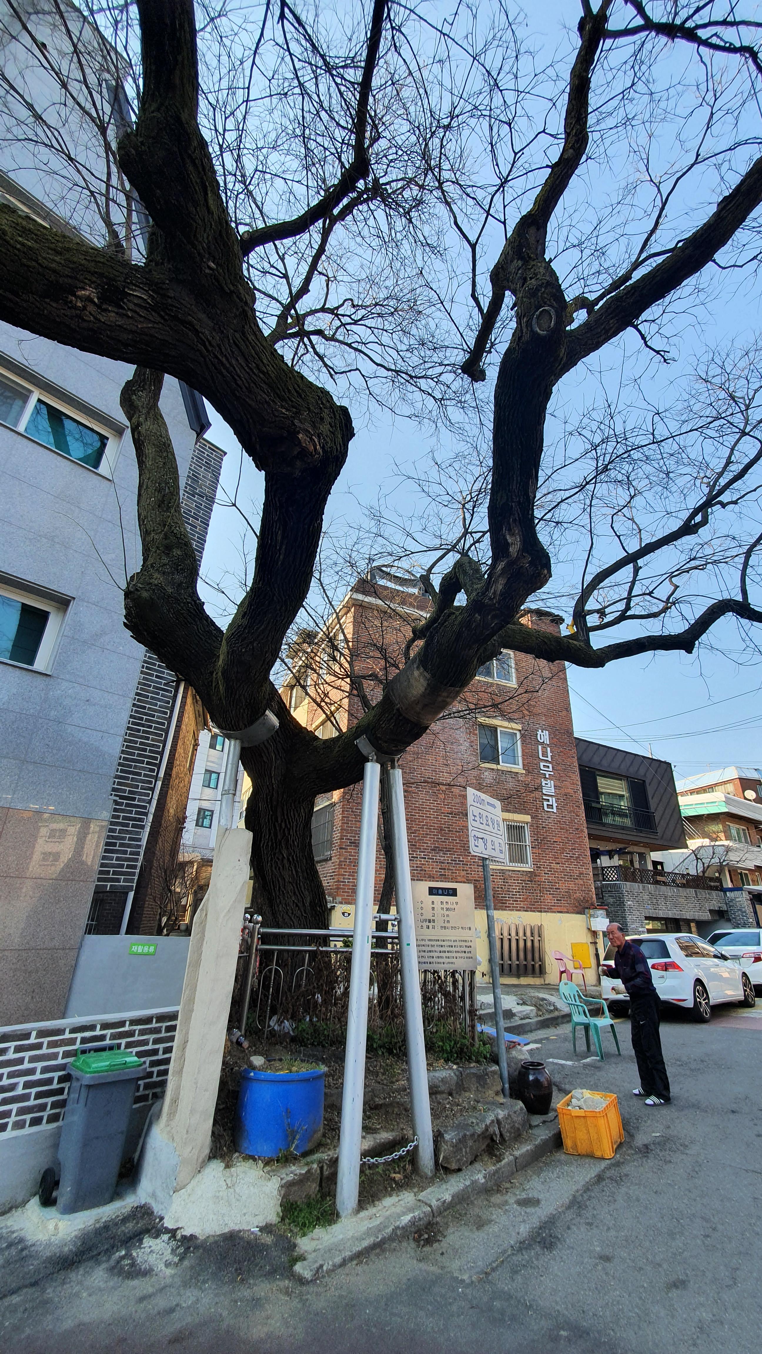 2022.04.02/ #안양 #회화나무 #동네 #골목 #보물 #미래유산 #안양예술공원 / 안양시 만안구 석수1동 안양박물관 후문앞에 자리한 회화나무. 안양탐사대 194차 탐사날에 들리다. 표지판에는 수령 약 380년이라 적혀 있지만 동네주민 말로는 400년이 훌쩍 넘었다고 한다. 이 나무의 높이는 15m, 나무의 둘레는 2m로 1850년대에 마을주민이 심어 가꾸어 왔고, 마을정자목으로 20년전까지만 해도 제를 지낼 정도로 주민들의 사랑을 받았으나 지금은 주민들이 버리는 쓰레기에 나무앞에는 불법주차로 몸살을 앓는다.
