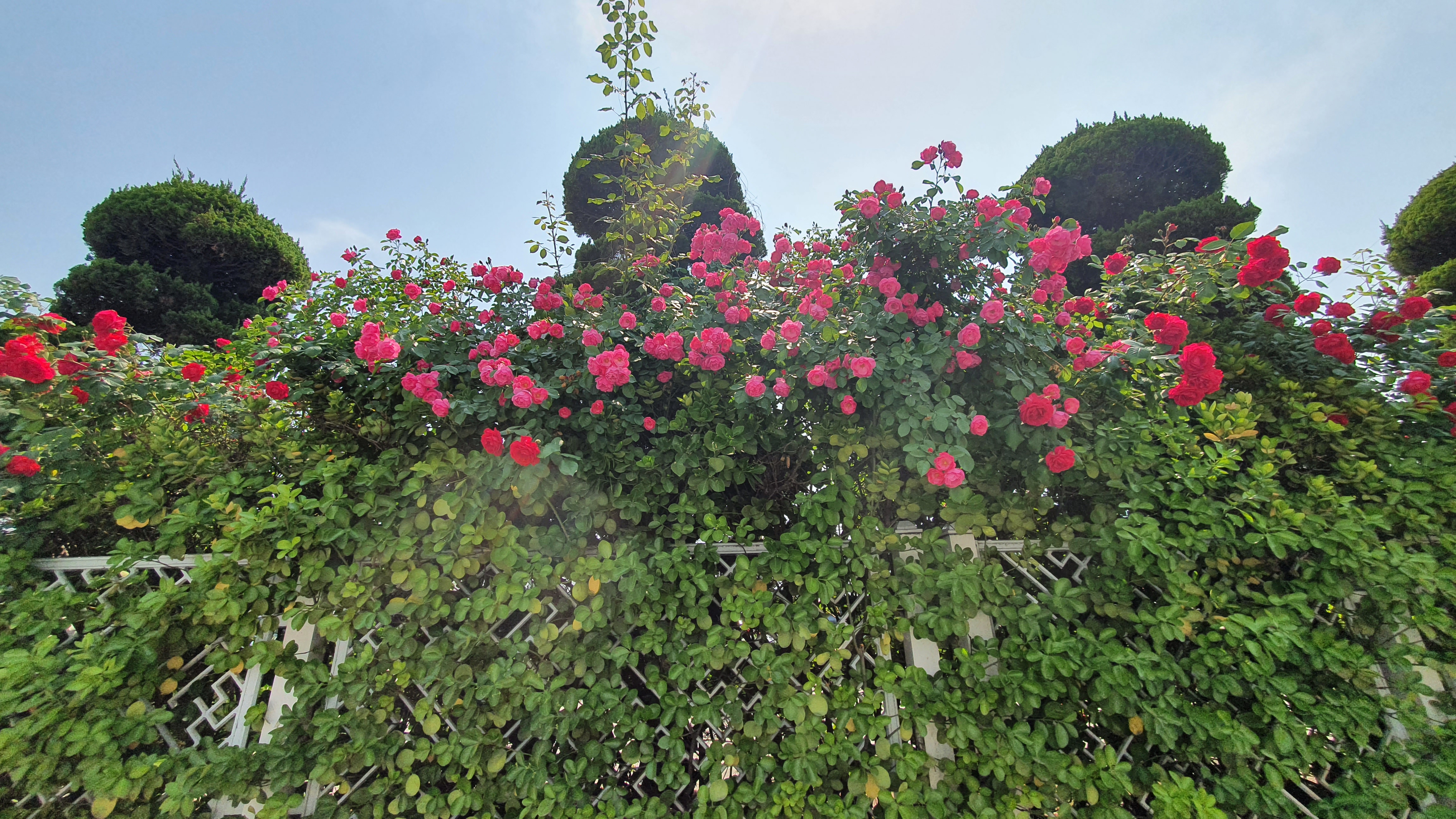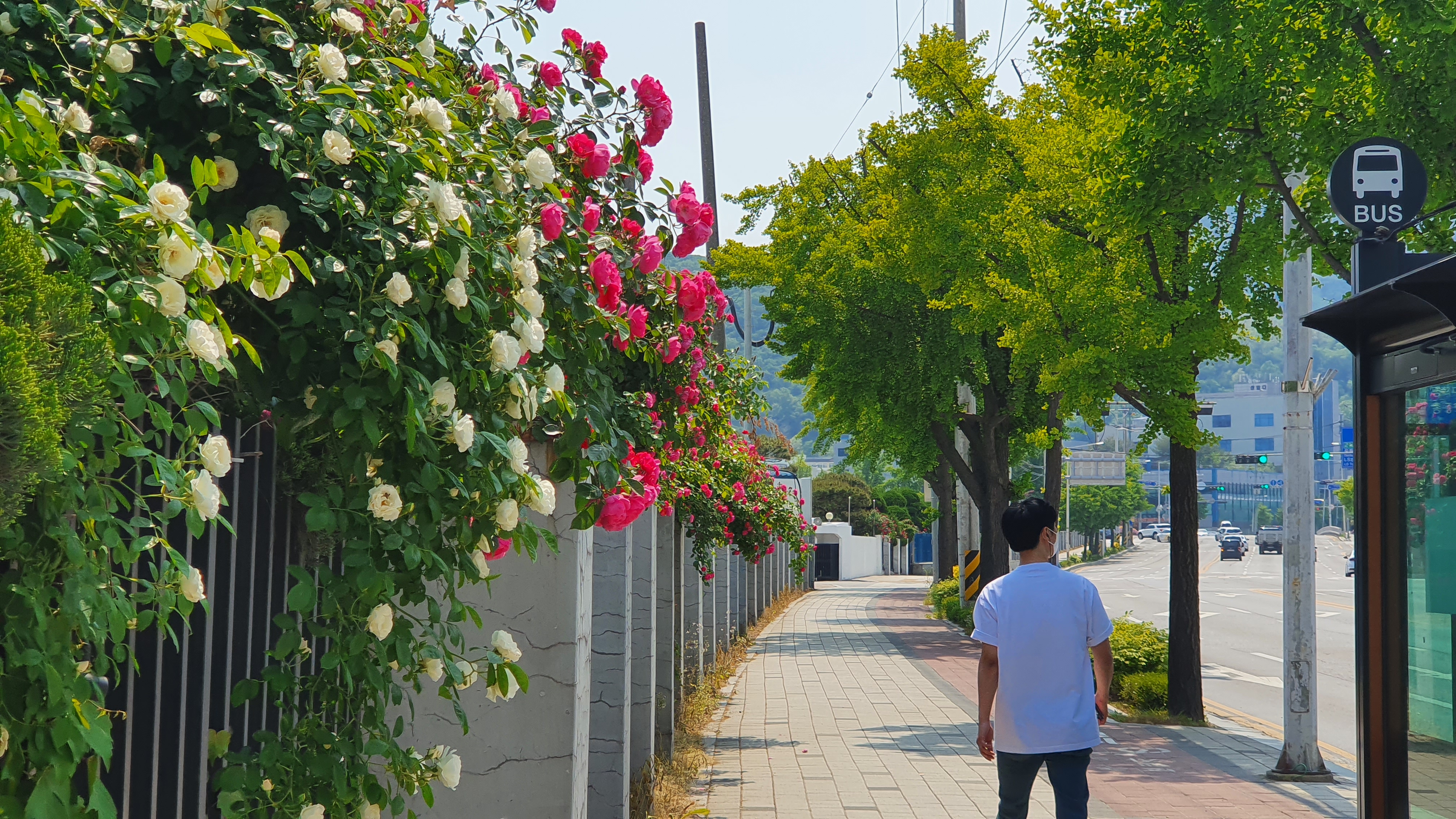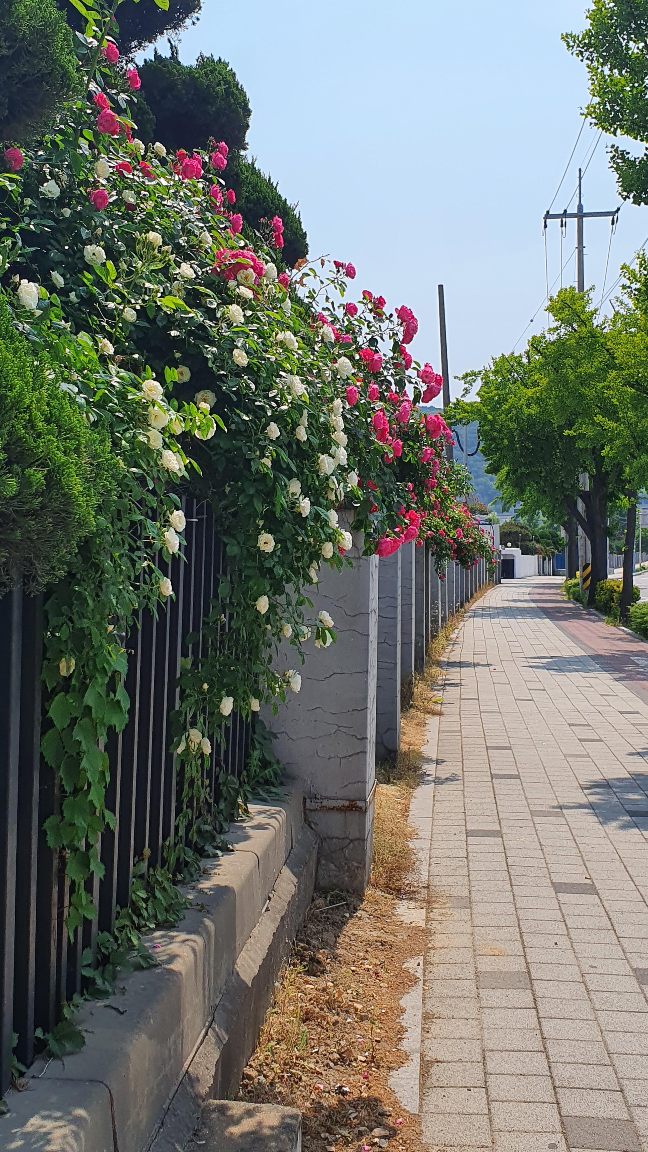 2022.05.18/ #장미 #오월 #효성안양공장/ 꽃구경 오세요!!! 매년 5월이 되면 장미꽃이 만발하는 안양 호계동 효성 안양공장 담벼락. 차를 타고 지나는길에 보니 장미꽃이 만발. 급히 달려갔지요. 빨간장미, 분홍장미와 더불어 보기드문 하얀장미까지 화려한 자태를 뽐내고 있네요. 그 무엇보다 반갑던것은 많지는 않지만 서너마리의 벌이 윙윙 날아다니는 것.