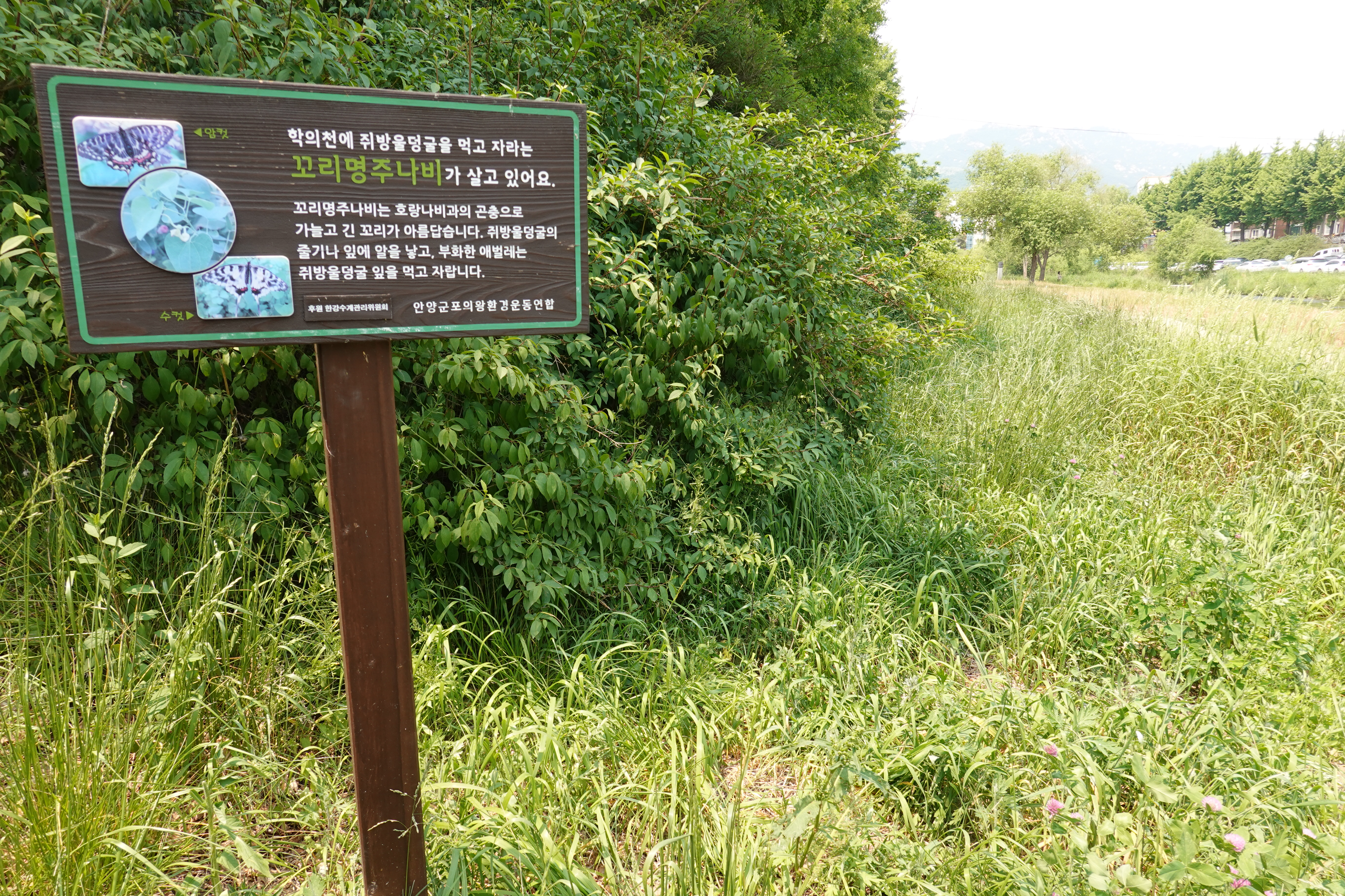 이 군락지가 중요한것은 멸종위기종 적색에 해당하는 꼬리명주나비(긴꼬리에 빨간점이 똭! 찍힌 나비)를 관찰할 수 있는 생태지역으로 학의천의 명물이자. 지표종으로 내세워도 손색이 없기 때문입니다. 꼬리명주나비는 쥐방울덩굴 잎에 알을 낳고 부화한 애벌레가 쥐방을덩굴의 잎을 먹고 자라기 때문에 지자체가 적극 보호에 나서야 합니다. 이를 위해 하천변 생태공간을 마련하고 생물서식 공간제공으로 조성하여 자연생태 학습장소로 활용해 나가야 하고요. 쥐방울덩굴이 사라지면 꼬리명주나비를 더 이상 볼 수 없기 때문에 안양군포의왕환경운동연합에서는 그동안 이곳 군락지앞에 팻말까지 세워 놓았음에도 군락지를 처참하게 파괴해 버렸네요. 안양시 환경부서 일부 공무원도 이곳이 생태적으로 중요한 지역임을 알고 있음에도 없에버렸다는 사실은 정말 충격적이고 전지구적으로 중요시되는 생물다양성과도 위배되는 일입니다!