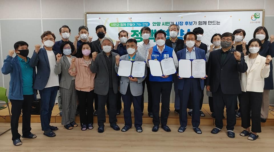 안양YMCA, 안양YWCA, 안양여성의전화, 안양군포의왕환경운동연합, 안양여성의전화, 안양시지속가능발전협의회, 민주노총경기중부지부 등 31개 시민·노동단체로 구성된 '6.1지방선거 시민사회정책연대(이하 정책연대)'는 재선에 도전하는 최대호(63어민주당 후보와 23일 더숲(더불어숲)에서 정책협약을 맺었다.