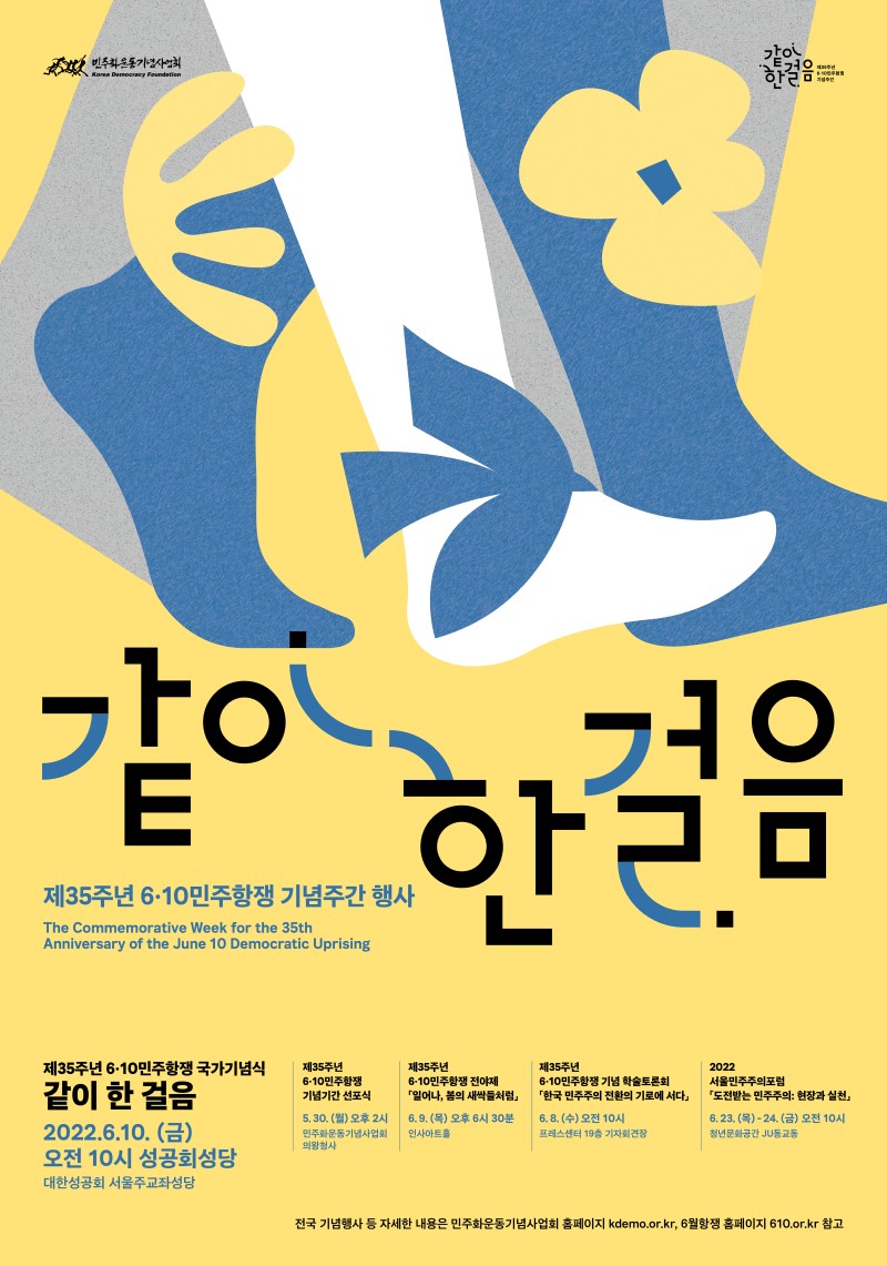 올해 기념주간의 슬로건은 ‘같이 한 걸음’ 입니다. 연대와 화합을 강조하는 올해의 슬로건은 지금껏 민주주의를 향해 시민들이 함께 해 온 걸음, 그리고 앞으로 나아가는 한 걸음의 중의적 의미를 담았습니다.