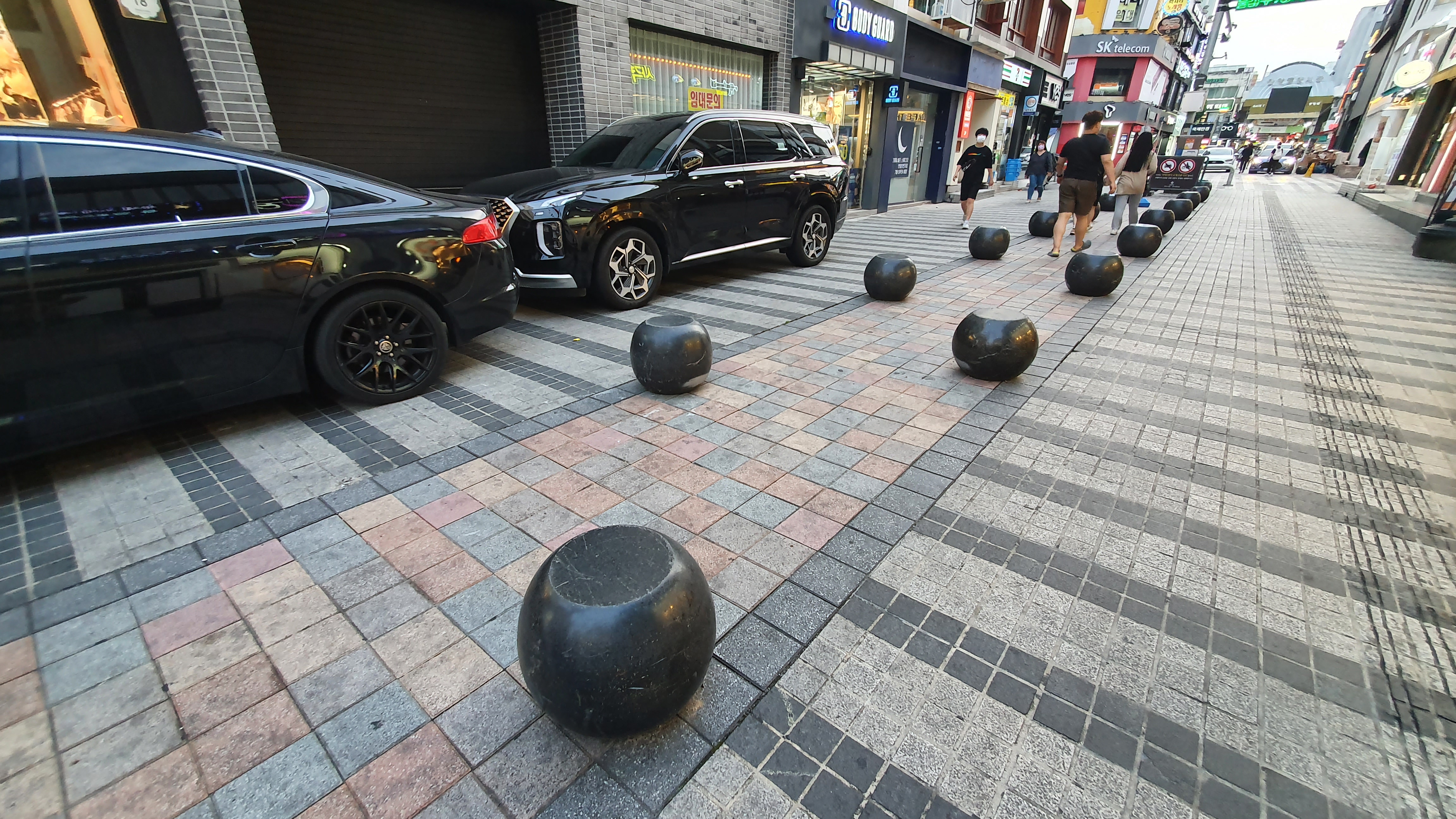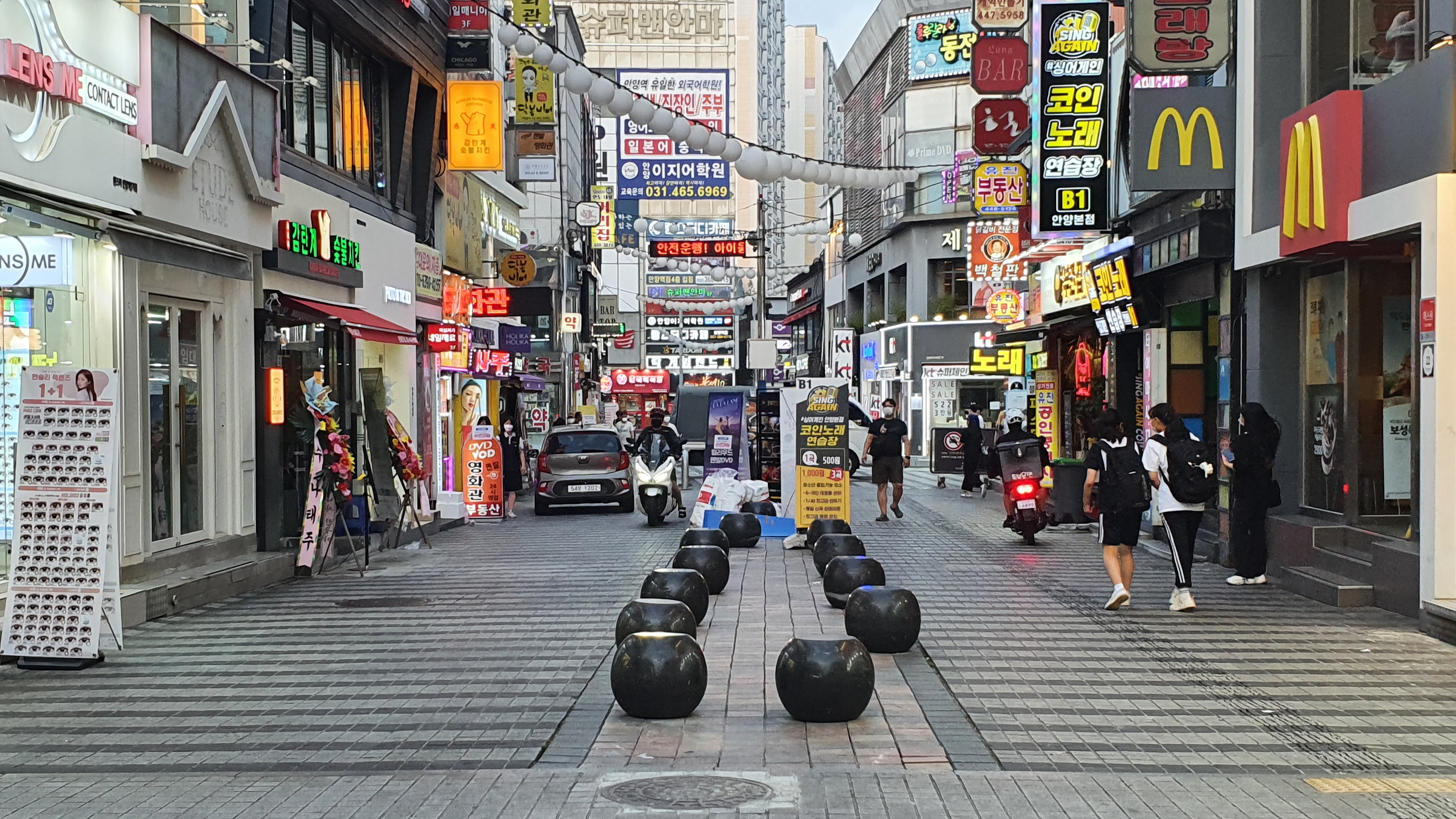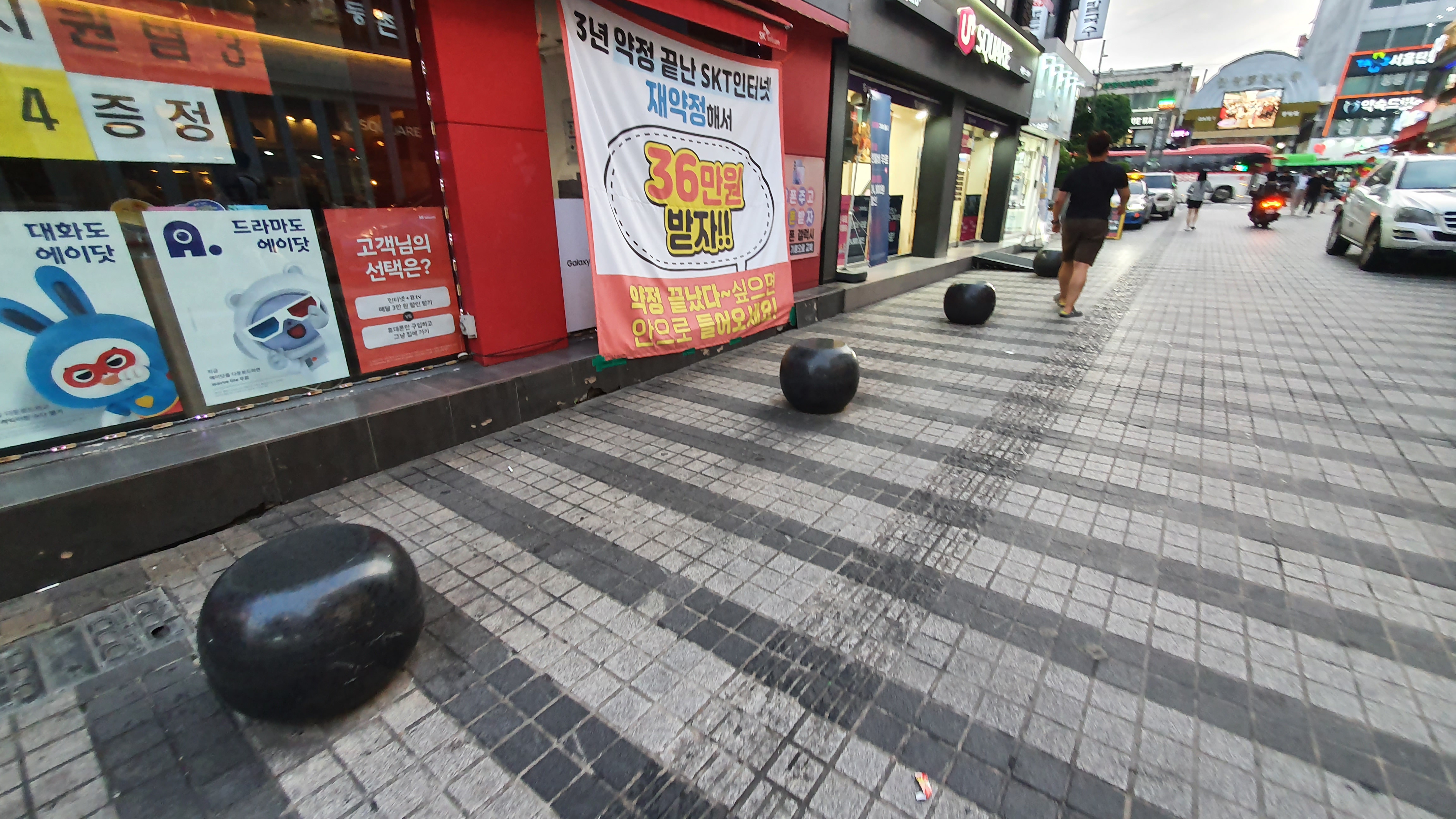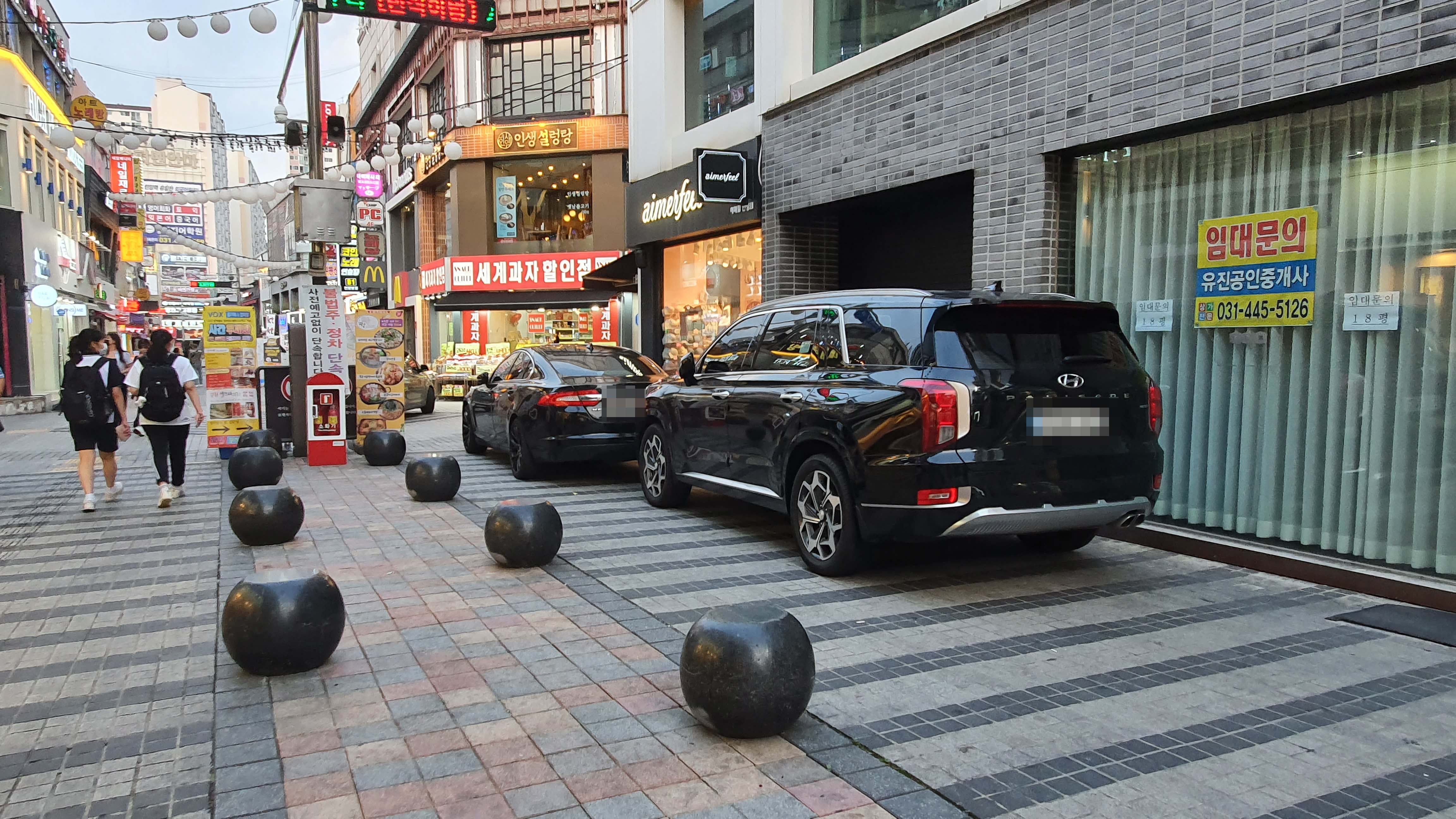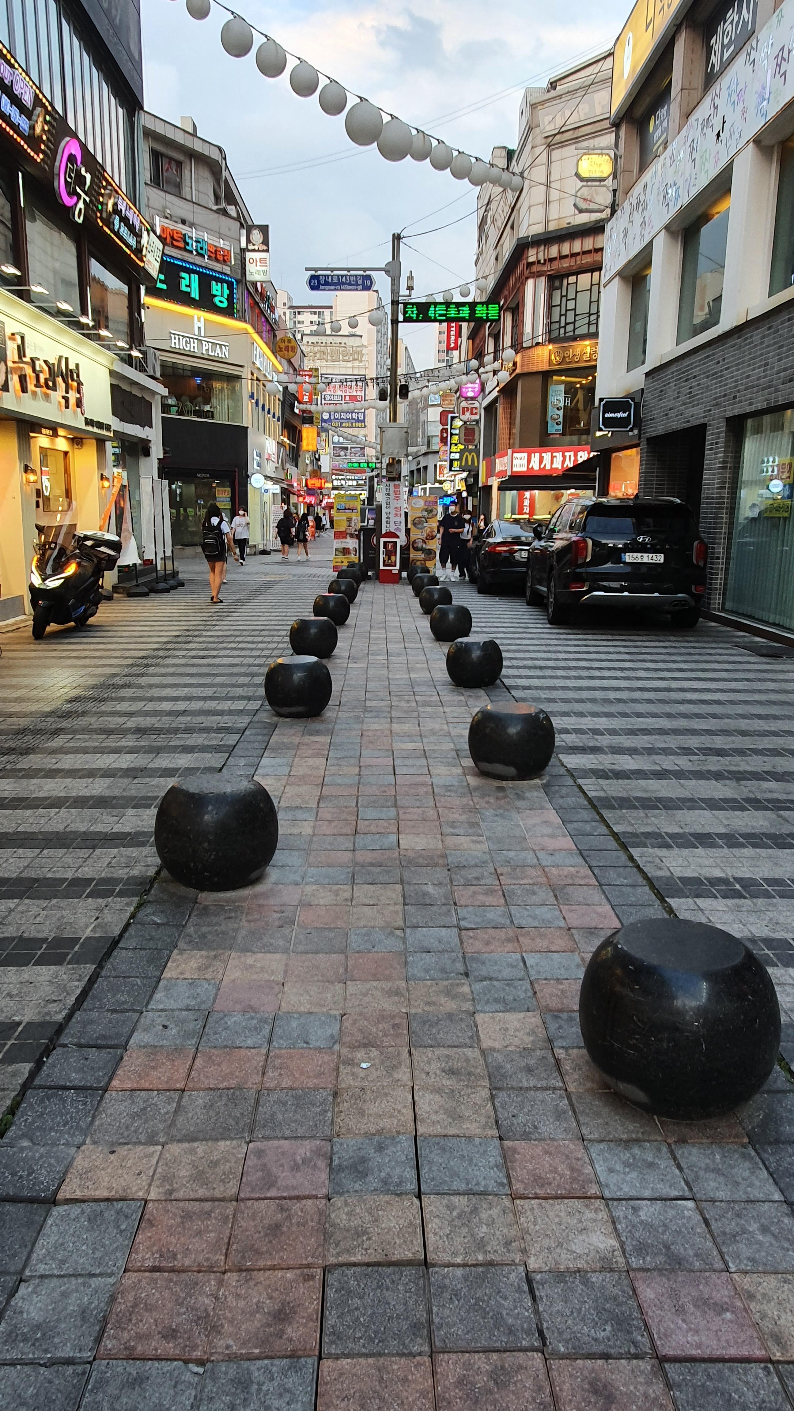 2022.07.07/ #안양일번가 #도시기록 #호박돌 #불법주차 #골목/ 안양일번가에서 제일 큰 번화가인 신한은행옆 중앙통로에 동그란 호박돌이 놓여졌다. 저 둥근 호박돌은 지난 2006년 안양에서 열린 세계인라인대회를 앞두고 안양 일번가를 정비하면서 일번가내 주차를 금지하고 삼원프라자호텔 앞 도로만 차량 통행을 하기위해 도로 양쪽 상가앞 주차 금지를 위해 설치했던 주차금지용 블록이다. 당시 중앙 통로에는 직사각 형태로 앉을수 있는 커다란 돌의자가 설치됐는데 소방차 진입의 어려움, 쓰레기 문제 등으로 2015년 무렵 철거하고 그자리에 나무를 심었으나 관리 부재속에 모두 고사하고 이후 중앙통로는 불법 무단 주차의 천국으로 변질돼 보행권 침해의 대표 지역으로 손꼽혀왔다. 최근 일번가번영회 요청으로 중앙통로에 호박돌을 놓았다고 하는데 주차단속이 우선 아닐까 싶다. 불법주차 차량 소유주를 조사하면 재밋는 결과가 나올텐데.