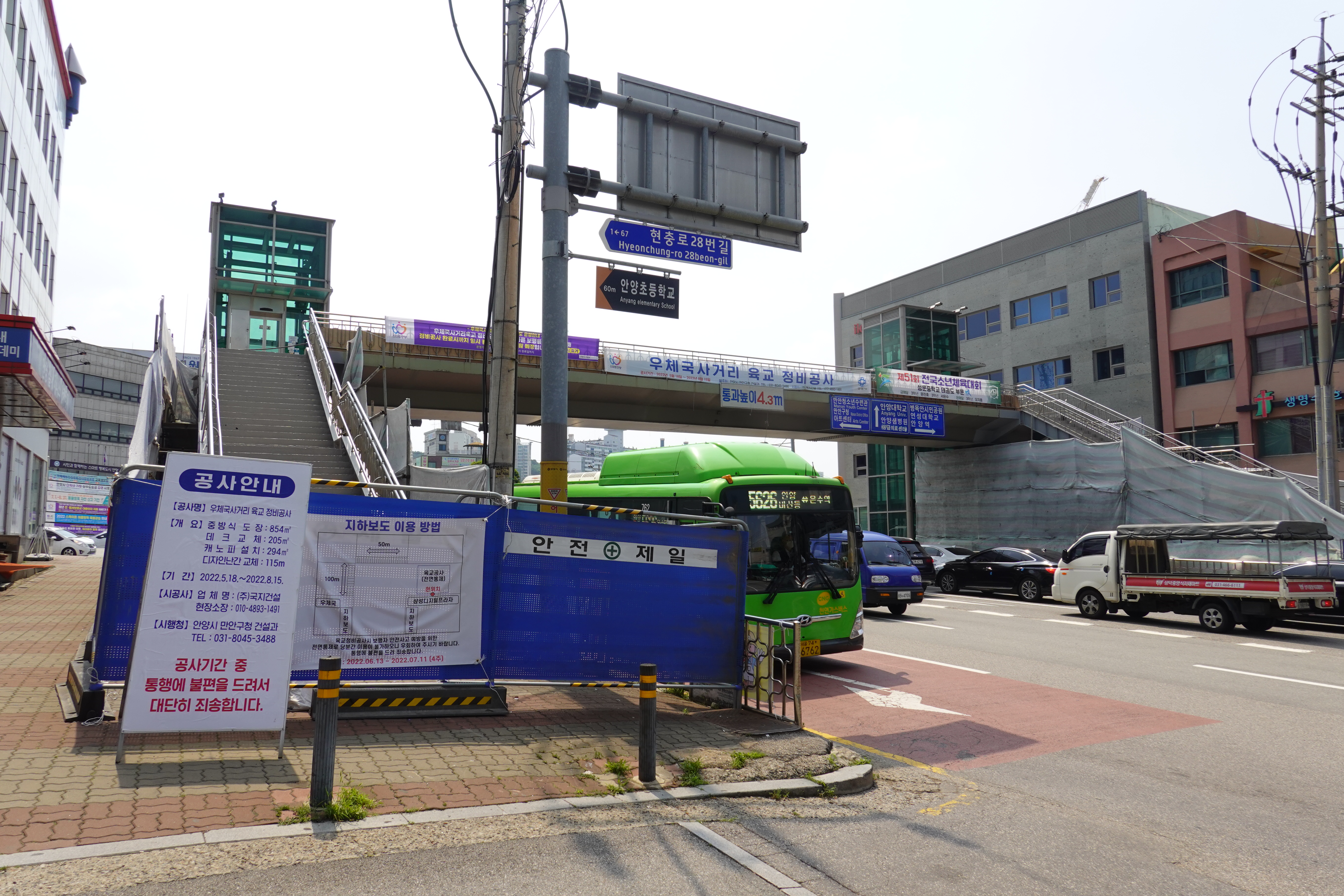 2022.07.11/ #횡단보도 #도시기록 #안양 #안양5동/ 안양우체국사거리(안양초교-남부시장방향)에 횡단보도가 설치됐다. 같은곳에 있는 육교의 리모델링 공사에 따른 '통행 불가' 불편 해소를 위한 임시 조치로 보인다.