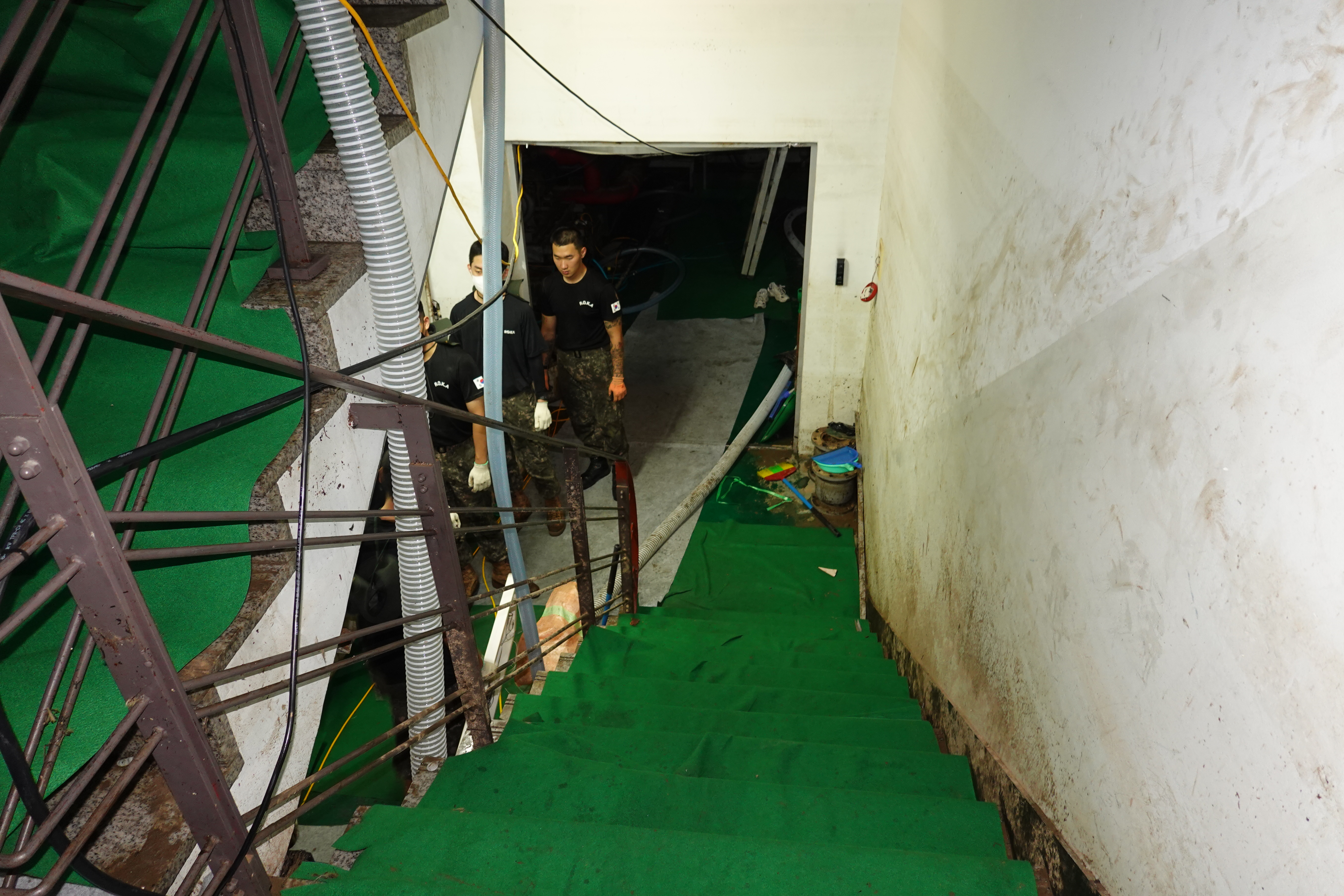 특히 수도군단 장병 30여명은 침수 피해 규모가 큰 안양7동 소재 중소기업 한라식품을 찾아 침수된 회사 지하 1.2층에 유입된 토사와 뻘을 제거하고 침수된 뜰안채식당의 의자와 식탁, 집기등을 끄집어내는 등 수해 복구 작업을 벌였다.