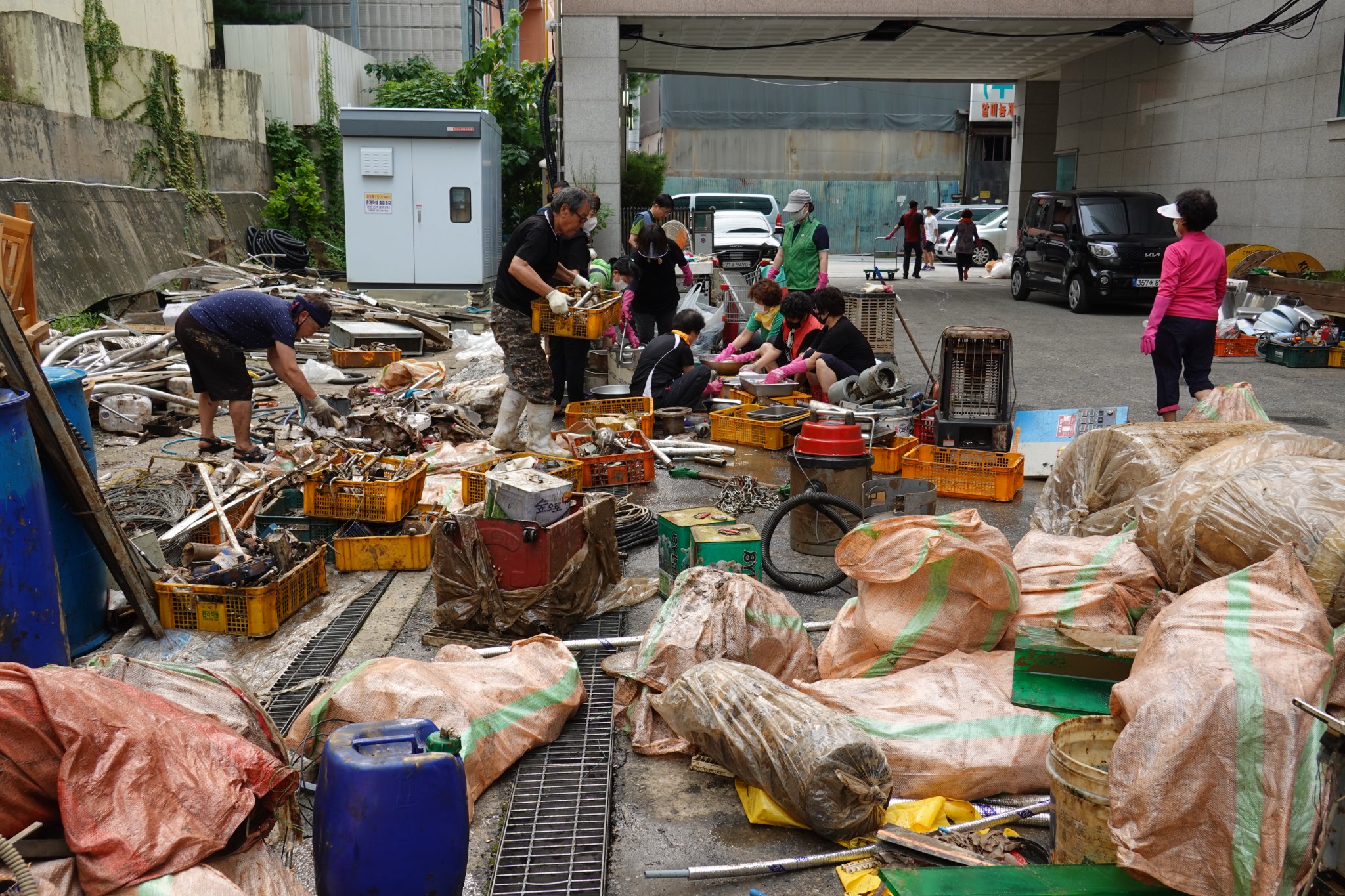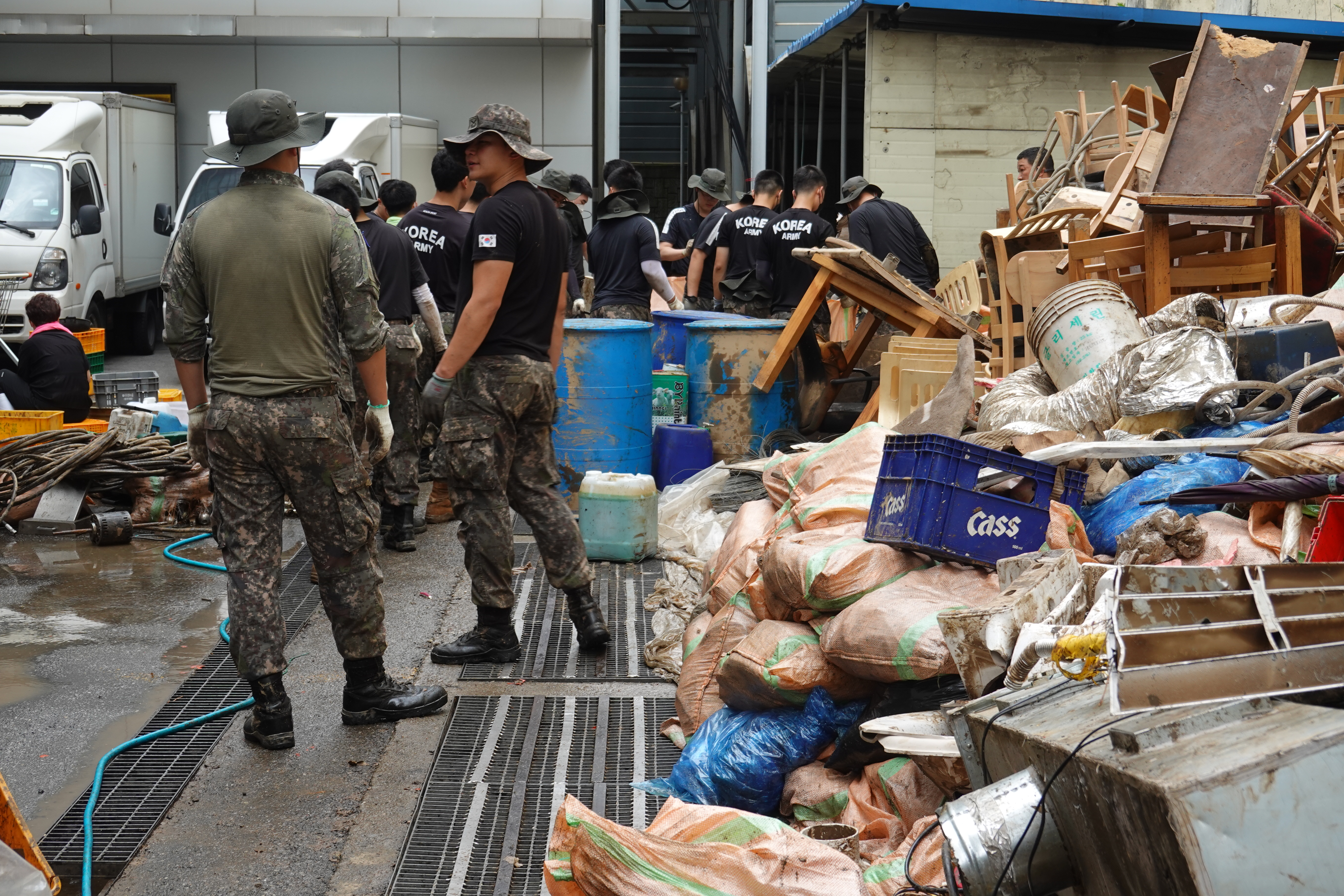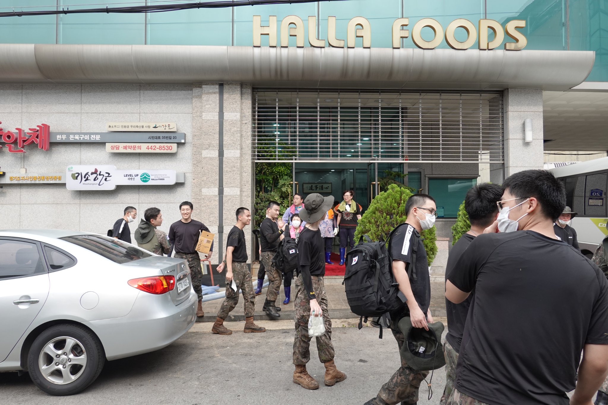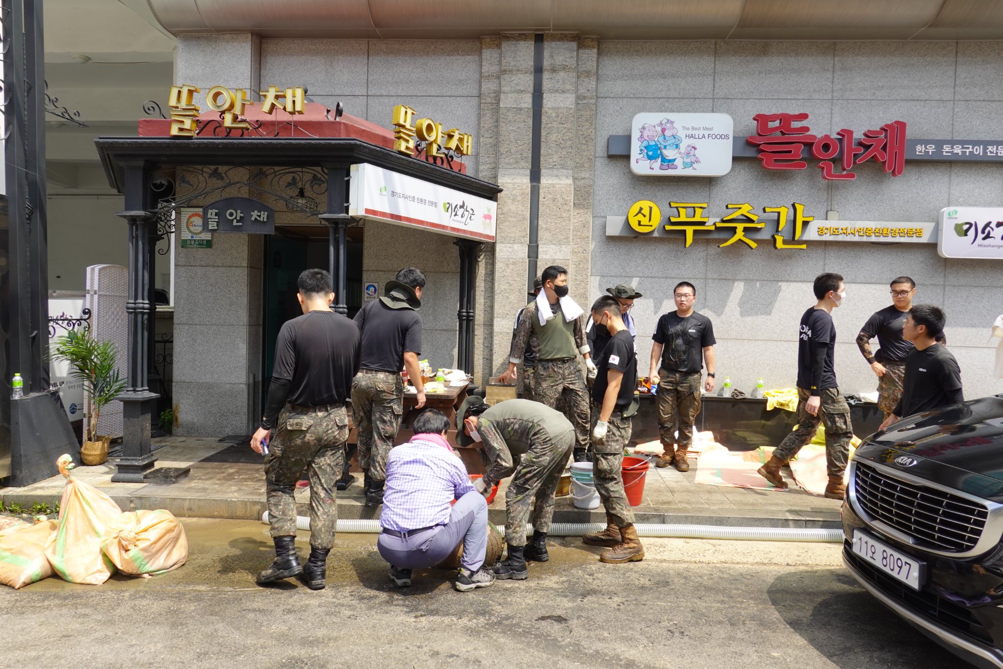 2022.08.14/ #도시기록 #수해 #침수 #한라식품 #안양7동 #복구작업 #수도군단장병 #자원봉사/ 안양군포의왕을 비롯 경기도관내 초중고교 등에 친환경 고기를 납품하는 한라식품(안양7동 소재)의 수해 피해가 심각하다. 한라식품은 집중호우가 쏟아진 지난 8일 밤 회사앞 도로 맨홀에서 역류한 하수가 지하 1.2층으로 들어와 전기배전실과 작업실, 냉동냉장시설, 부설식당 뜰안채 등이 침수돼 수십억대의 피해를 본 것으로 알려졌다. 지난 9일밤 대형발전차 동원에 있어 10일 임시 전기가설과 11일부터 시작된 본격적인 복구 작업에는 수도군단 장병들과 자유총연맹, 안양시걷기협회, 부림동주민자치센터, 안양자원봉사센터 등에서 나온 봉사자들이 15일 현재까지 닷새째 구슬땀을 흘리며 복구작업을 펼쳤다. 또 피해 규모가 워낙 크기에 작업은 16일에도 계속될 예정이다.