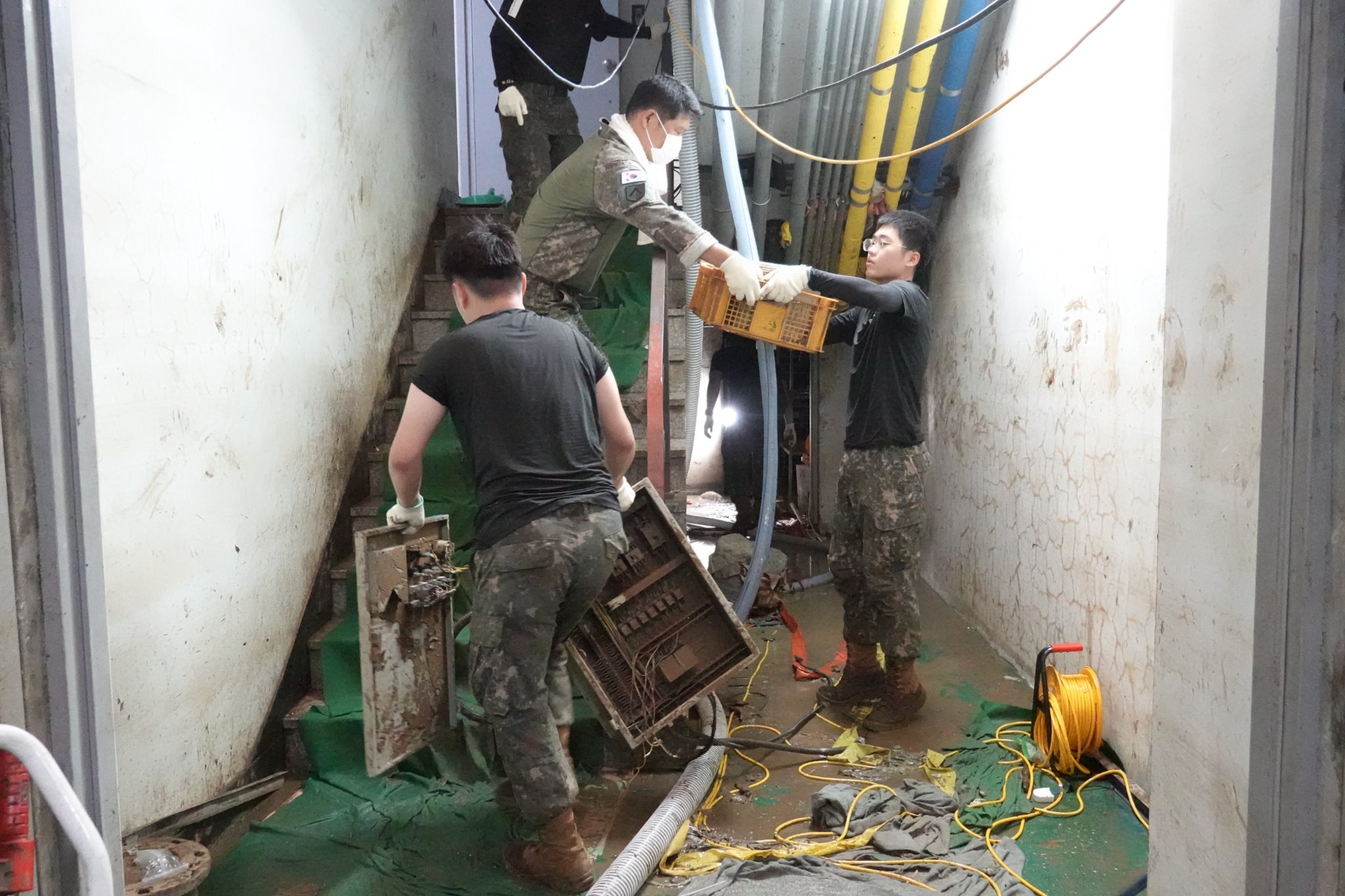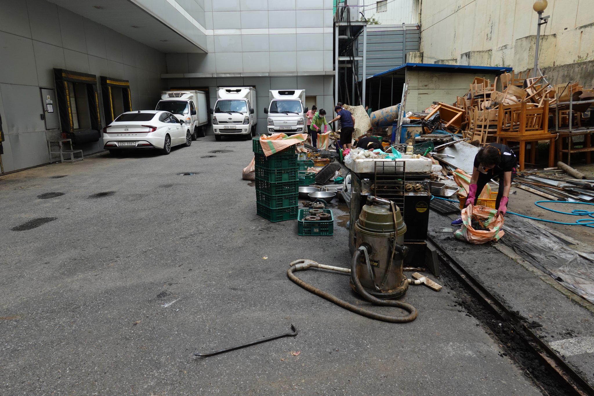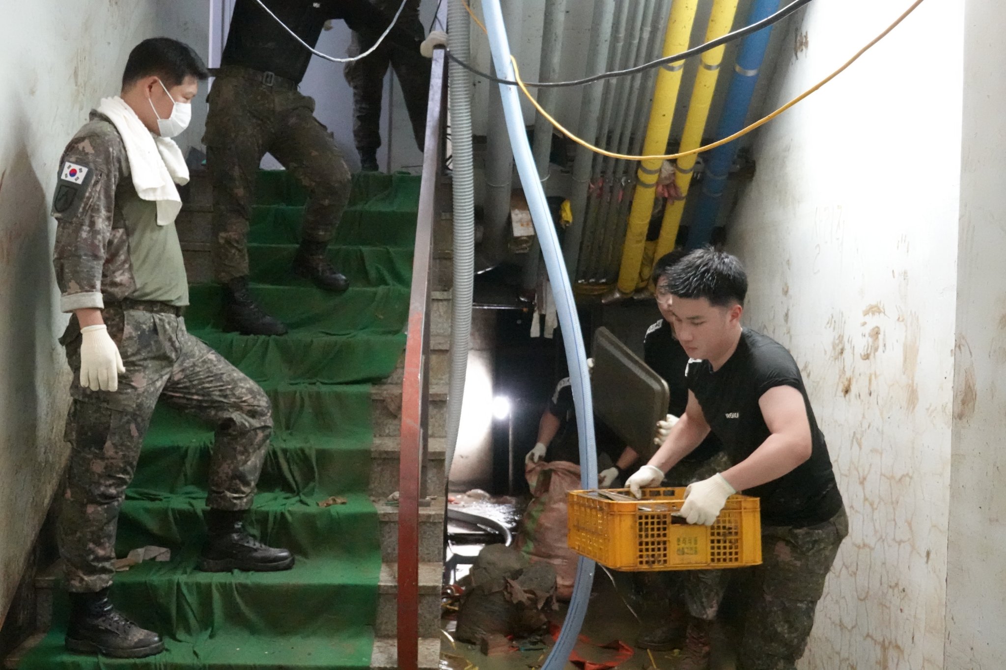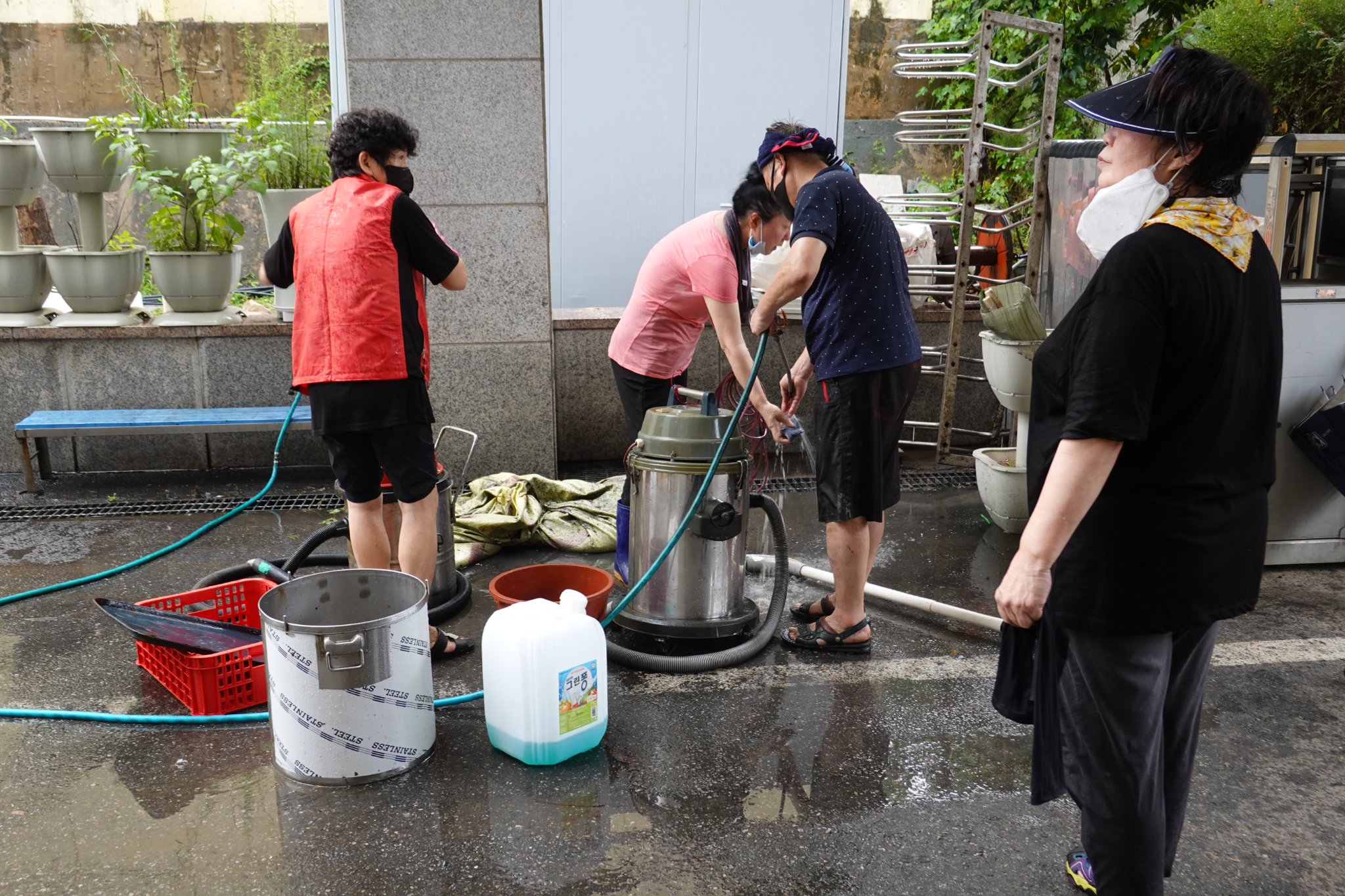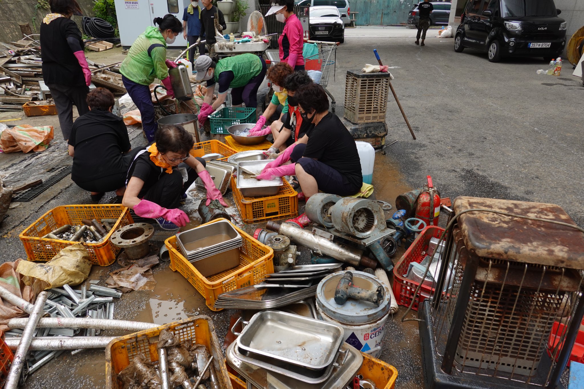 2022.08.14/ #도시기록 #수해 #침수 #한라식품 #안양7동 #복구작업 #수도군단장병 #자원봉사/ 안양군포의왕을 비롯 경기도관내 초중고교 등에 친환경 고기를 납품하는 한라식품(안양7동 소재)의 수해 피해가 심각하다. 한라식품은 집중호우가 쏟아진 지난 8일 밤 회사앞 도로 맨홀에서 역류한 하수가 지하 1.2층으로 들어와 전기배전실과 작업실, 냉동냉장시설, 부설식당 뜰안채 등이 침수돼 수십억대의 피해를 본 것으로 알려졌다. 지난 9일밤 대형발전차 동원에 있어 10일 임시 전기가설과 11일부터 시작된 본격적인 복구 작업에는 수도군단 장병들과 자유총연맹, 안양시걷기협회, 부림동주민자치센터, 안양자원봉사센터 등에서 나온 봉사자들이 15일 현재까지 닷새째 구슬땀을 흘리며 복구작업을 펼쳤다. 또 피해 규모가 워낙 크기에 작업은 16일에도 계속될 예정이다.