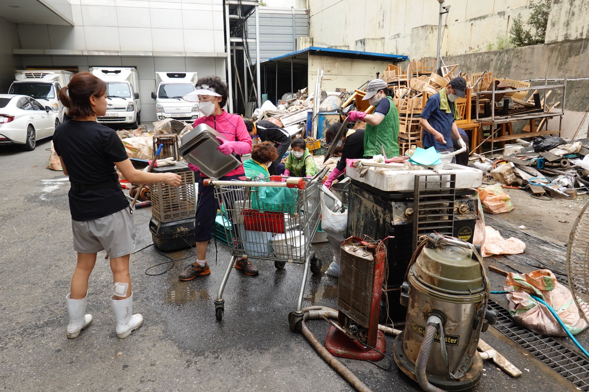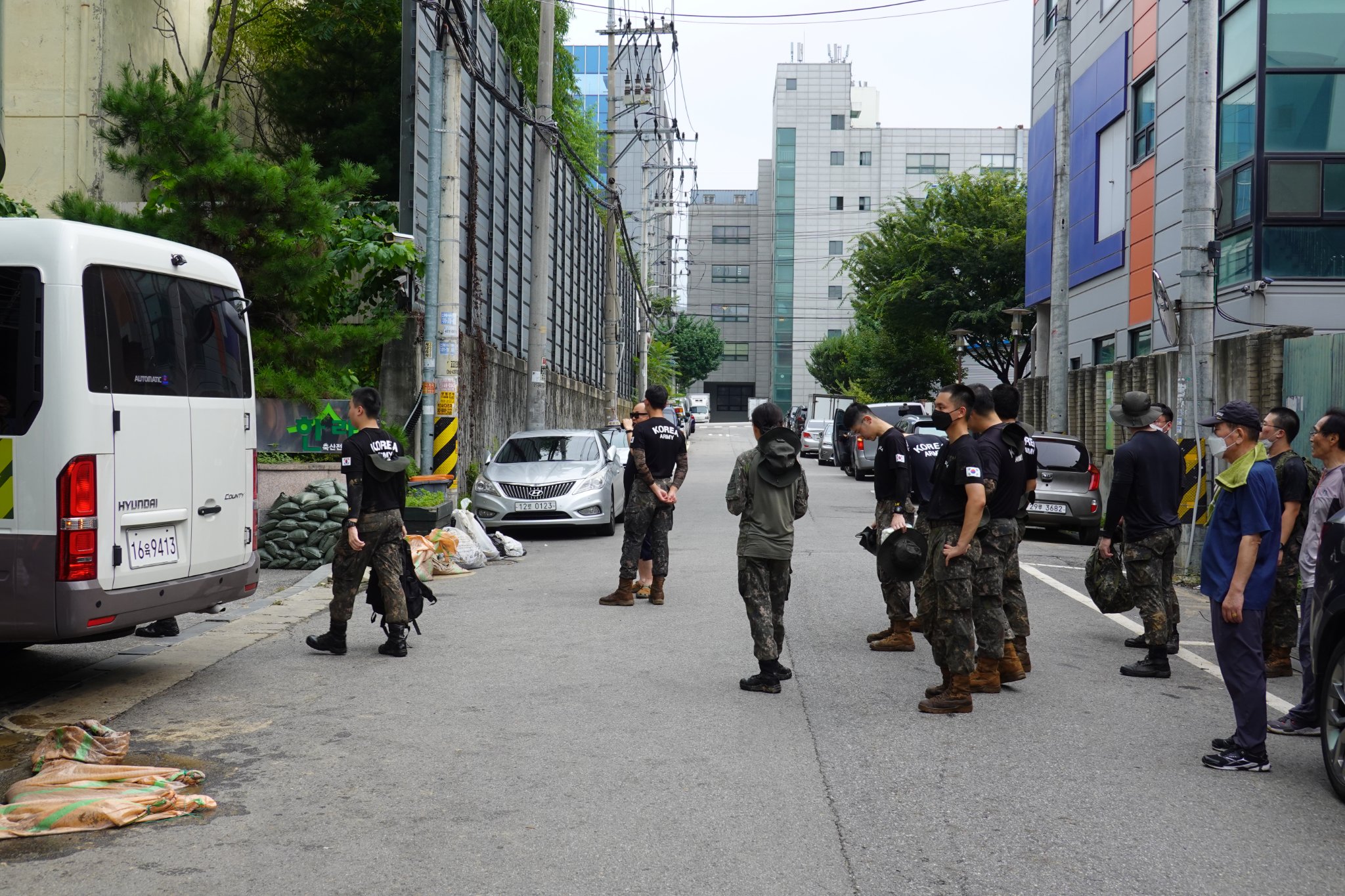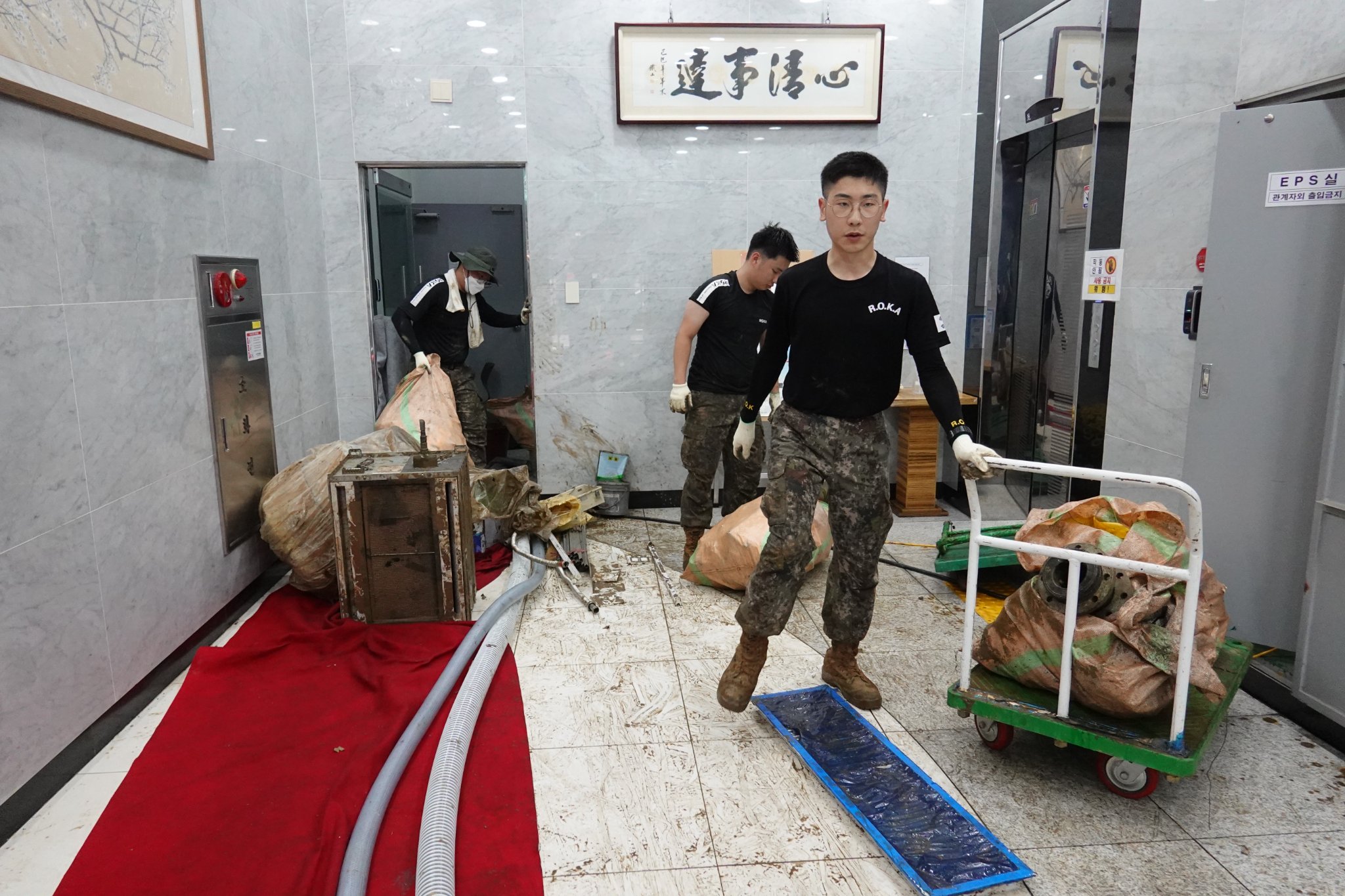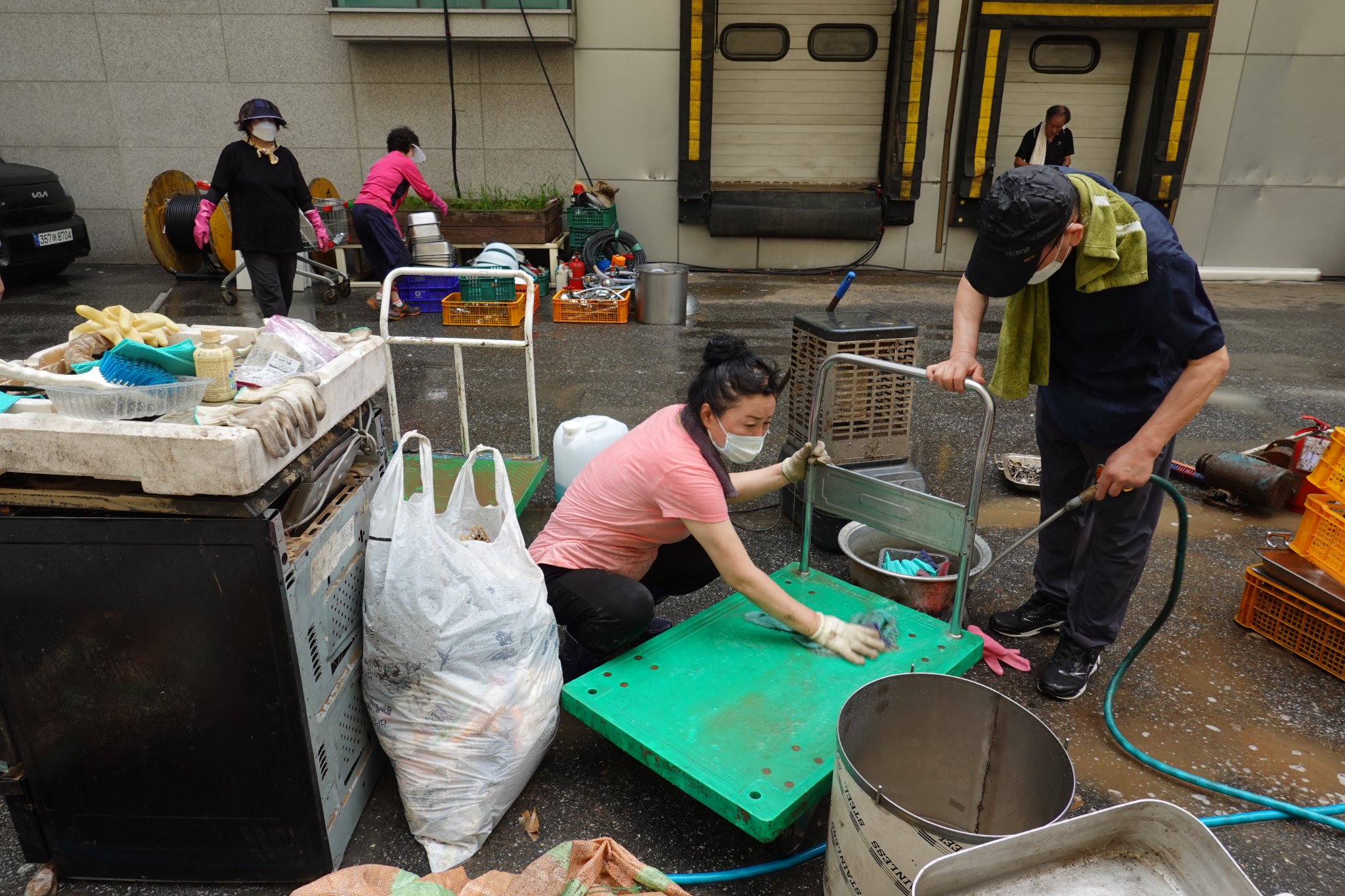 2022.08.14/ #도시기록 #수해 #침수 #한라식품 #안양7동 #복구작업 #수도군단장병 #자원봉사/ 안양군포의왕을 비롯 경기도관내 초중고교 등에 친환경 고기를 납품하는 한라식품(안양7동 소재)의 수해 피해가 심각하다. 한라식품은 집중호우가 쏟아진 지난 8일 밤 회사앞 도로 맨홀에서 역류한 하수가 지하 1.2층으로 들어와 전기배전실과 작업실, 냉동냉장시설, 부설식당 뜰안채 등이 침수돼 수십억대의 피해를 본 것으로 알려졌다. 지난 9일밤 대형발전차 동원에 있어 10일 임시 전기가설과 11일부터 시작된 본격적인 복구 작업에는 수도군단 장병들과 자유총연맹, 안양시걷기협회, 부림동주민자치센터, 안양자원봉사센터 등에서 나온 봉사자들이 15일 현재까지 닷새째 구슬땀을 흘리며 복구작업을 펼쳤다. 또 피해 규모가 워낙 크기에 작업은 16일에도 계속될 예정이다.