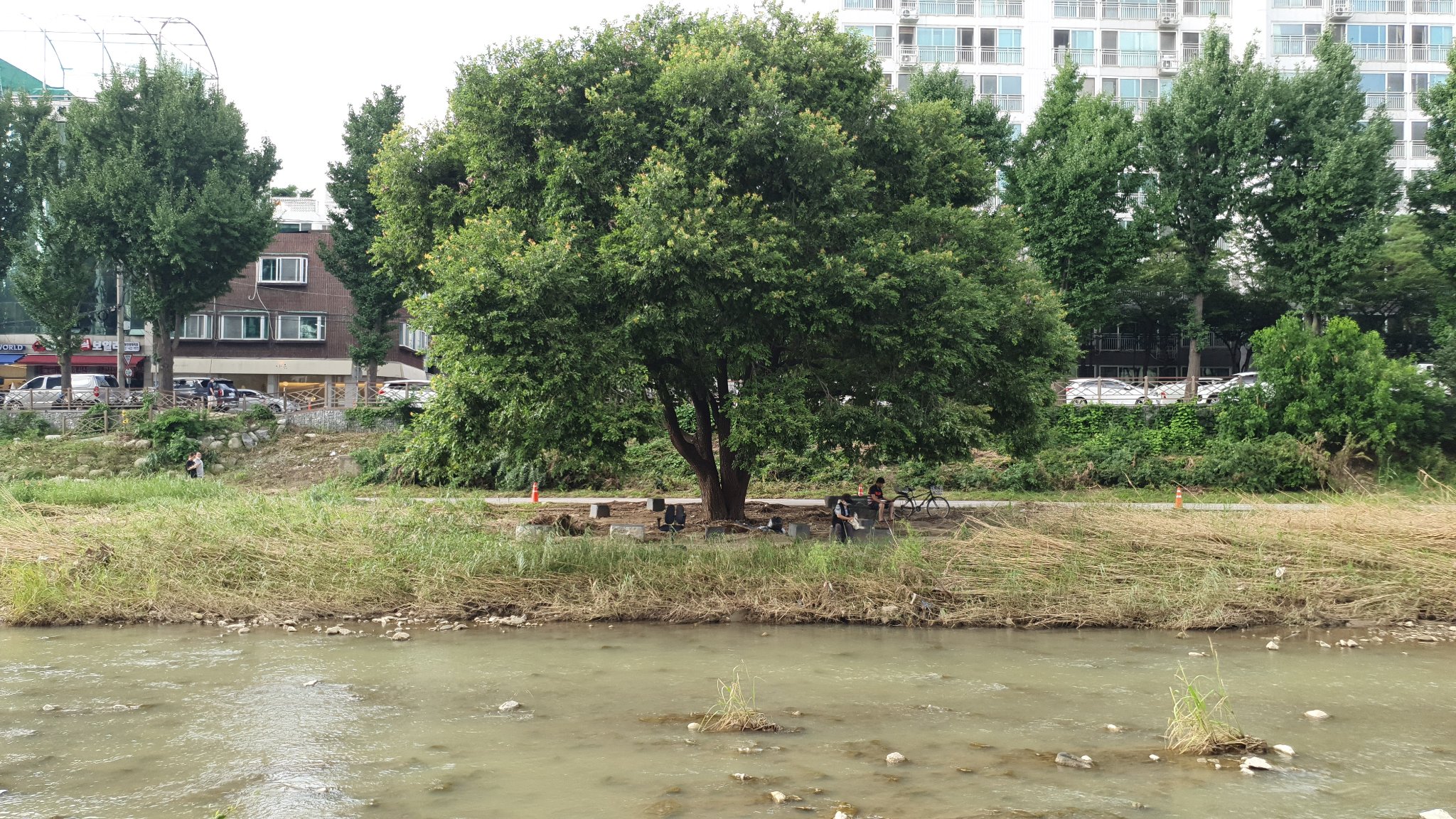 2022.08.21/ #도시기록 #안양 #학의천 #가로수/ 학의천의 명물 왕버드나무 살아남다. 지난 8-9일 수도권지역에 쏟아진 집중호우로 범람위기에 처한 학의천과 안양천에서 많은 나무들이 뽑혀나갔으나 학의천 명물 왕버드나무(대한교와 동안교 중간 놓여진 세월교 옆에서 볼 수 있는 멋진 나무 한그루)가 위험속에서도 굿굿하게 살아남았다. 21일 확인한 결과 왕버드나무 아래 깔린 야자매트 등은 상당부분이 훼손됐으나 와버드나무는 손상이 없이 거센 물살을 잘 견뎌낸것으로 보인다. "살아남아서 고맙다 왕버드나무야"