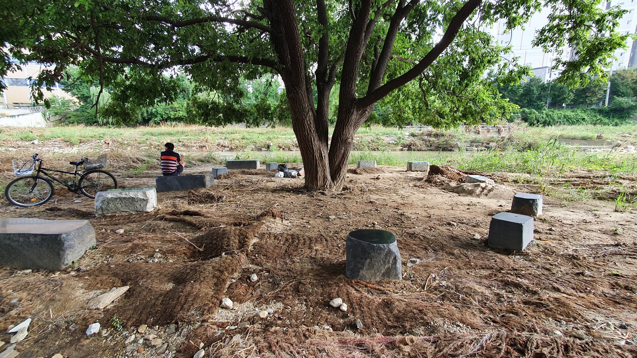 2022.08.21/ #도시기록 #안양 #학의천 #가로수/ 학의천의 명물 왕버드나무 살아남다. 지난 8-9일 수도권지역에 쏟아진 집중호우로 범람위기에 처한 학의천과 안양천에서 많은 나무들이 뽑혀나갔으나 학의천 명물 왕버드나무(대한교와 동안교 중간 놓여진 세월교 옆에서 볼 수 있는 멋진 나무 한그루)가 위험속에서도 굿굿하게 살아남았다. 21일 확인한 결과 왕버드나무 아래 깔린 야자매트 등은 상당부분이 훼손됐으나 와버드나무는 손상이 없이 거센 물살을 잘 견뎌낸것으로 보인다. "살아남아서 고맙다 왕버드나무야"