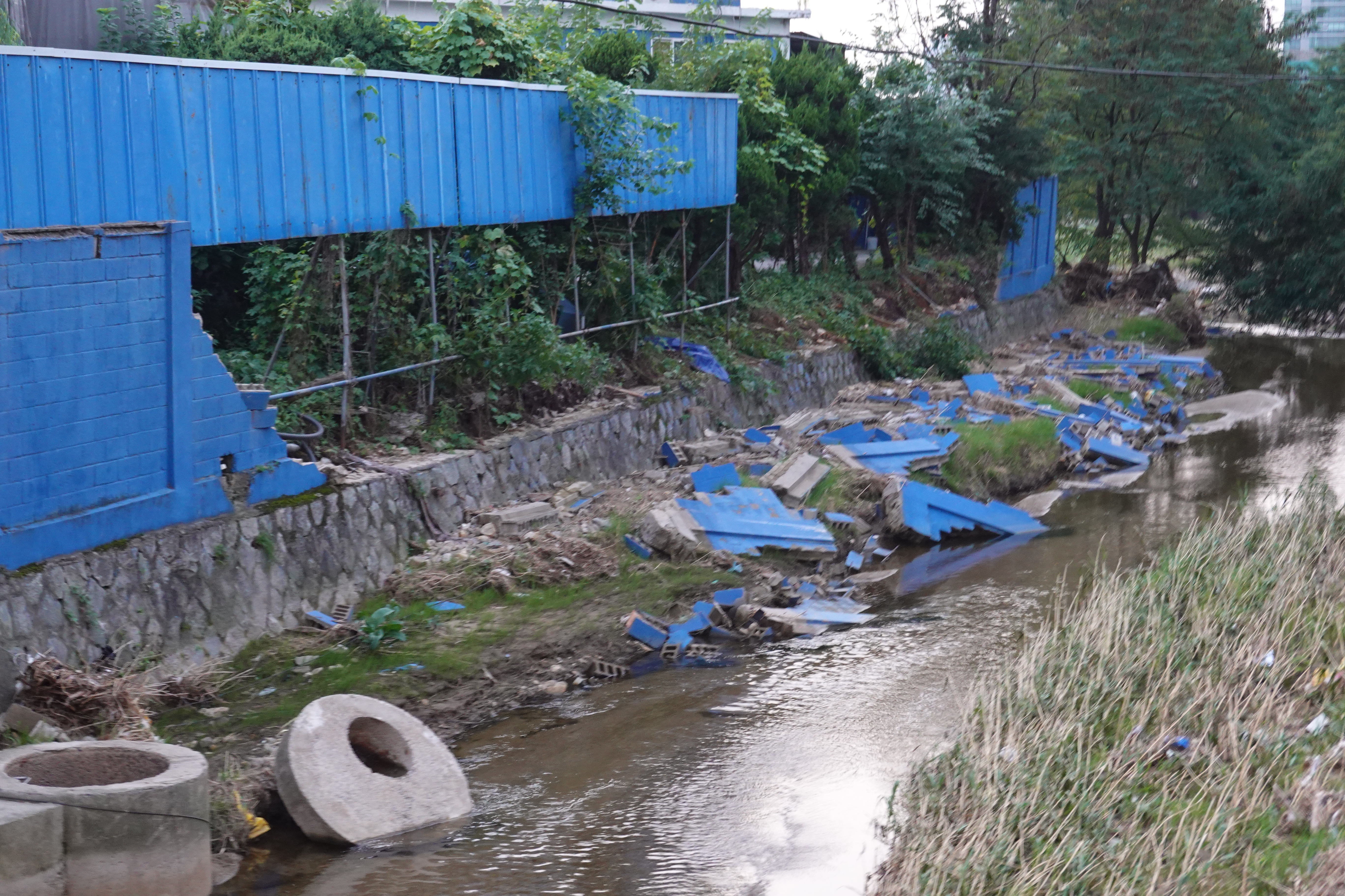 2022.08.21/ #도시기록 #오전천 #안양천 #수해/ 지난 8-9일 수도권에 내린 집중호우로 인한 물살에 오전천과 안양천이 만나는 합류부 지점에 있는 공장(한진화학) 담벼락이 오전천 상류에서 오전천 상류에서 쏟아져 내려오는 거센 물살에 모두 무너졌다. 지난 21일 현장에서 목격한 바에 의하면 오전천 끝자락에 위차한 광명교 다리 아래에는 집중호우 당시의 거센 물살의 흔적을 보여주는 풍경이 펼쳐지고 이 공장은 거센 물살에 콘크리트 블럭 담장 대부분이 유실된 상태다.