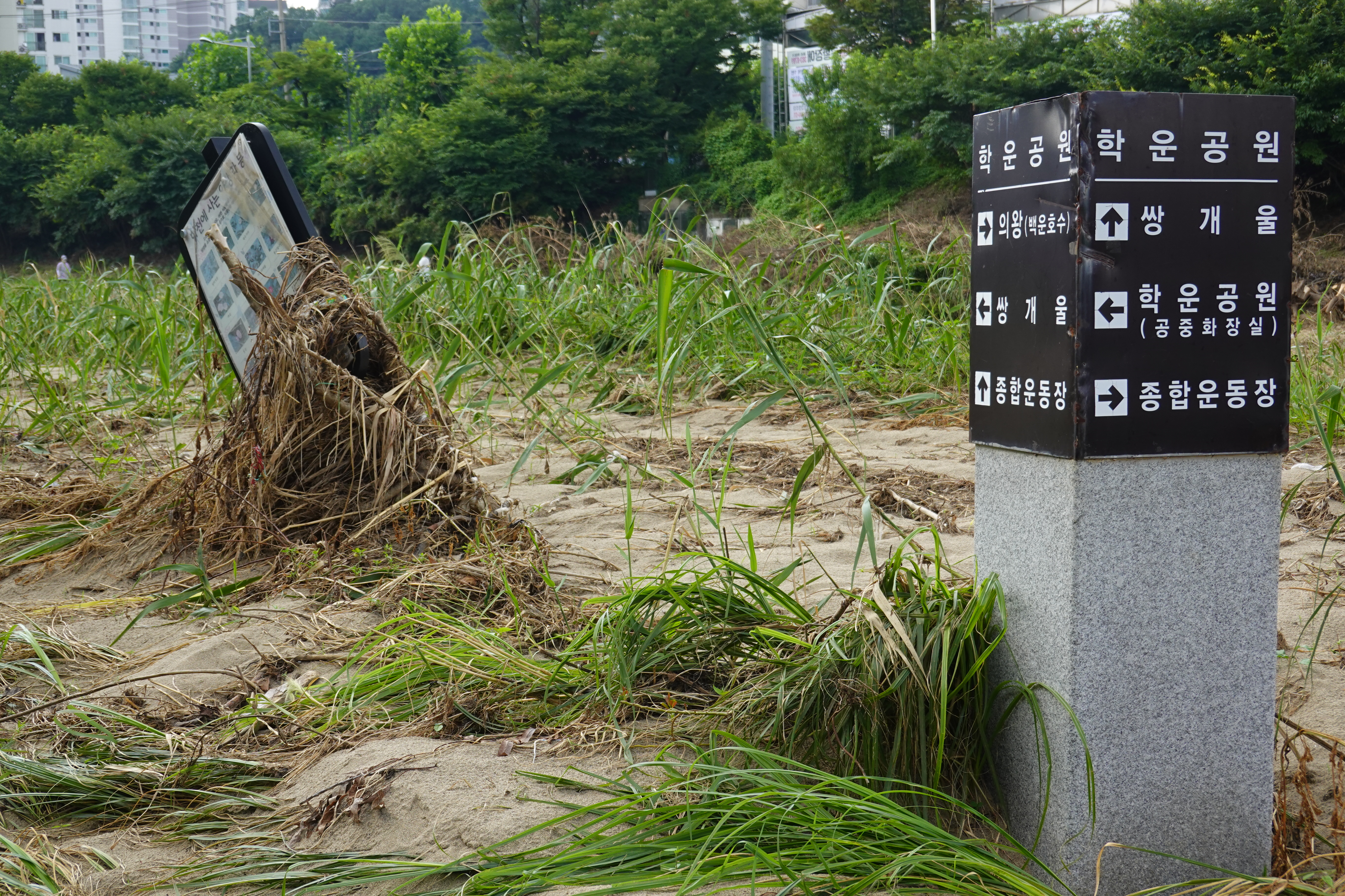 2022.08.21/ #도시기록 #안양 #학의천 #산책길 #흙길 #수해/ 안양 학의천의 수해 이후 현재 모습. 지난 8-9일 수도권에 쏟아진 집중호우로 인한 큰물이 지나간 후의 학의천 모습은 처참하다. 학의천 일부 돌다리는 거센 물살에 무너지고, 방류구 입구 스텐 철판은 뒤틀리고 찟겨지고, 일부 세월교도 파손되는등 피해 상황이 심각하다. 집중호우 이후 간간이 비가 계속 내려 엄두도 못내던 복구작업은 지난주 부터 시작됐지만 산책로 곳곳에는 호우로 떠내려온 나무들과 부유물이 마치 작은언덕처럼 쌓여있어 우선 트럭과 집게차를 동원해 부유물을 치운후에야 자원봉사자와 시민들의 청소와 쓰레기 줍기가가능할것으로 보인다.