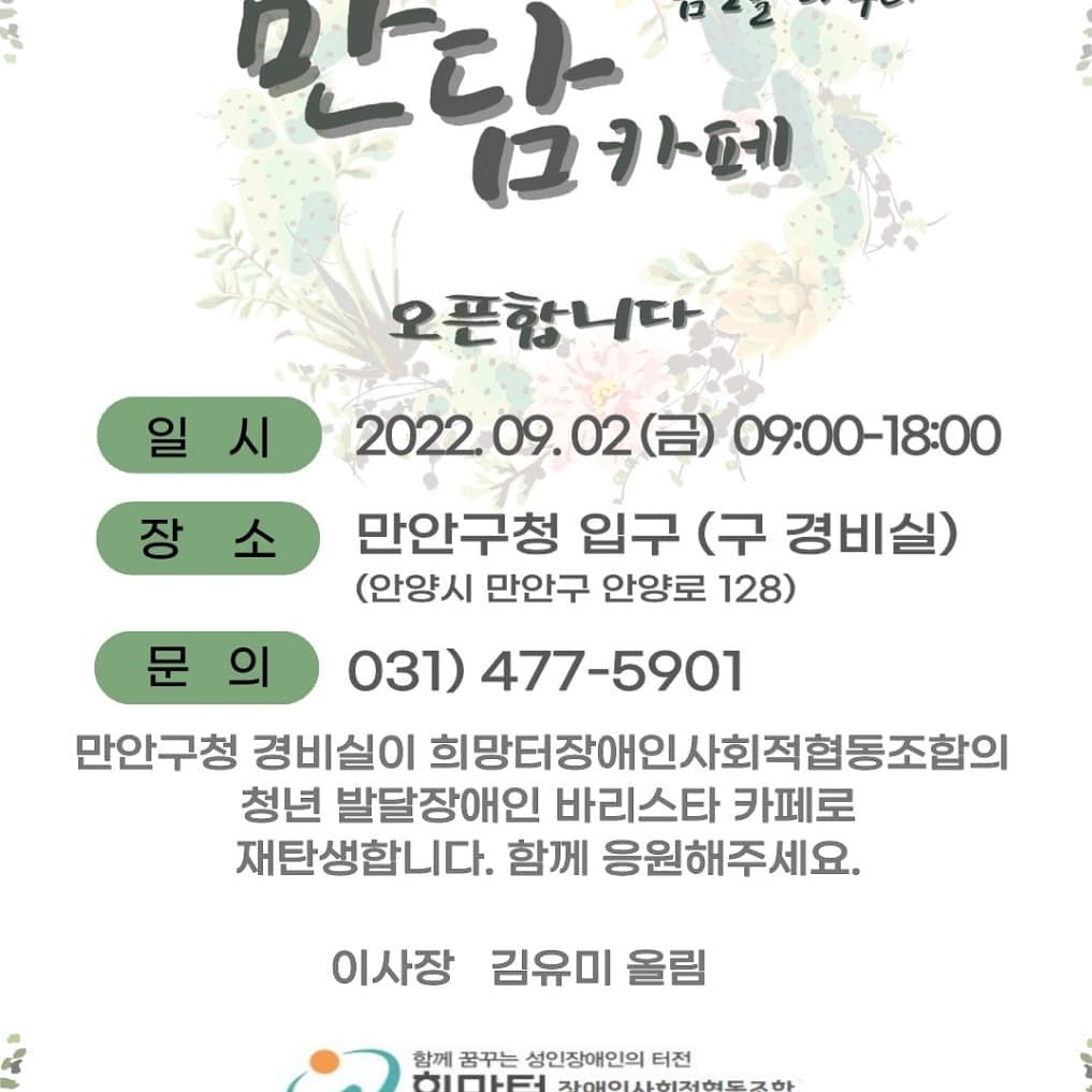 2022.08.24/ #도시기록 #만담카페 #만안구청 #안양/ 만안구청 정문옆 경비실을 리모델링해 만든 커피숍 만담카페가 오는 9월 2일 오픈한다. 희망터장애인협동조합의 청년 발달장애인 바리스타 카페로 운영되는 만담카페는 공간이 협소해 테이크아웃 형태로 운영될 예정으로 실내에는 좌석이 없으나 나무가 우거진 카페앞 구청 정원에 벤치등이 있어 그야말로 도심숲에서 한잔의 커피를 즐길 수 있다. "청년 발달장애인들을 응원합니다"