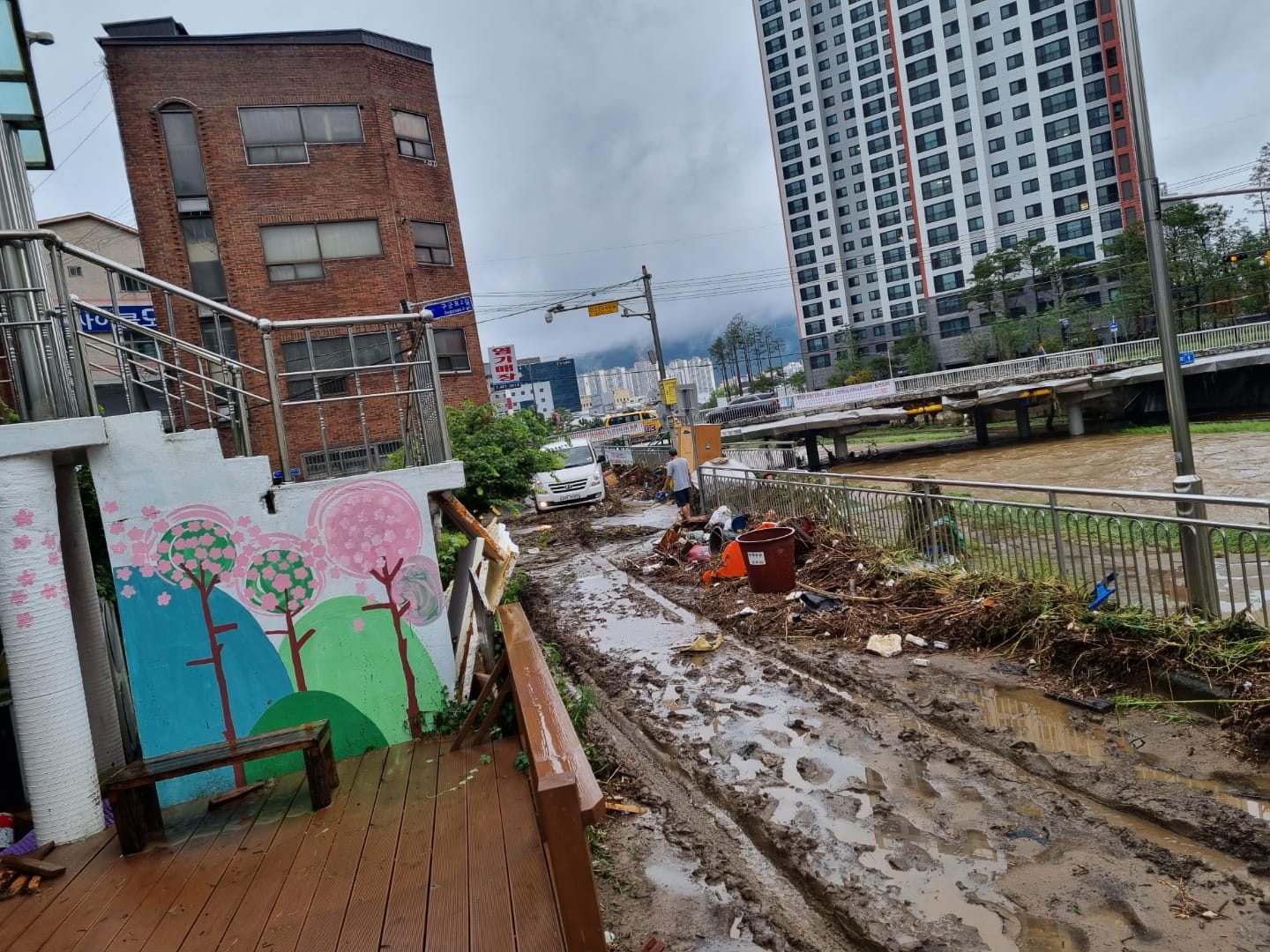 다음날 아침 물이 빠져나간 연습실에는 뻘밭이 되었고 악기들도 진흙탕을 뒤집어쓴 상태라 정말 쳐다보기 어려울만큼 처참했다.