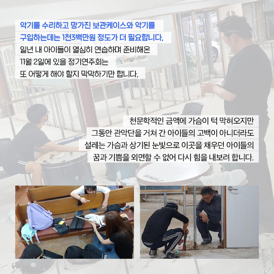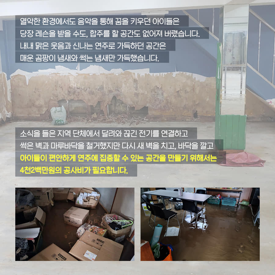 안타까운 소식을 들은 지역단체와 선생님들, 아이들이 모두 모여 며칠동안 악기를 물로 씻어내고 벽과 마루를 철거했지만 아이들이 다시 연주에 집중할 수 있는 공간을 만들기 위해서는 4천2백만원의 내부 공사비와 악기수리 및 구입비 1천3백만원이 필요하다.