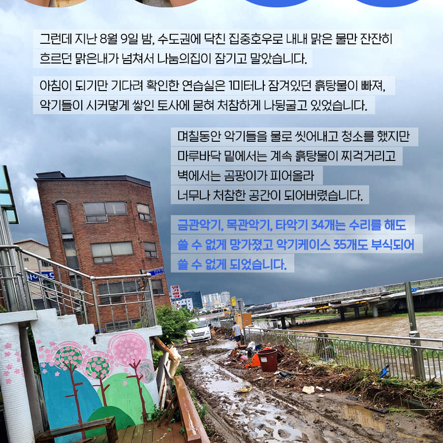 지난 8일 밤 군포 당정동 마벨마을에 위치한 올키즈스트라 관악단 연습실에 순식간에 물이 들이닥쳤다. 그곳은 한무리, 기쁨, 갈릴리지역아동센터 아이들로 구성된 올키즈스트라 안양·군포관악단의 연습실이 있는곳으로 금관 및 목관악기와 타악기들을 보관하고 있었고, 단원들이 악기별 레슨과 합주 연습을 진행하는 곳으로 밤새 차올랐던 흙탕물이 빠진 연습실은 뻘밭으로 변해 악기들이 시커멓게 쌓인 토사에 묻혀 처참하게 나뒹굴고 아이들의 웃음소리와 신나는 음악이 가득했던 공간은 곰팡이와 썩은 냄새가 가득했다.