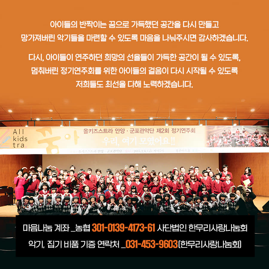 올키즈스트라 안양군포관악단 운영 주체인 ‘한무리사랑나눔회’는 “작은 단체가 감당하기에 천문학적인 금액이지만 설레는 가슴과 상기된 눈빛으로 이곳을 채우던 아이들의 꿈과 기쁨을 외면할 수 없어 다시 힘을 내보려 한다“며 ”아이들이 다시 찬란한 꿈을 연주할 수 있도록 함께 마음을 나눠주시면 감사하겠다“고 도움을 요청했다.