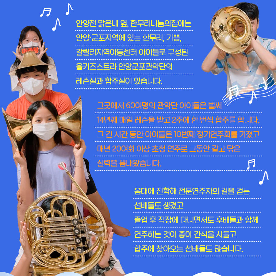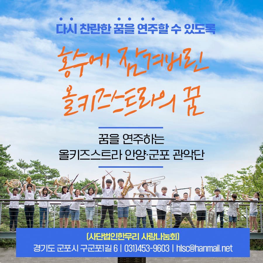 지난달 9일 새벽에 내린 시간당 100mm의 집중호우와 안양천 범람으로 올키즈스트라 안양군포관악단 어린이들과 청소년둘의 꿈이 모두 물에 잠겨 중단되는 위기에 처해 각계각층의 관심과 지원이 요구된다.