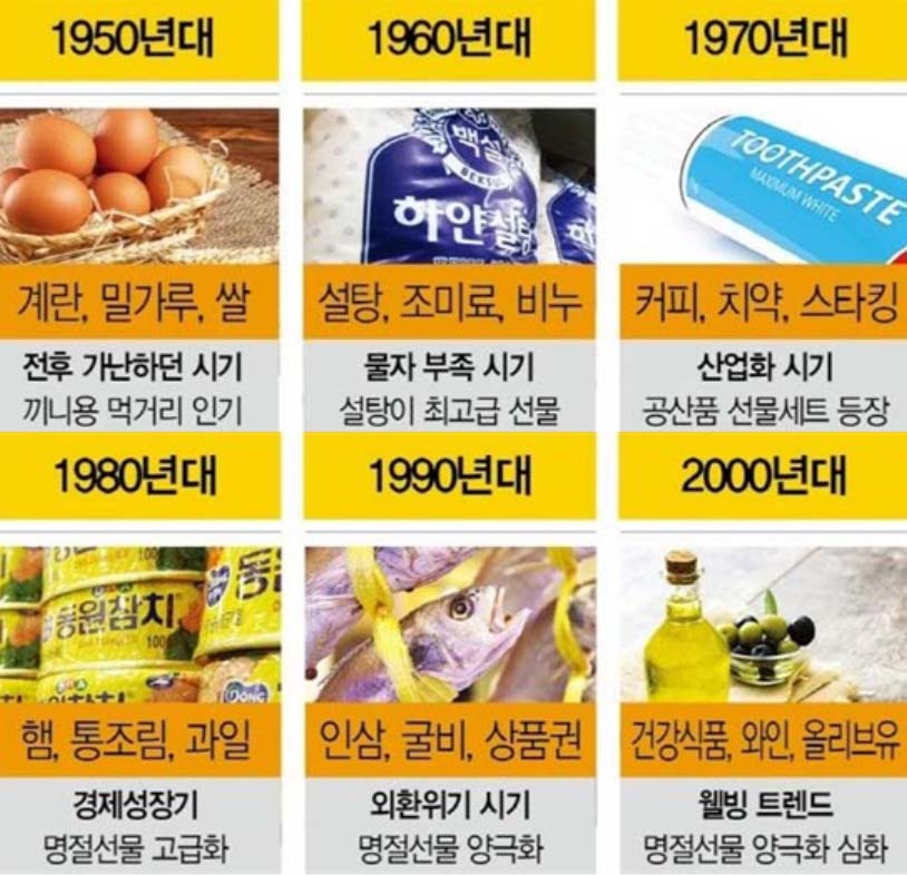 명절 선물은 그 시대의 경제 상황과 사회적 분위기, 유행 등에 따라 달라지곤 했습니다. 그렇다면 1950년대부터 지금까지 명절 선물은 어떻게 달라져 왔을까요?