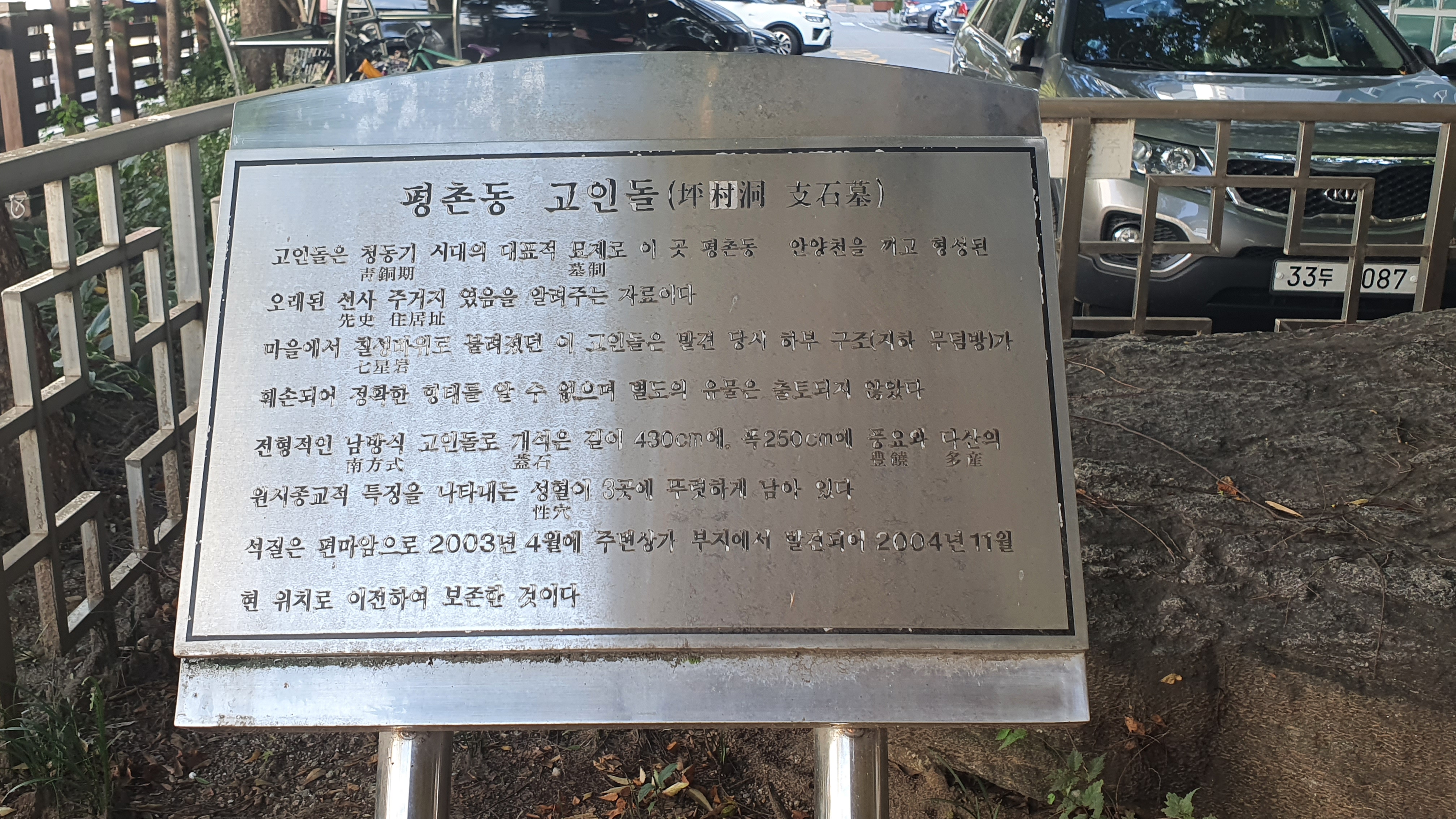 2022.09.19./ #도시기록 #고인돌 #지석묘 #안양 #인덕원 #대림2차아파트/ 안양 인덕원의 한 아파트 단지에는 고대 선사시대의 유적인 고인돌(지석묘)이 있어 그곳을 찾아보았다. 지석묘는 청동기시대의 대표적인 무덤으로 고인돌이라고도 부르며, 주로 경제력이 있거나 정치권력을 가진 지배층의 무덤으로 알려져 있다.우리나라의 고인돌은 4개의 받침돌을 세워 지상에 돌방을 만들고 그 위에 거대하고 평평한 덮개돌을 올려놓은 탁자식과, 땅속에 돌방을 만들고 작은 받침돌을 세운 뒤 그 위에 덮개돌을 올린 바둑판식으로 구분된다. 기록을 찾아보니 평촌신도시를 개발하기 전에 이 일대에서 발굴된 고인돌은 13기로 그가운데 일부는 경기도에서 건립중인 도립박물관의 전시용 유물로 옮겨 가고, 귀인마을 지석묘는 명지대학교로 이전 복원되었으며, 5기는 자유공원에 옮겨져 야외 전시되는 등 뿔뿔이 흩어졌다. 특히 1기가 안양시 평촌동 101번지 인덕원대림2차아파트 상가 104호옆 정원 한귀퉁이에 자리하고 있다. 이곳의 고인돌은 청동기시대의 대표적인 묘제(墓制)로 이곳 평촌이 안양천을 끼고 형성된 오래된 선사(先史) 주거지(住居址)였음을 알려 주는 자료이다. 마을에서 칠성바위(七星岩)으로 불려왔던 이 고인돌은 발굴당시 하부구조(지하무덤방)가 훼손되어 정확한 형태를 알 수 없으며 별도의 유물은 출토되지 않았다. 전형적인 남방식 고인돌로 개석(蓋石)은 길이 430㎝에 폭 250㎝에 풍요(豊饒)와 다산(多産)의 원시 종교적 특징을 나타내는 성혈(性穴)이 3곳 뚜렷하게 남아 있다. 석질은 편마암으로 2003년 4월에 (인덕원대림2차아파트)주변 상가에서 발견되어 2004년 11월 현위치로 이전하여 보전중이다. 한편 기록에 의하면 평촌신도시를 개발하기 전에 이 일대에서 발굴된 고인돌은 모두 13기다. 이것들은 평촌산(坪村山) 동북쪽 논에서 발견된 6기, 신촌(新村)마을 입구의 구릉 정상부의 5기, 평촌산 남서쪽 기슭의 1기, 귀인(貴仁)마을 안쪽 구릉의 1기이다. 그리고 귀인마을에서 조사된 백제시대로 추정되는 주거지(住居址) 유적이 있다. 아쉬운 것은 유적들을 현장에 복원하여 보호하지 못하고, 지석묘 중 일부는 경기도에서 건립중인 도립박물관의 전시용 유물로 옮겨 가고, 귀인마을 지석묘는 명지대학교로 이전 복원되었으며, 신촌마을 지석묘는 평촌신도시내의 자유공원에 복원되도록 결정되어 지석묘와 그 유구(遺構)의 원형이 훼손되었다는 점이다.