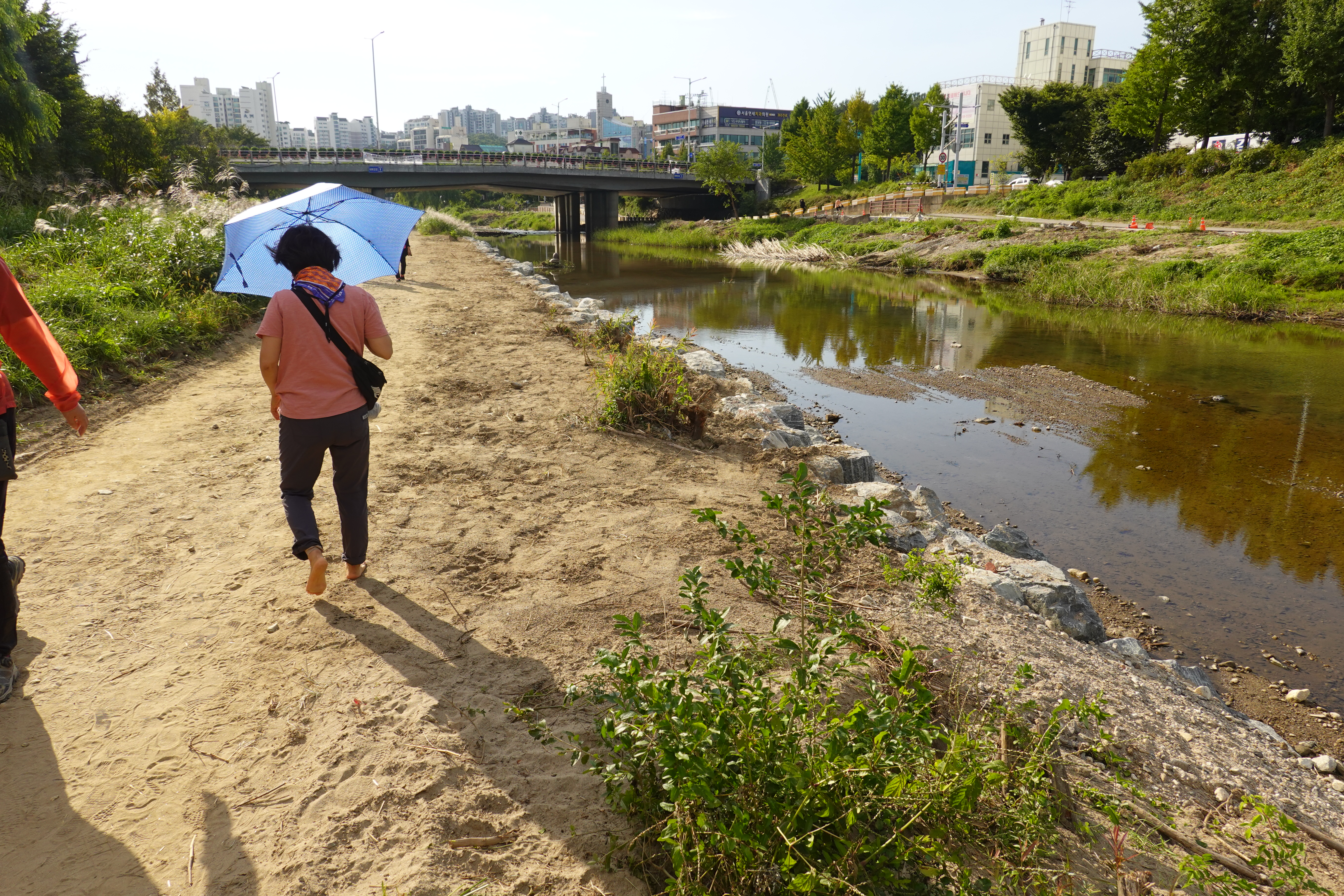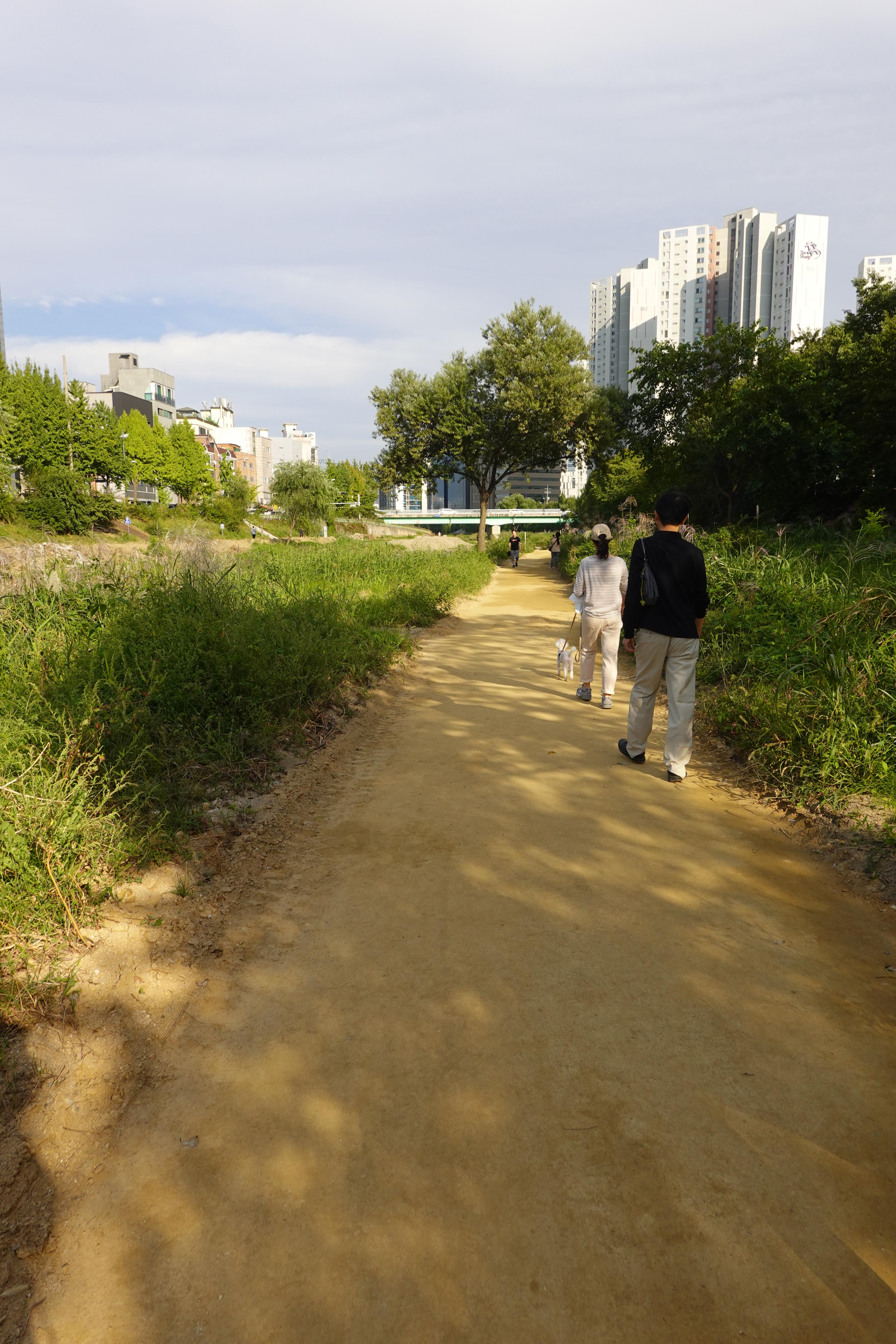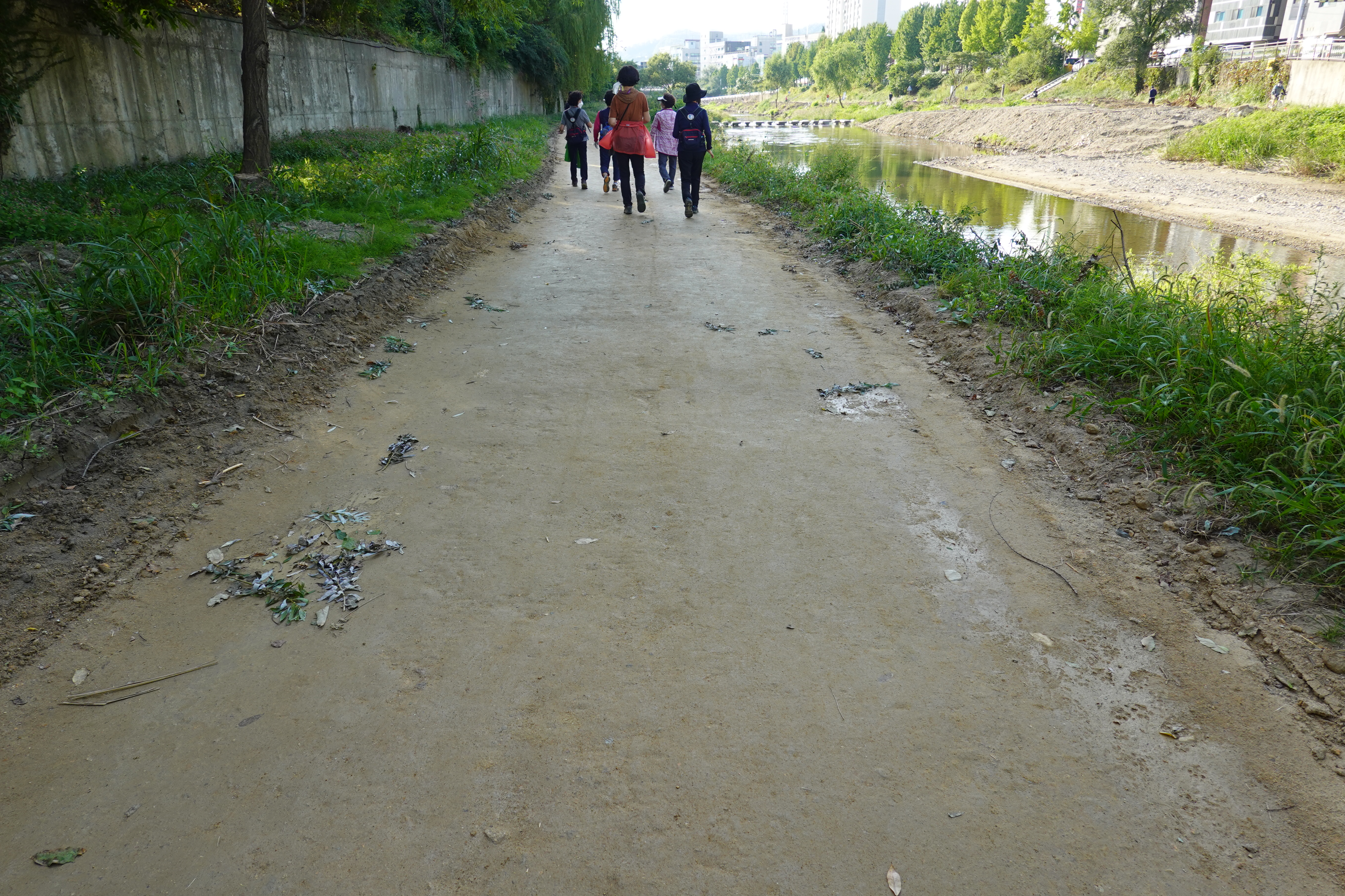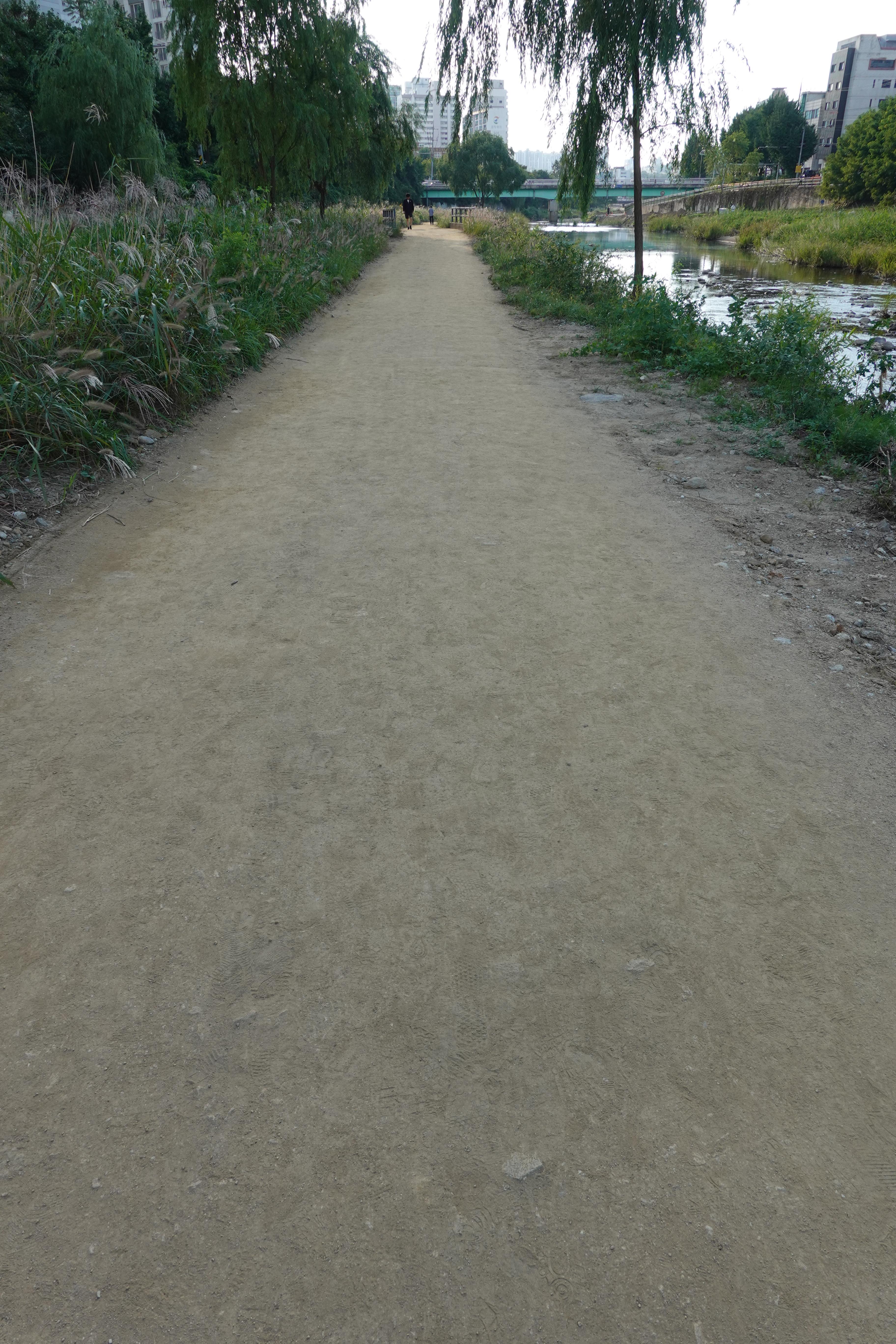 2022.09.25/ #도시기록 #안양 #학의천 #흙길 #수해복구/ 지난 8월집중호우와 하천 범람으로 돌과 자갈밭으로 변했던 학의천 남단 흙길이 복구작업을 통해 일부는 황토, 일부는 잔 모래가 쫘악 깔린 걷기 좋은길로 변했네요. 걷기 좋아지니 운동하거나 산보 나온 시민들은 물론 맨발로 흙길을 걷는 사람들도 적지않게 보인다. 빠른 복구에 애써준 안양시 생태하천과 관계자 모두에게 감사드립니다.