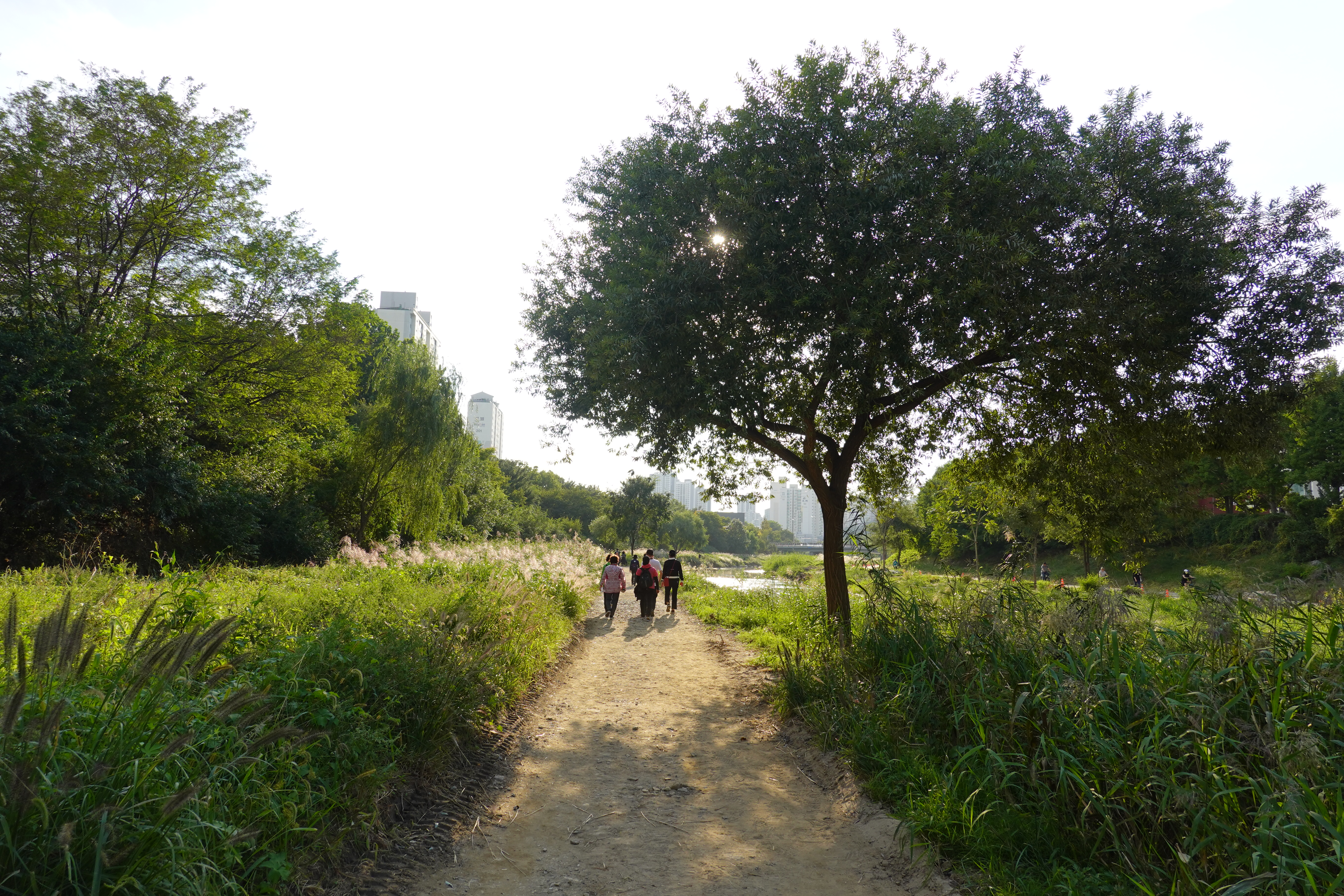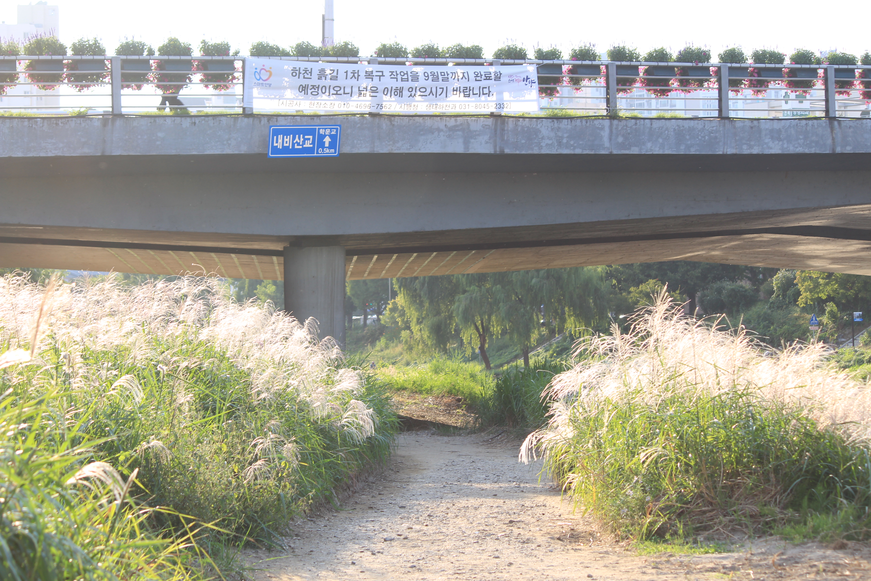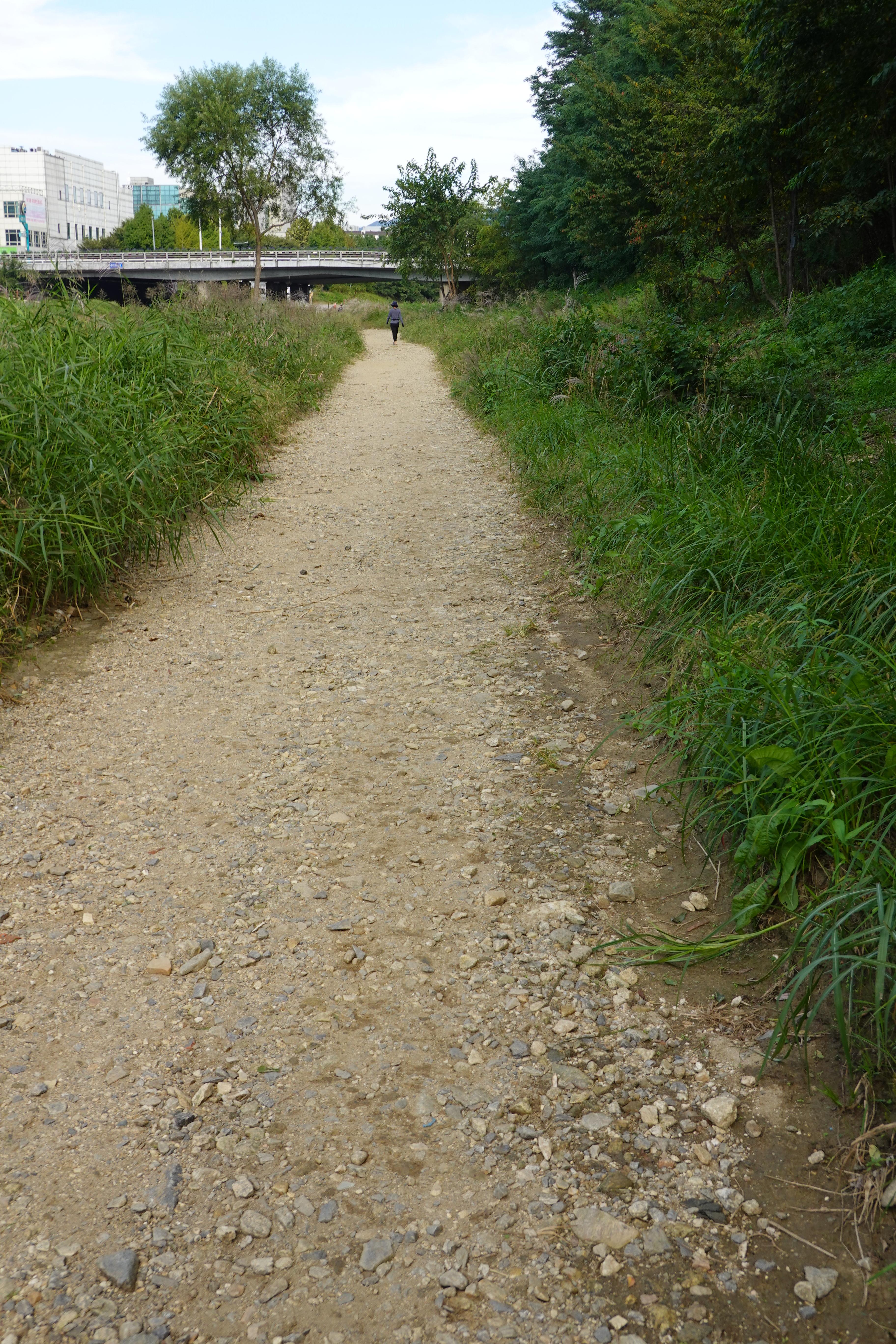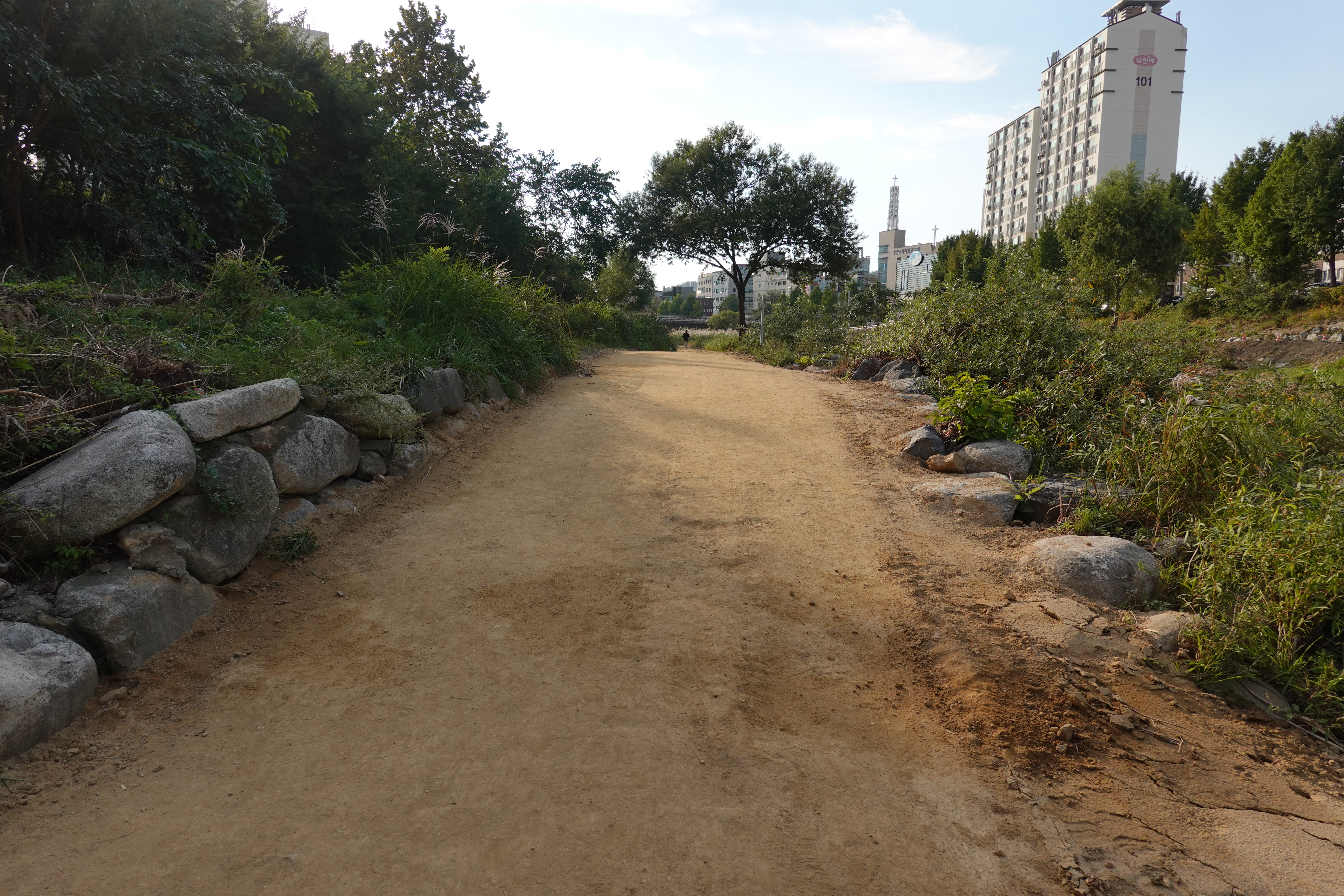 2022.09.25/ #도시기록 #안양 #학의천 #흙길 #수해복구/ 지난 8월집중호우와 하천 범람으로 돌과 자갈밭으로 변했던 학의천 남단 흙길이 복구작업을 통해 일부는 황토, 일부는 잔 모래가 쫘악 깔린 걷기 좋은길로 변했네요. 걷기 좋아지니 운동하거나 산보 나온 시민들은 물론 맨발로 흙길을 걷는 사람들도 적지않게 보인다. 빠른 복구에 애써준 안양시 생태하천과 관계자 모두에게 감사드립니다.