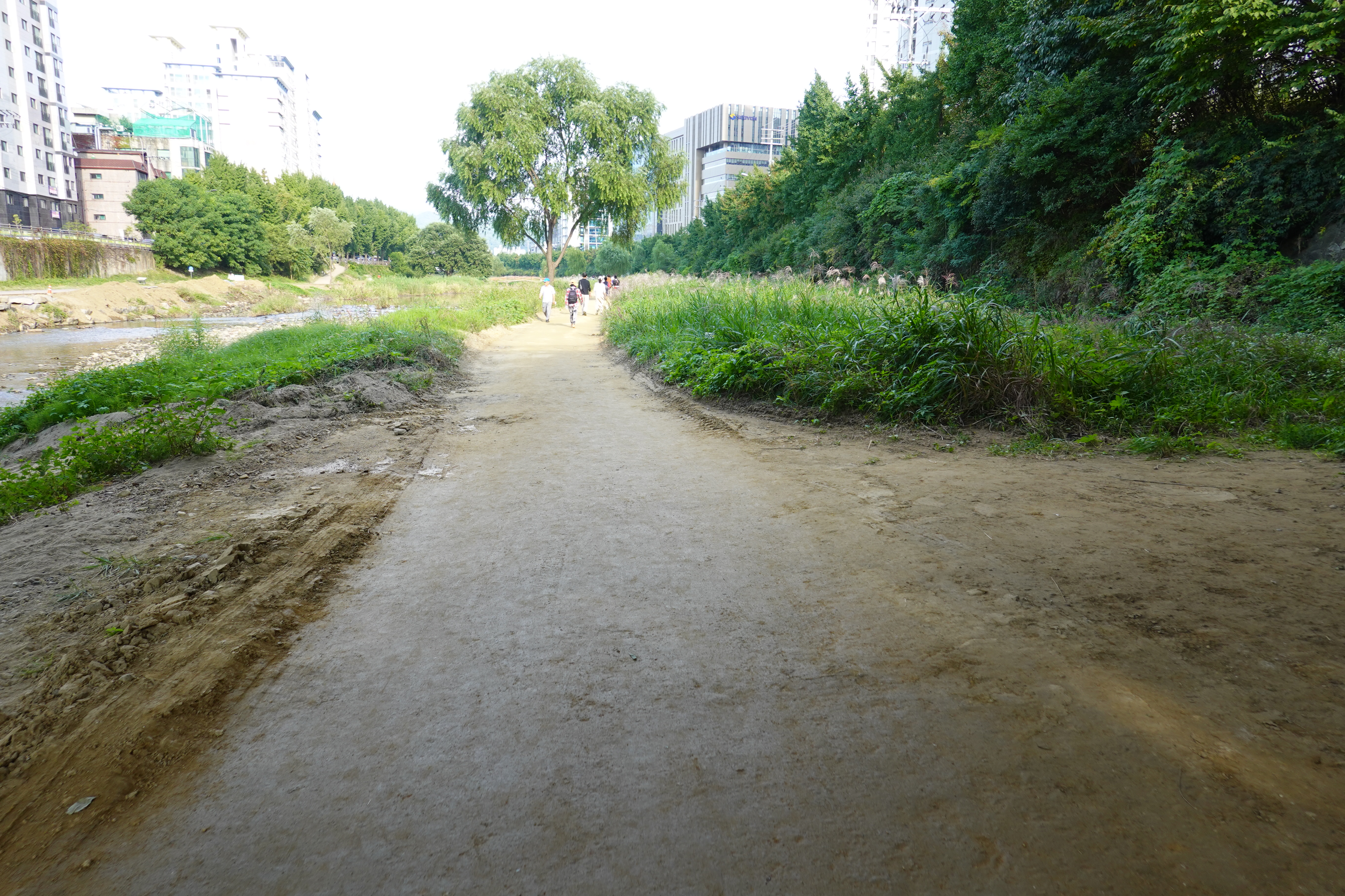 2022.09.25/ #도시기록 #안양 #학의천 #흙길 #수해복구/ 지난 8월집중호우와 하천 범람으로 돌과 자갈밭으로 변했던 학의천 남단 흙길이 복구작업을 통해 일부는 황토, 일부는 잔 모래가 쫘악 깔린 걷기 좋은길로 변했네요. 걷기 좋아지니 운동하거나 산보 나온 시민들은 물론 맨발로 흙길을 걷는 사람들도 적지않게 보인다. 빠른 복구에 애써준 안양시 생태하천과 관계자 모두에게 감사드립니다.