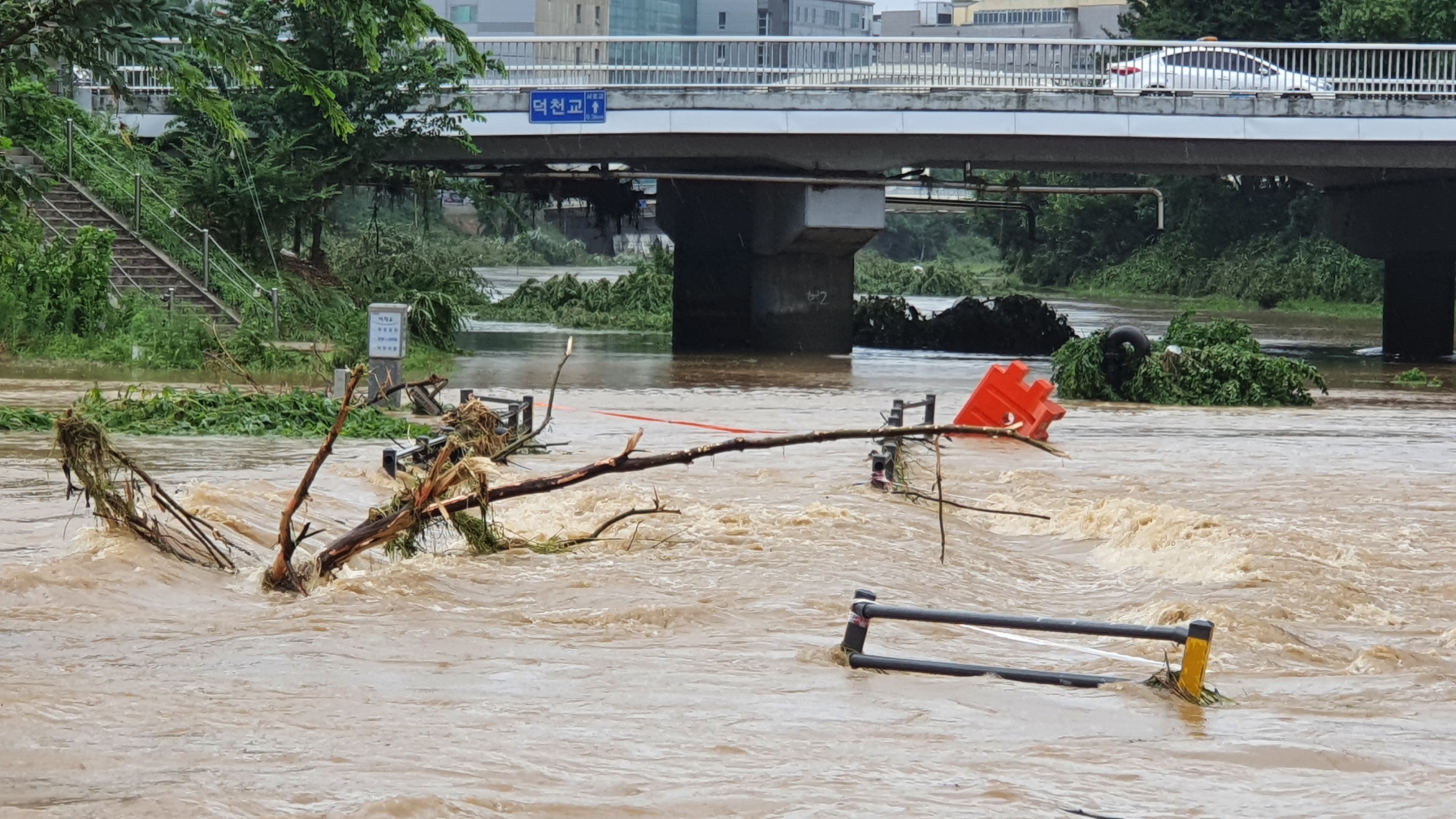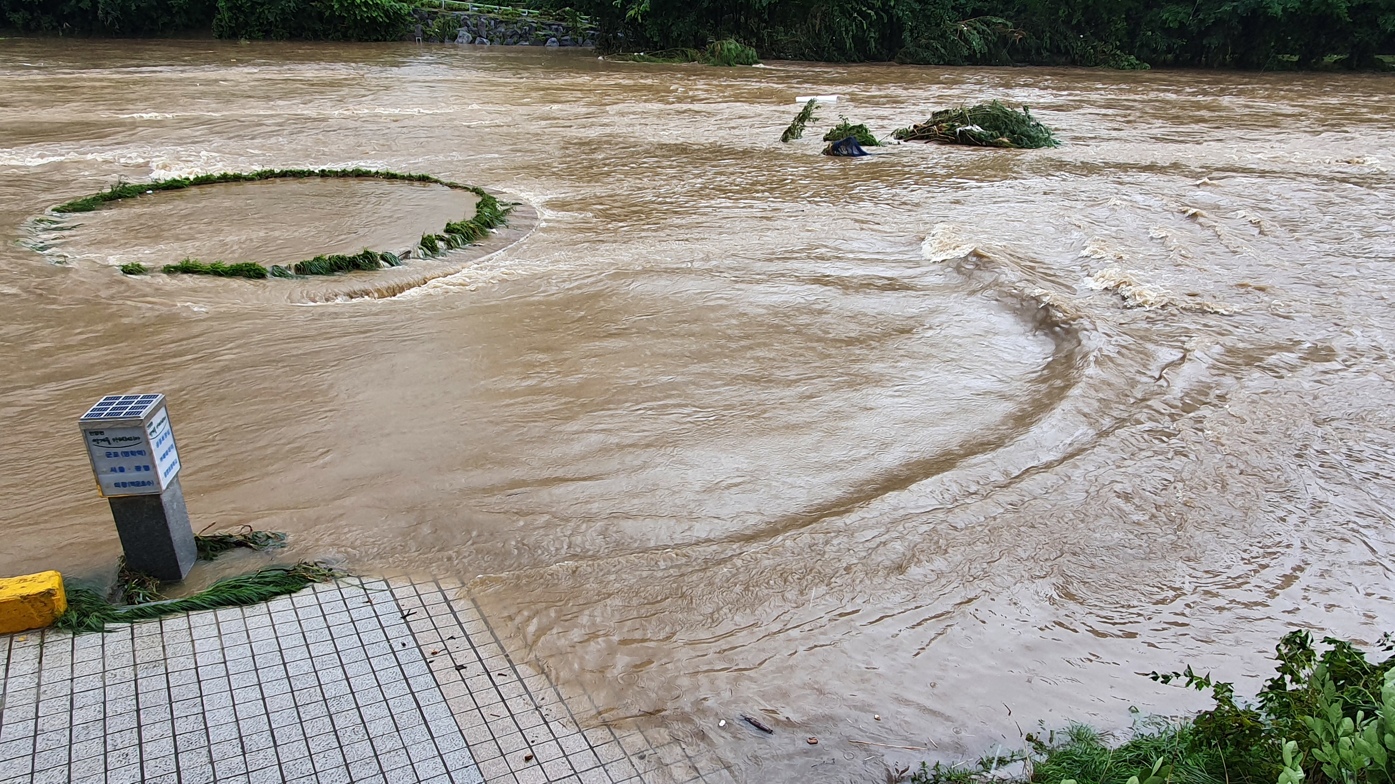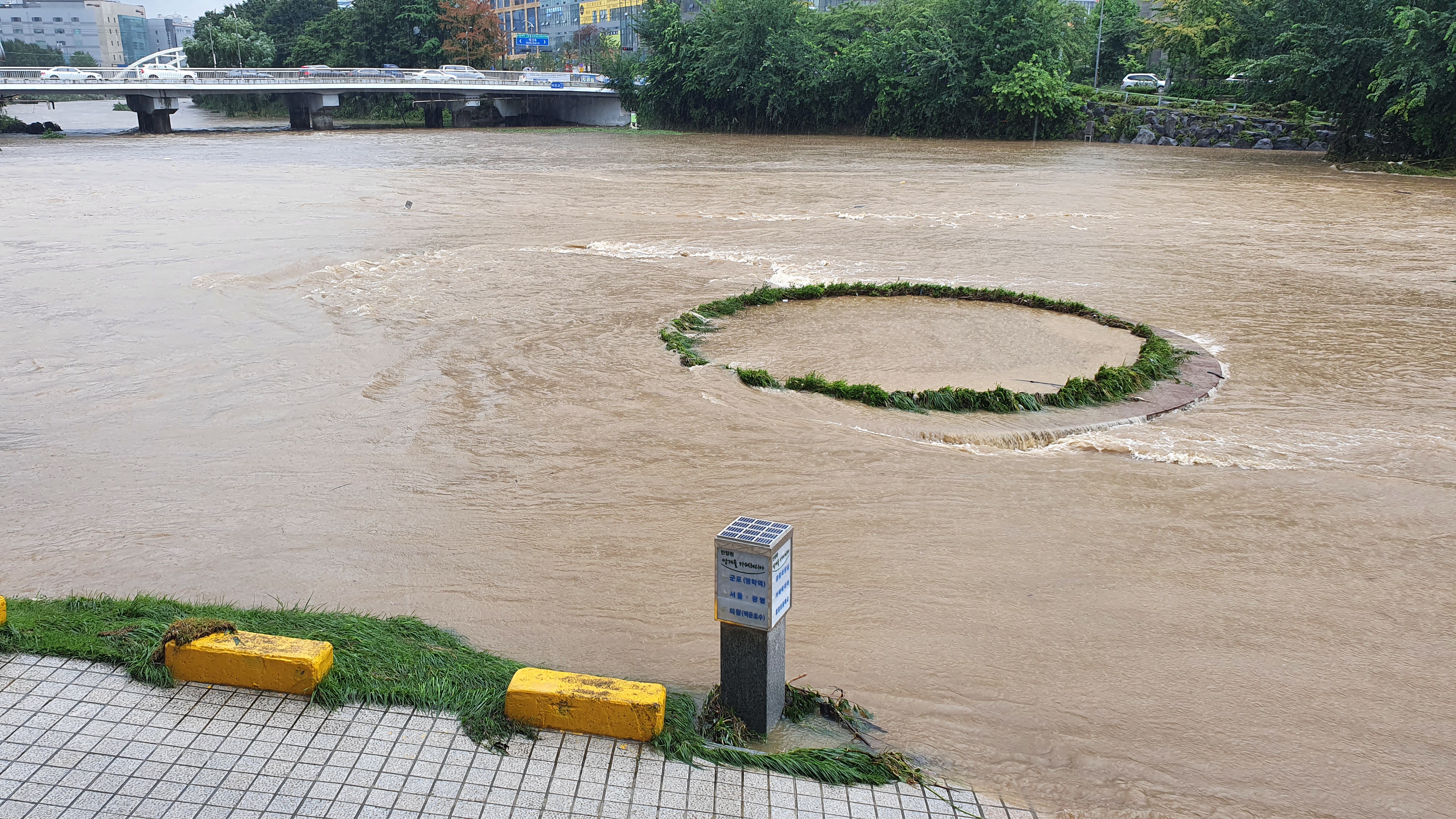 쌍개울 야외공연장이 모두 물에 잠기고 왼쪽 매점 아래 원형 쉼터 나무 데크까지 차오른 상태다. 9일 새벽녘 안양천의 최고 수위는 사진속 공연장 지붕 아래 쇠기둥까지 물에 잠기고 매점 입구까지 물이 찰랑찰랑했었다. 안양시 안양천생태이야기관 자료를 보면 1977년 안양대호수 당시 7월 8일경 안양천이 범람해 208명이 사망하고 49명이 실종되었다. 당시 24시간 강우량은 454.5mm이었으며 시간당 최대 강우량은 99.5mm였다. 이번 2022년 8월 군포,안양.의왕지역 집중호우의 강우량은 8일 00시부터 10일 07시까지 31시간 동안 431.5mm였으며 특히 시간당 최대 강우량은 100mm를 기록해 안양대홍수 당시 최대 강우량을 넘어섰음에도 인명피해가 없었던 것은 천만다행이다.