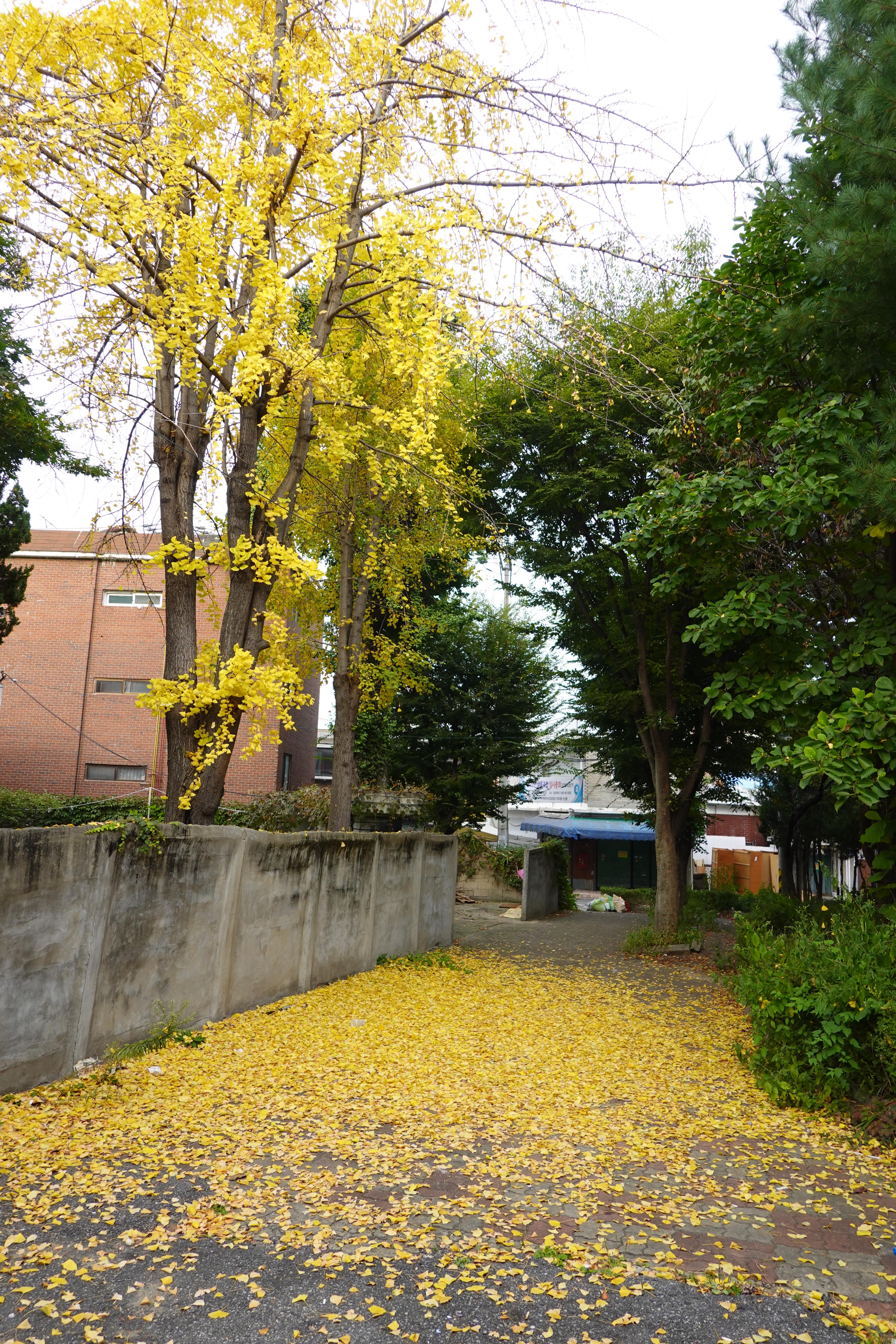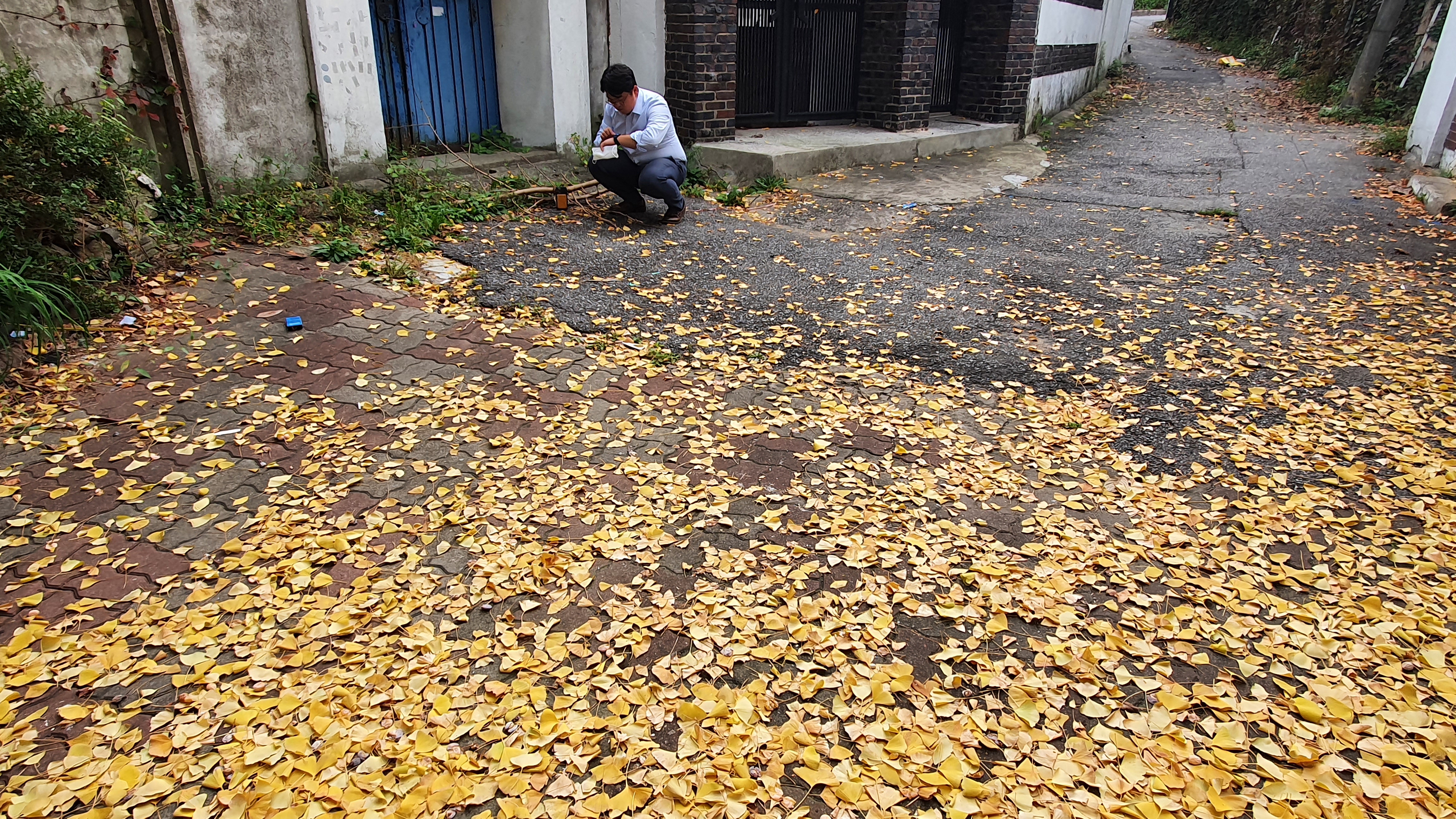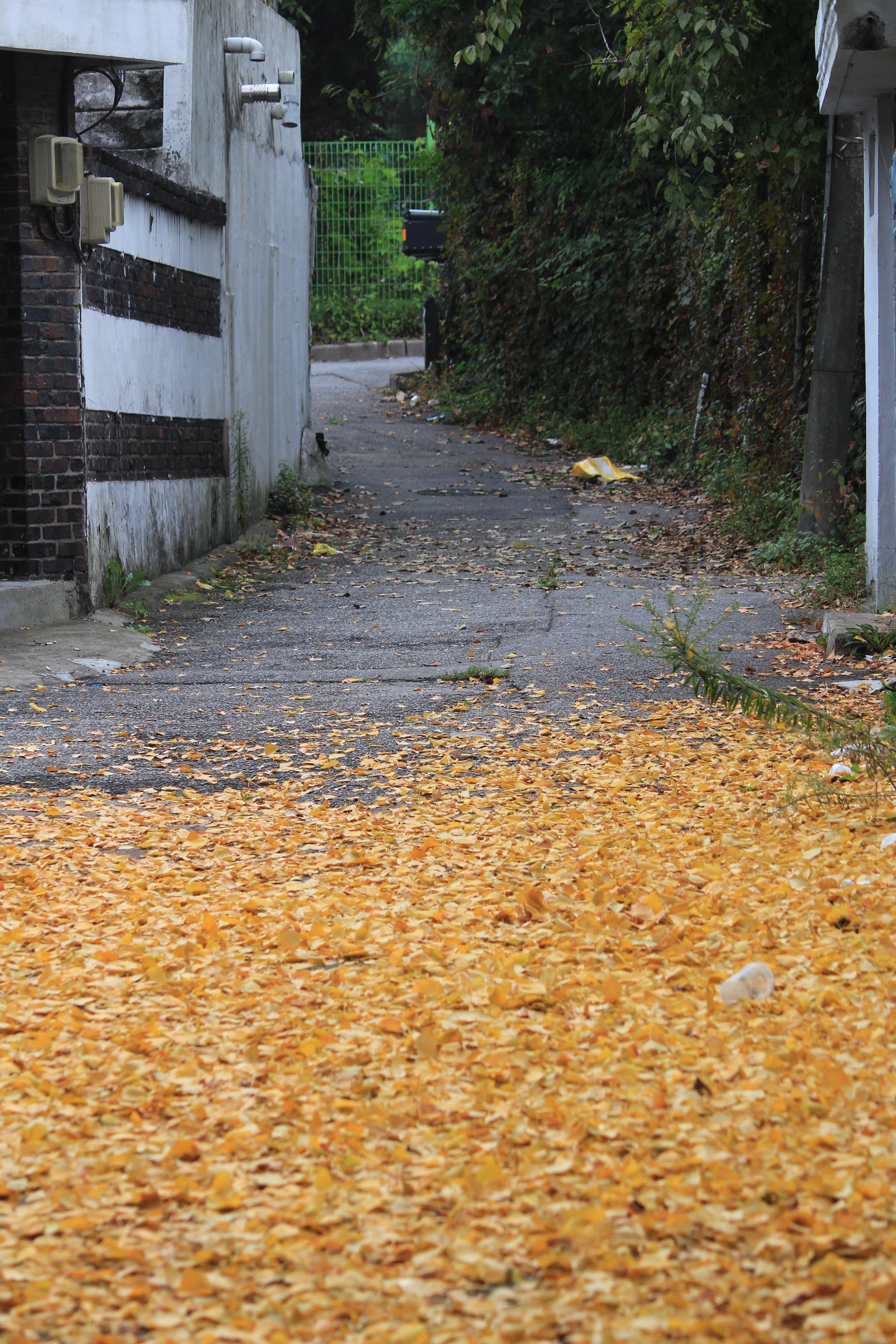 2022.10.01/ #도시기록 #동네 #골목 #상록마을/ 안양기억찾기탐사대 209차 탐사 여정으로 다시 찾아간 안양8동 상록마을. 재개발 추진으로 주민들 대부분이 이사를 했다. 마을에서 가장 좁은 골목과 함께 무성한 나무들로 마치 화원같이 예뻤던 성결대학로 45번길 골목앞 주택 담장안 은행나무. 정든집이 없어지는 것을 슬퍼하기라도 하듯 은행잎을 일찌감치 떨구어 집앞 골목이 마치 노란 융탄자를 깔아놓은듯 하다.