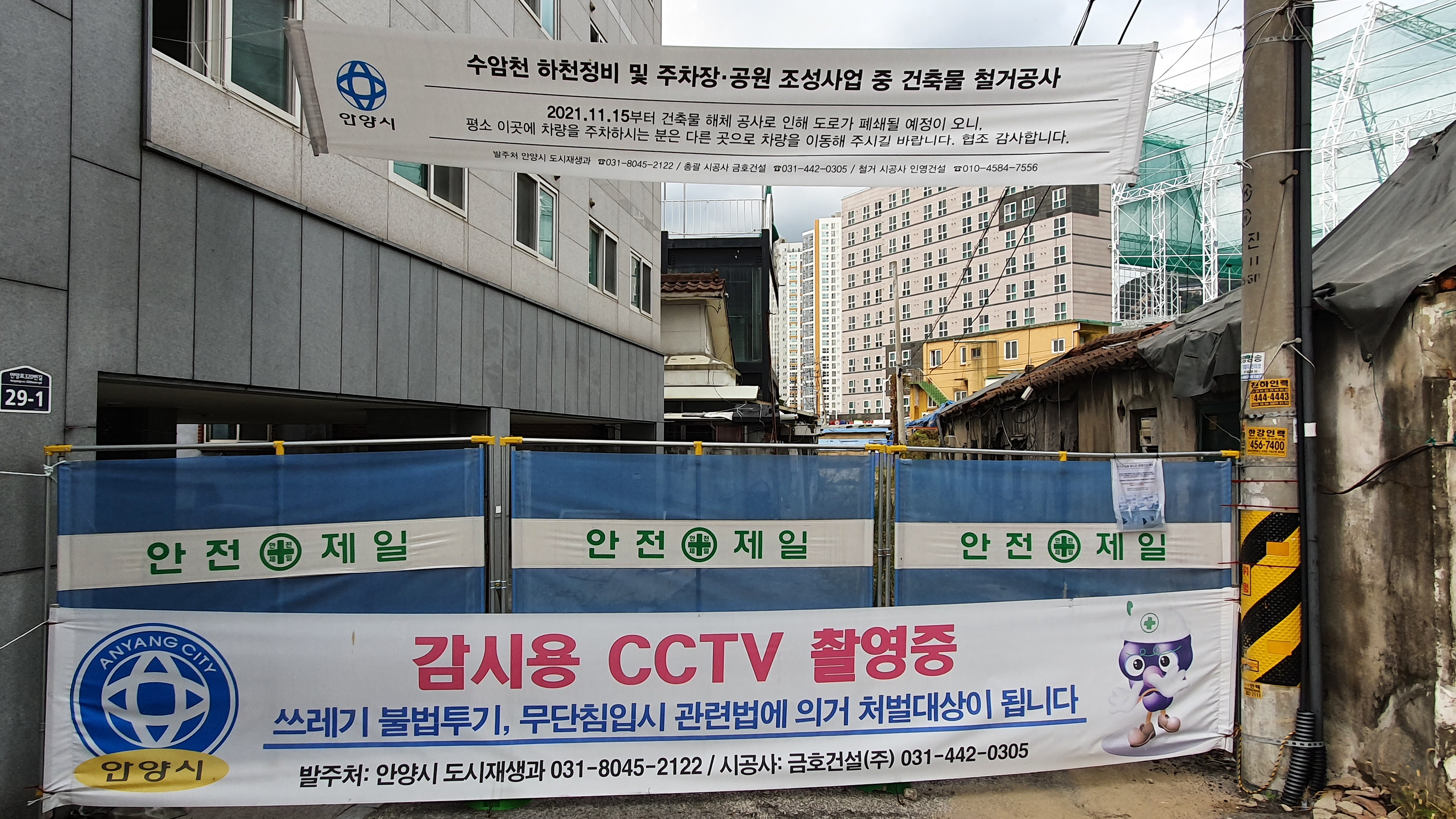 안양시 만안구 안양1동 양지4교~양지5교 구간의 수암천 복개구간 복원 및 수암천 지하저수조 설치 공사를 위해 건물들을 매입해 철거한다는 계획이다.