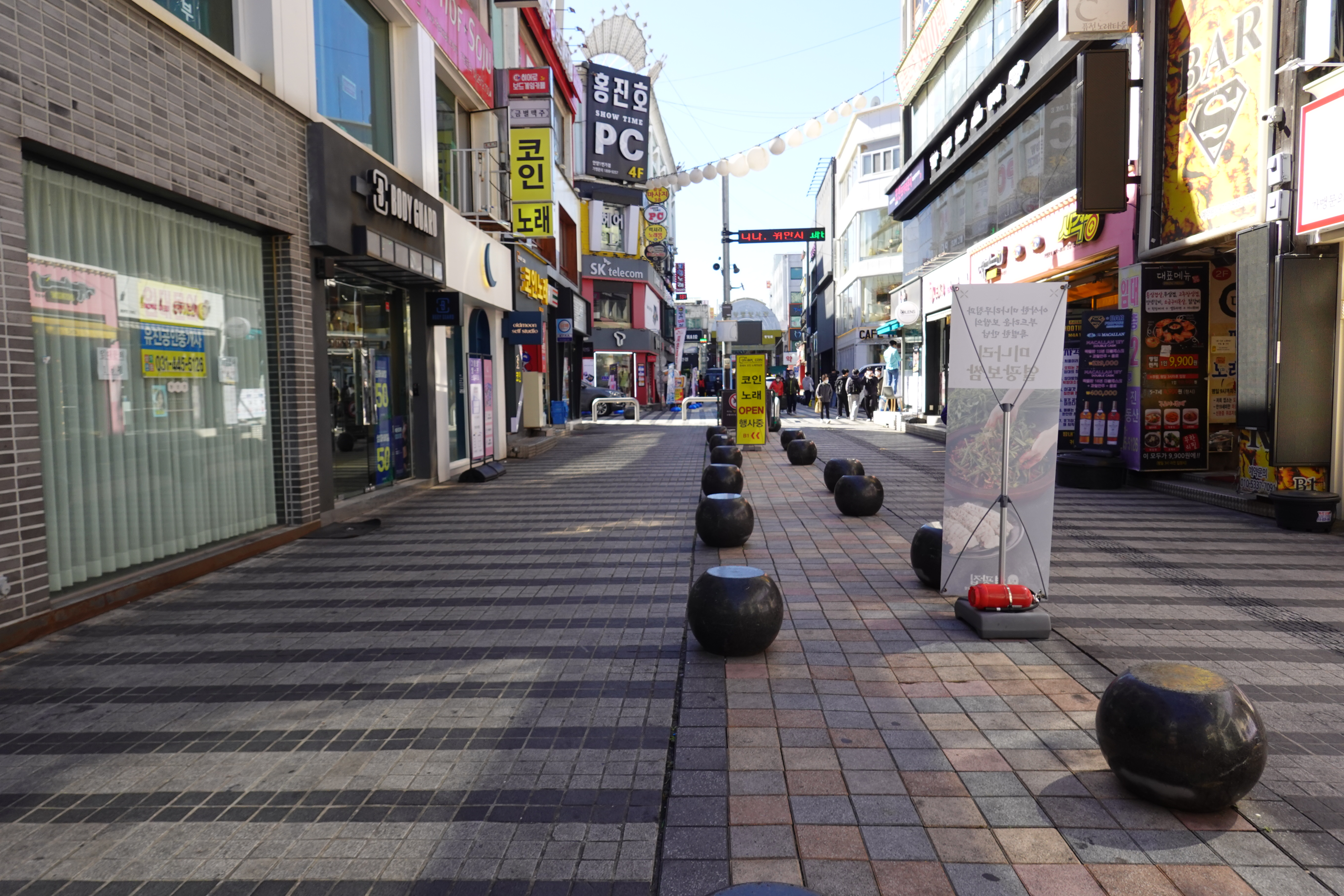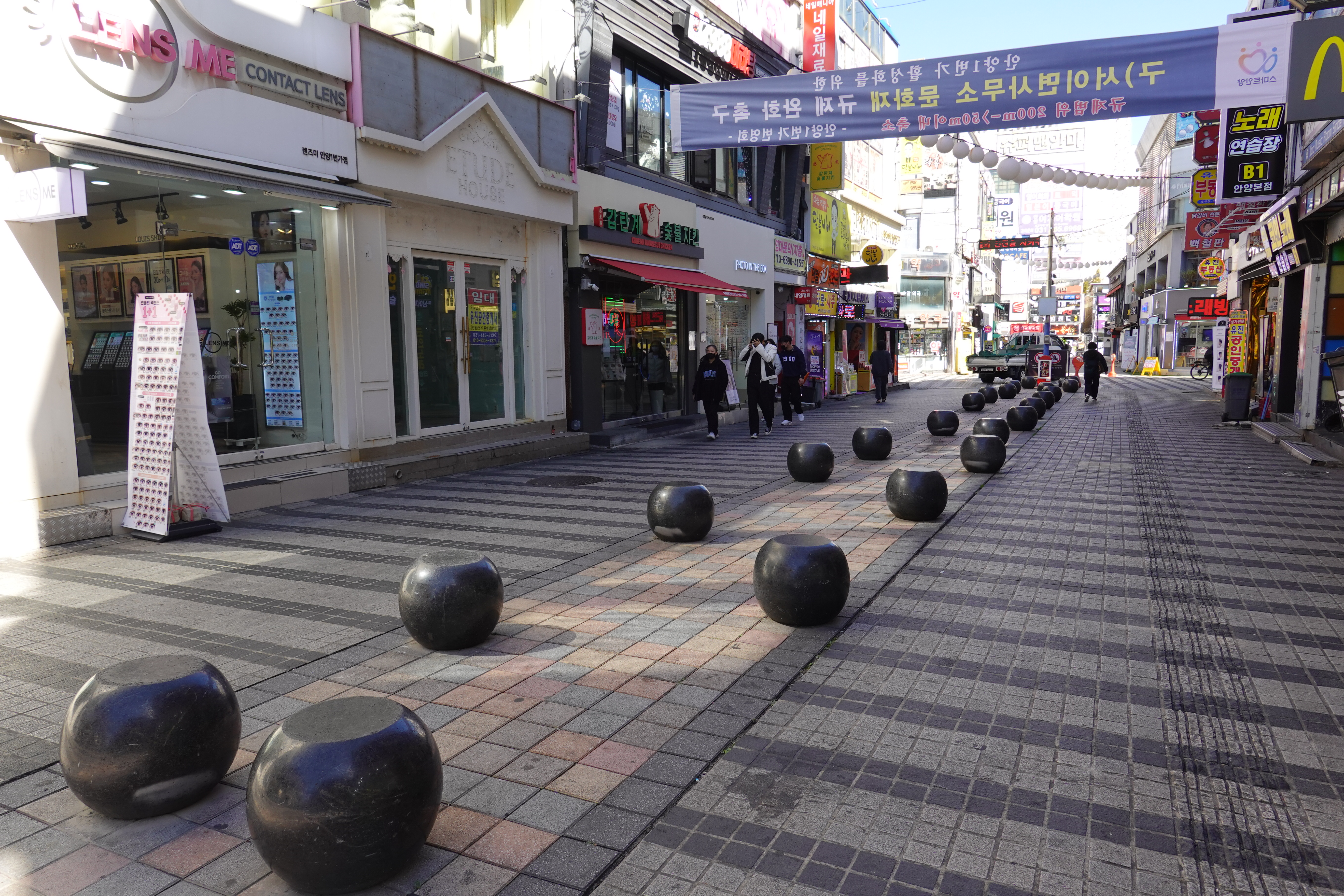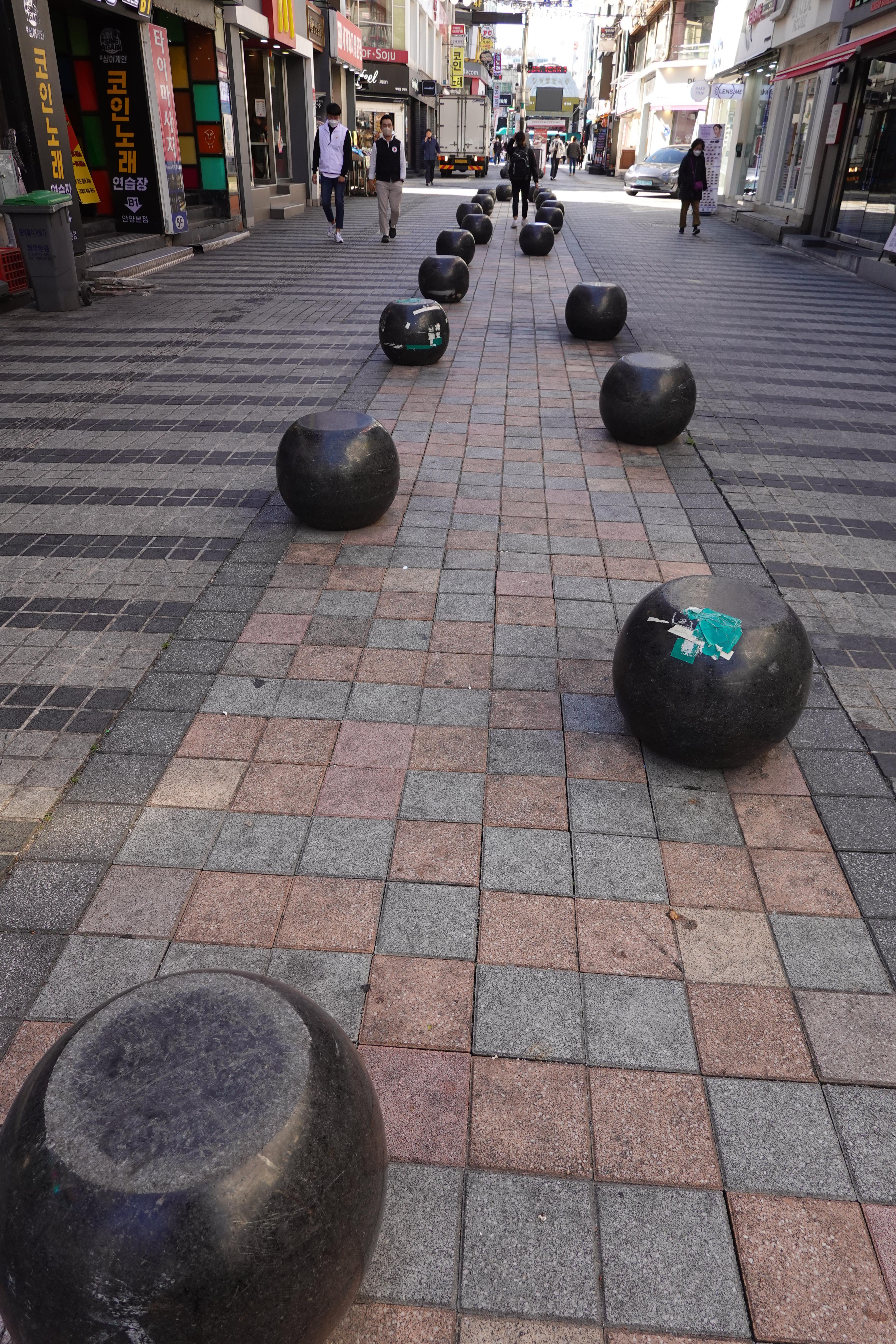 2022.10.17/ #도시기록 #안양일번가 #보행권/ 불법 주차로 몸살을앓던 안양일번가 중앙통로에 일번가 여기저기 있던 원형 볼라드(일명 호박돌)를 갖다 놓으니 걷기도 좋고, 보기도 좋고, 잠시 앉아 쉬어 갈수도 있다.