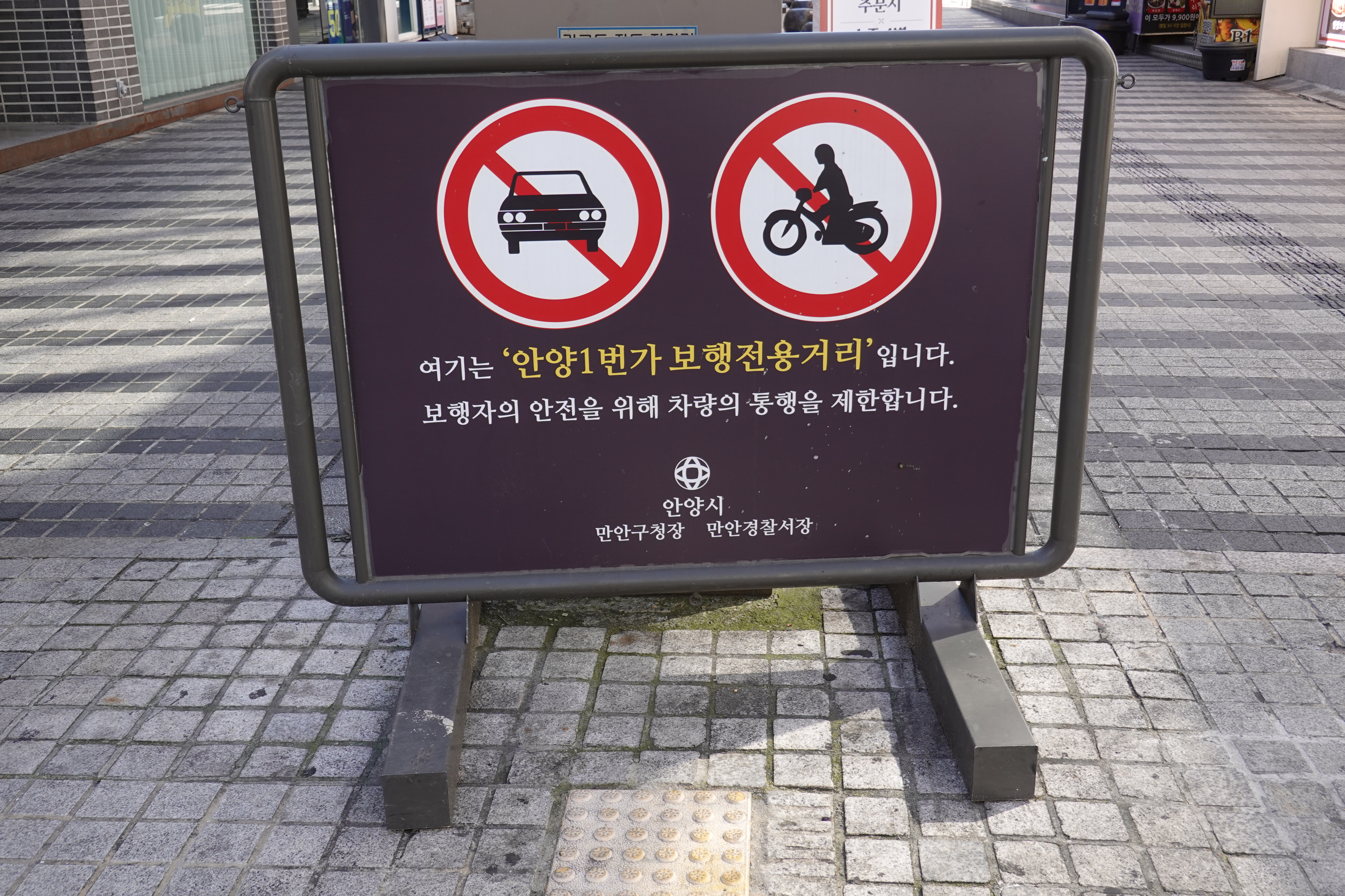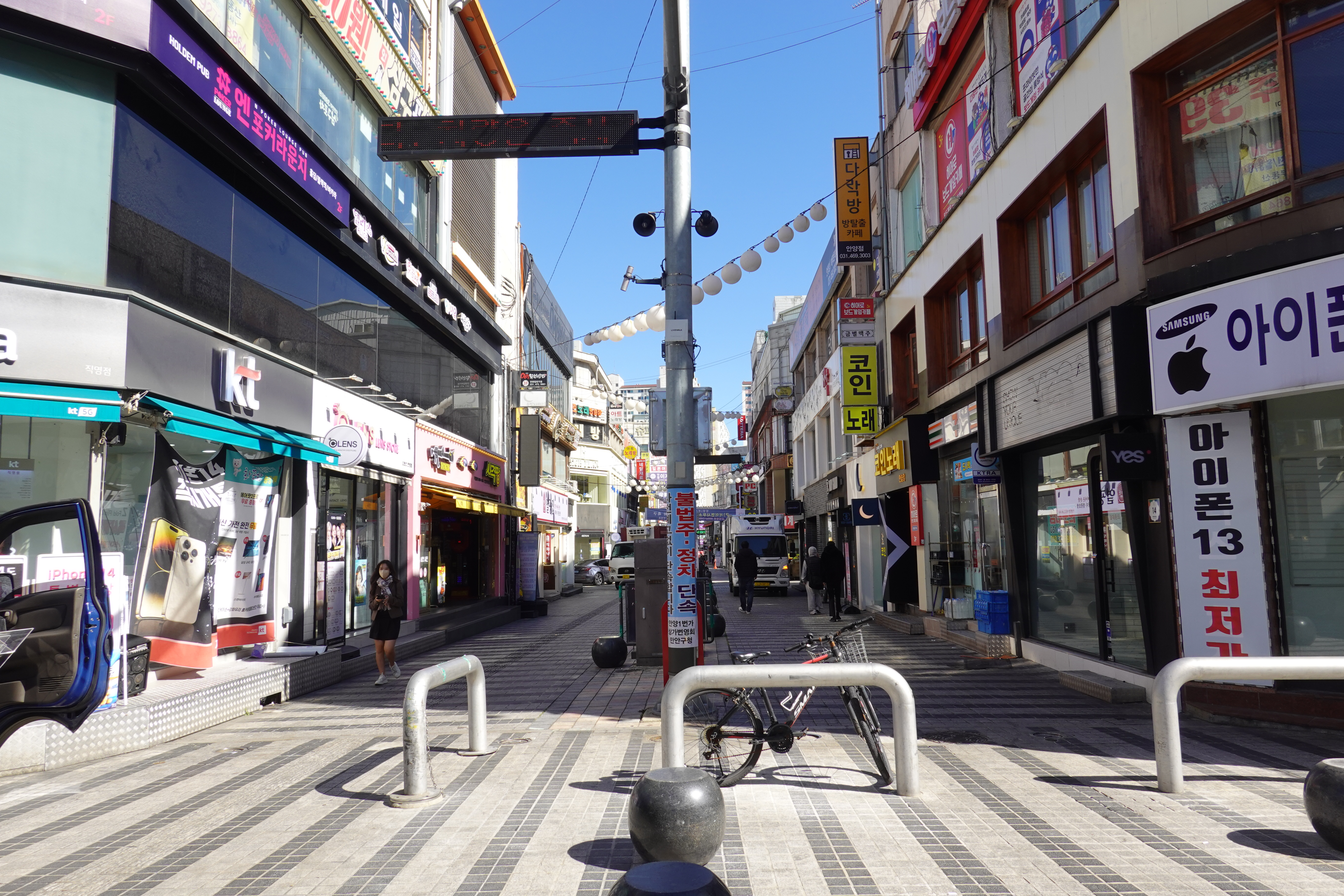 저 둥근 호박돌은 지난 2006년 안양에서 열린 세계인라인대회를 앞두고 안양 일번가를 정비하면서 일번가내 주차를 금지하고 삼원프라자호텔 앞 도로만 차량 통행을 하기위해 도로 양쪽 상가앞 주차 금지를 위해 설치했던 주차금지용 볼라드다. 당시 중앙 통로에는 직사각 형태로 앉을수 있는 커다란 돌의자가 설치됐는데 소방차 진입의 어려움, 쓰레기 문제 등으로 2015년 무렵 철거하고 그자리에 나무를 심었으나 관리 부재속에 모두 고사하고 이후 중앙통로는 불법 무단 주차의 천국으로 변질돼 보행권 침해의 대표 지역으로 손꼽혀왔다.