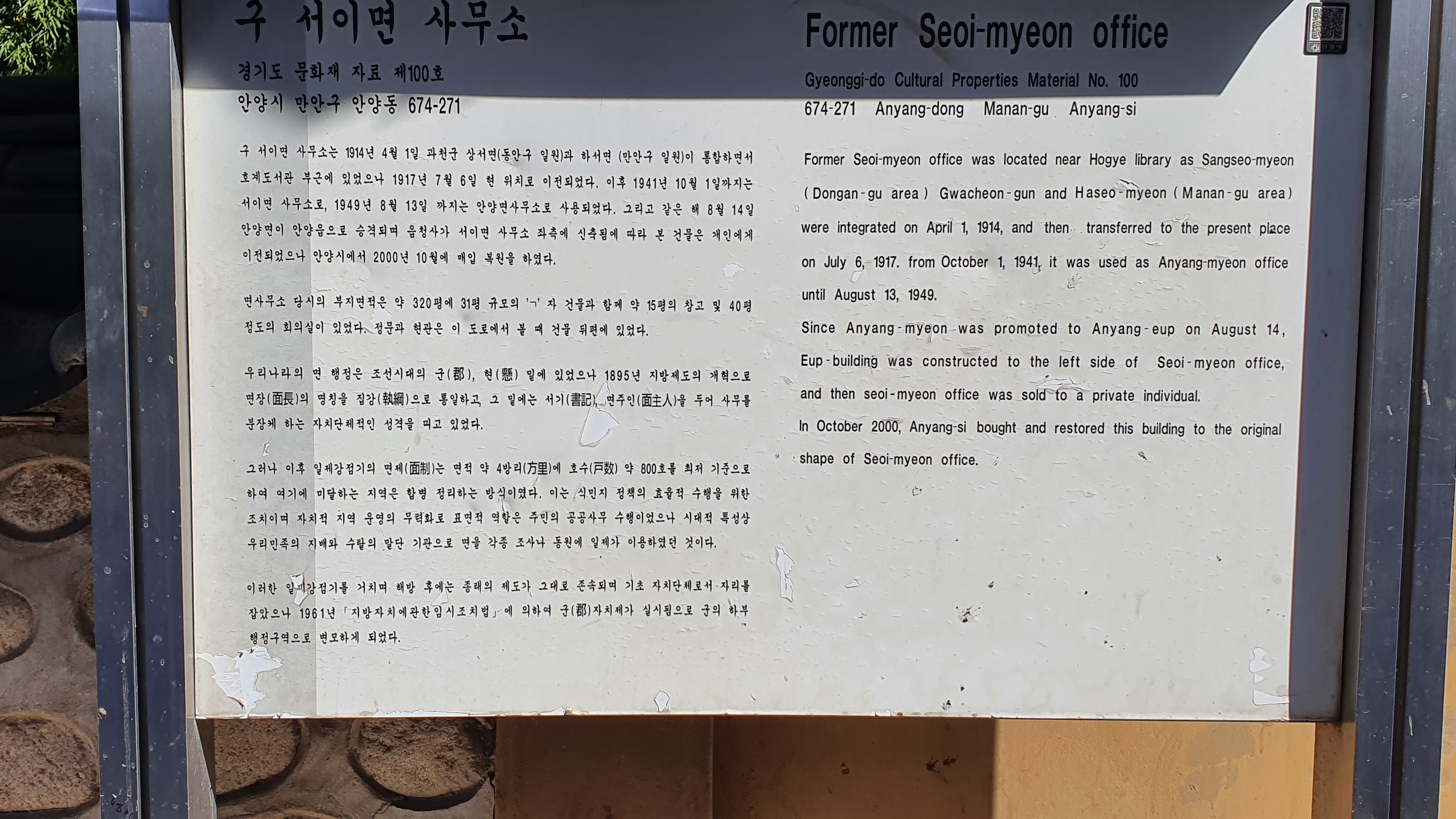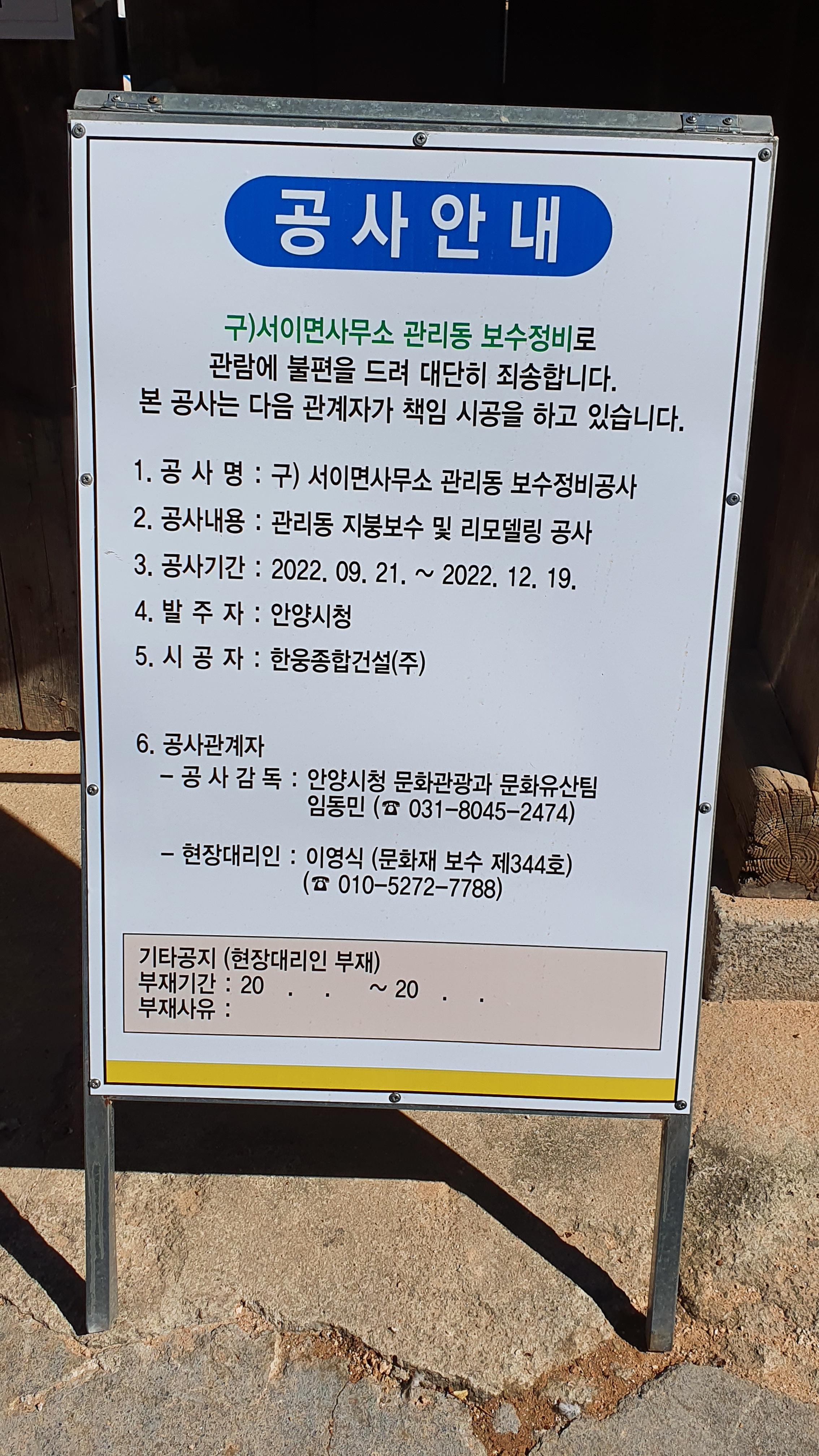 대한민국 정부 수립 이듬해인 1949년 안양면이 안양읍으로 승격하였다. 읍으로 승격하면서 서이면사무소로 안양읍사무소가 신축되어 면사무소는 더이상 관청으로 쓰이지 않게 되어 매각되어 삼성의원 안해로 쓰이다가 1983년 건물은 다시 주인이 바뀌어 안양옥이라는 갈비집이 되었다가 2000년 안양시가 매입하여 완전 해체 복원하고 문화재자료(경기도 100호)로 등록하였다.