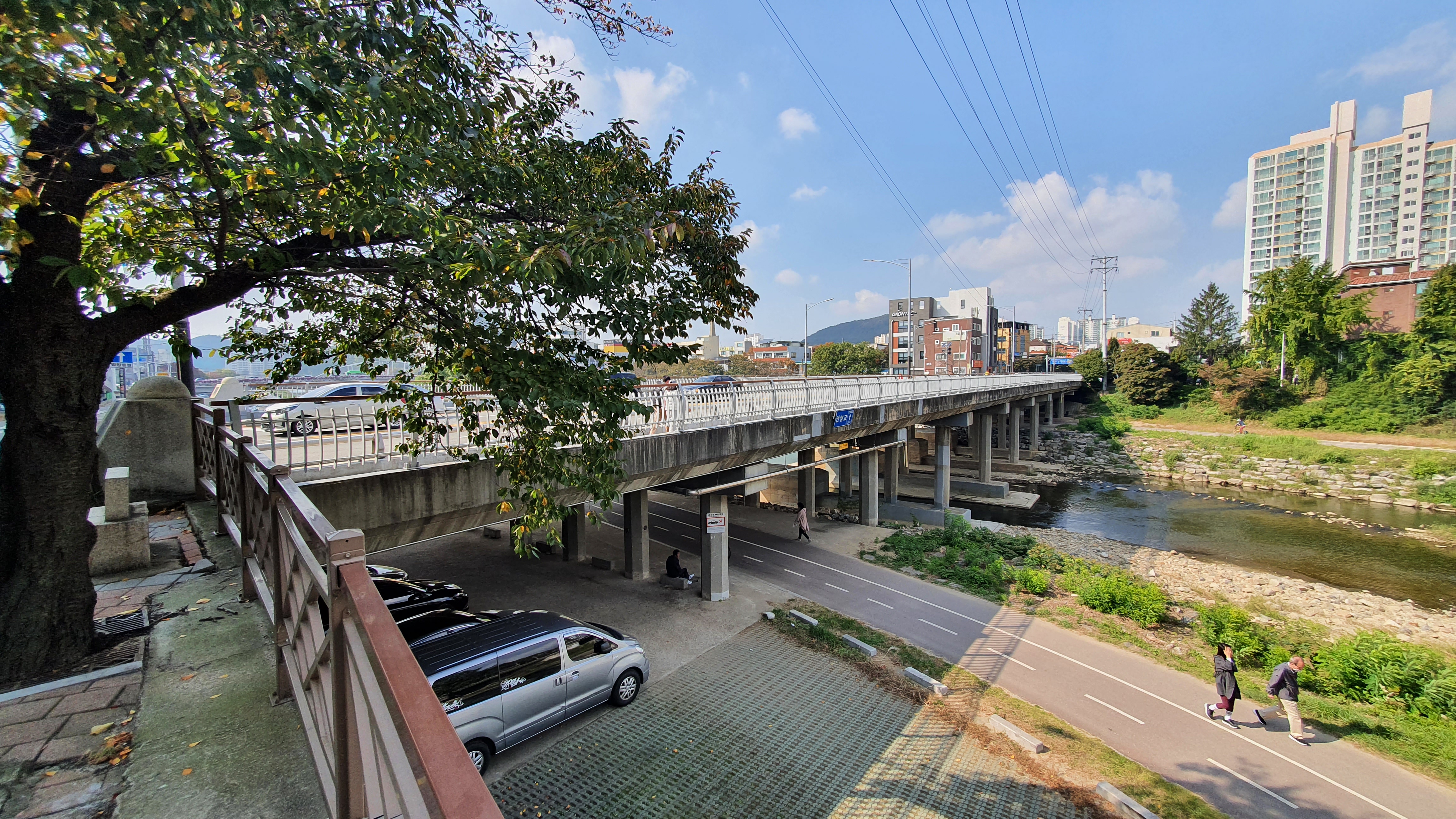 2022.10.23/ #도시기록 #안양 #안양천 #물길 #철길 #안양2동/ 만안교가 현재의 위치(삼성천)로 옮겨지기 전 당초 있던 자리(현 영화아파트)로 흘렀던 안양천 물길이 현재처럼 바뀐것은 일제강점기인 1904년 경부선 철길이 가설된 당시로 추정된다. 안영시지에서 언급된 기록을보면 경부선 철길을 기설하면서 남쯕으로 물길을 바꿨다고 한다. 사진에 안양교, 안양 철교, 안양교, 영화아파트가 보인다. 물길이 어떻게 바뀌었는지 대략 가늠해 볼수 있다.