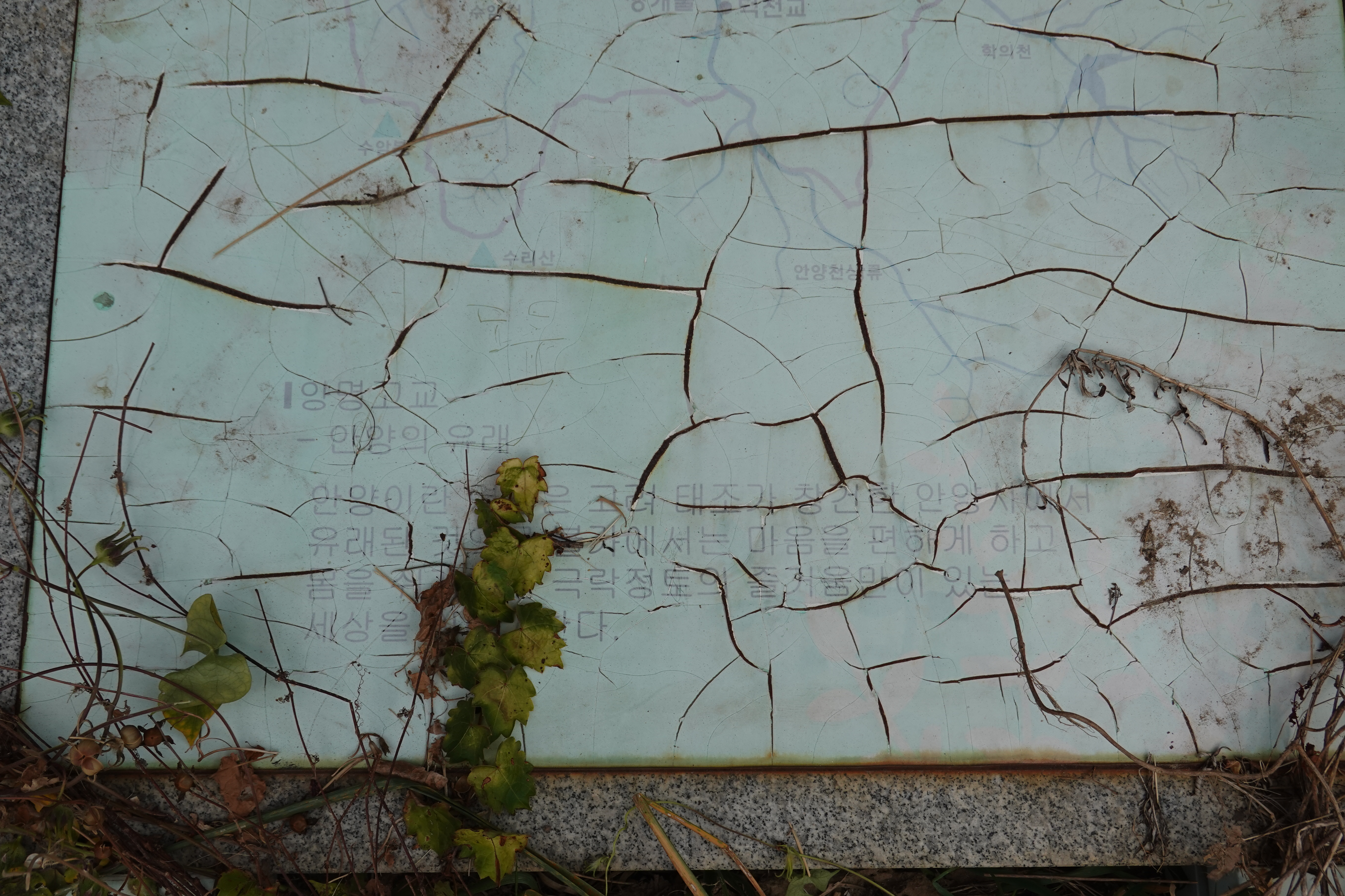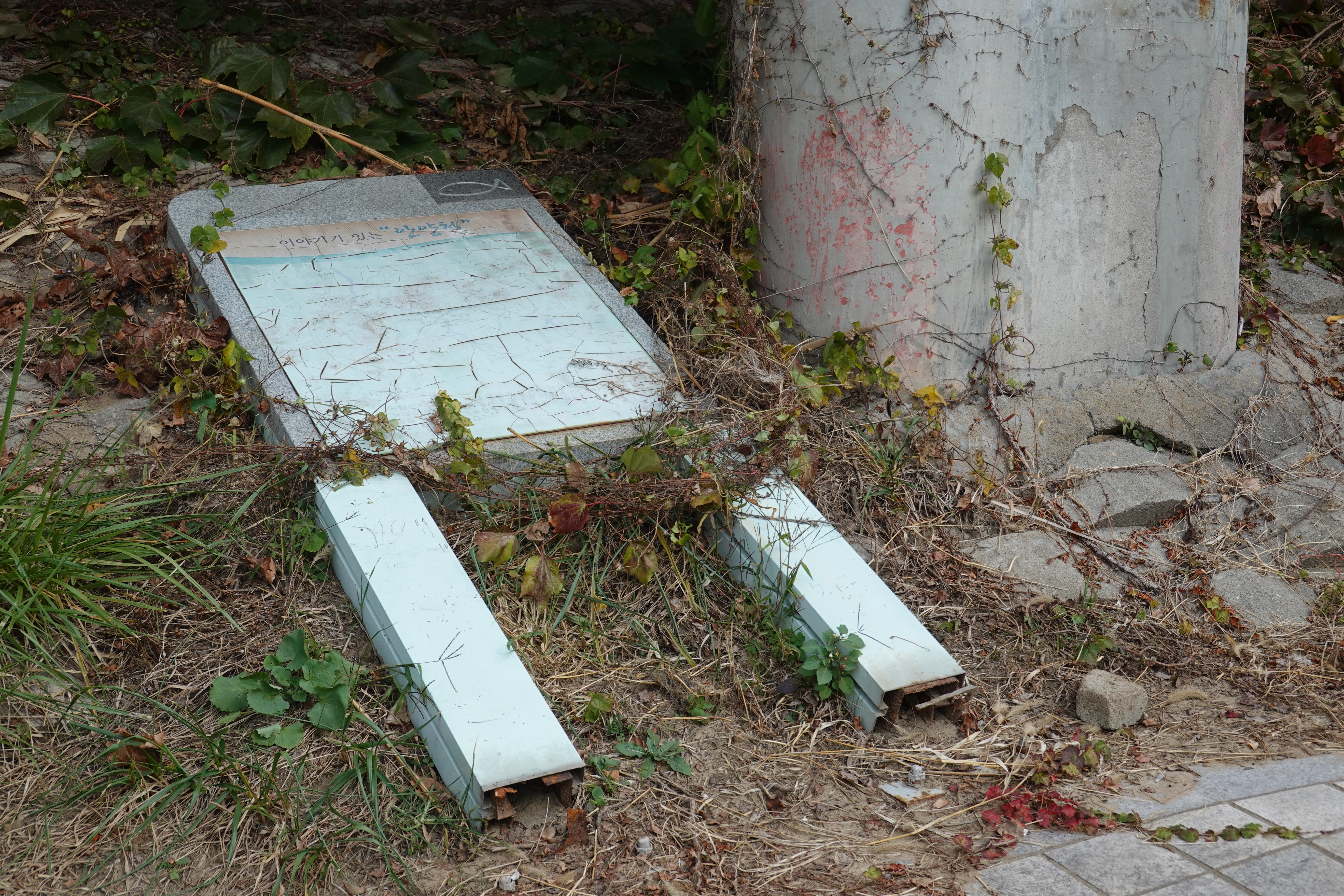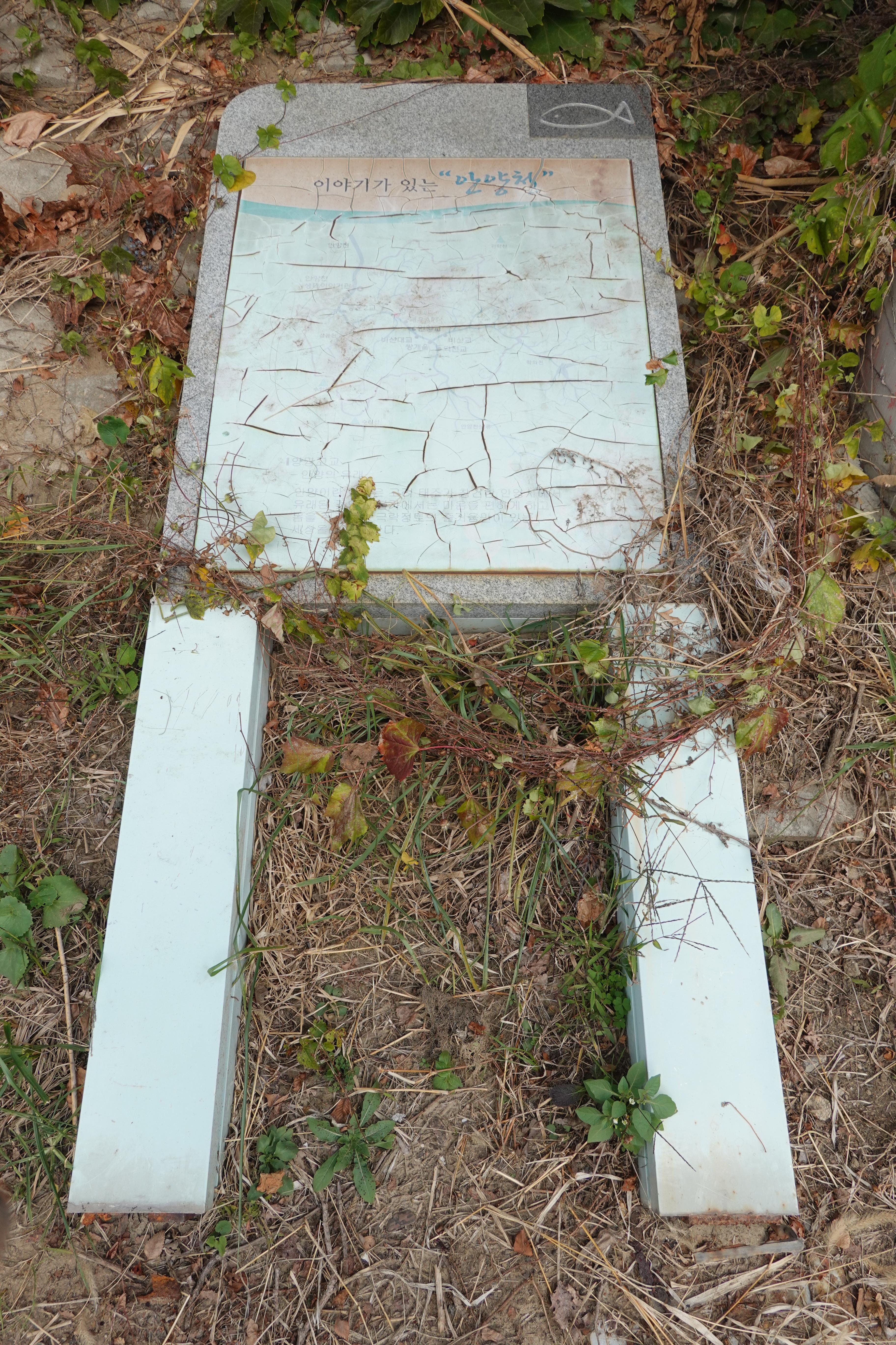 2022.10.23/ #도시기록 #에공 #파손 #안양천/ 안양 양명고앞 안양천 둔치에 설치된 안양천 관련 홍보게시판(이야기가 있는 안양천)이 부러져 폐기물처럼 누워있다. 안내판 글씨가 퇴색해 내용을 알아볼 수 없을 정도이고, 게시판을 세우는 지주용 쇠 판넬 기등이 녹이 슬어 부러진걸 볼때 지난 여름 집중호우 때문은 아닌듯 싶고 설치한지 오래돼 파손됐을듯 싶다. 어쩻든 저 상태로 방치한지 오래된듯 싶은데 하루빨리 철거 또는 교체가 필요해 보인다.