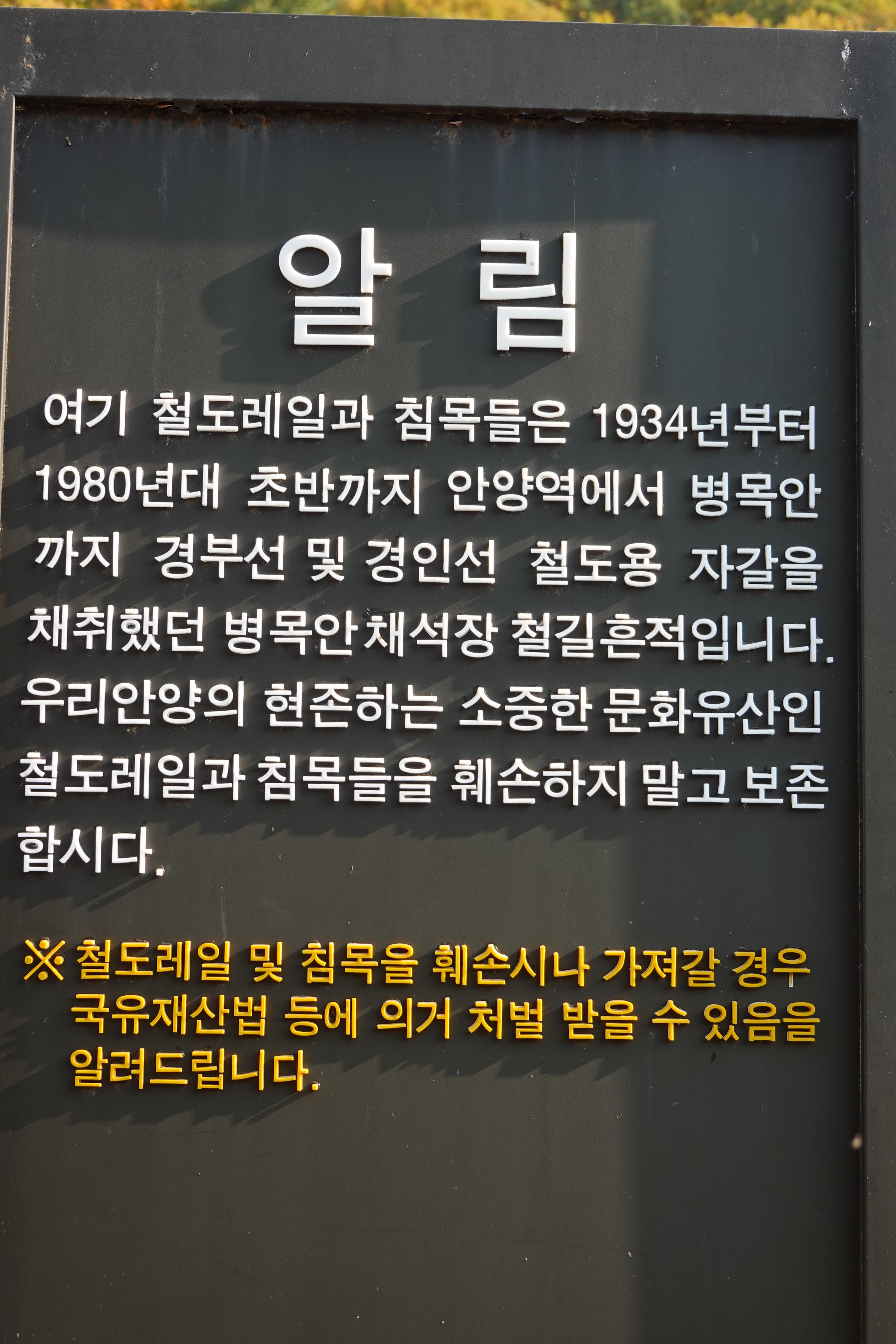 일제 강점기 경부선 복선화공사가 진행될 무렵인 1934년 안양역에서 병목안까지 철길이 놓이고 안양9동 수리산 자락의 커다란 산 하나가 파헤쳐졌다. 경부선 복선을 놓으면서 레일밑에 깔아야할 자갈을 채취하기 위해서다. 해방 이후에도 철도청은 1980년대까지 수도권 일대에 건축용 골재로 제공하기 남포(다이나마이트)를 터트려 산을 깨트렸는데 이곳을 병목안 채석장이라 불렀다.