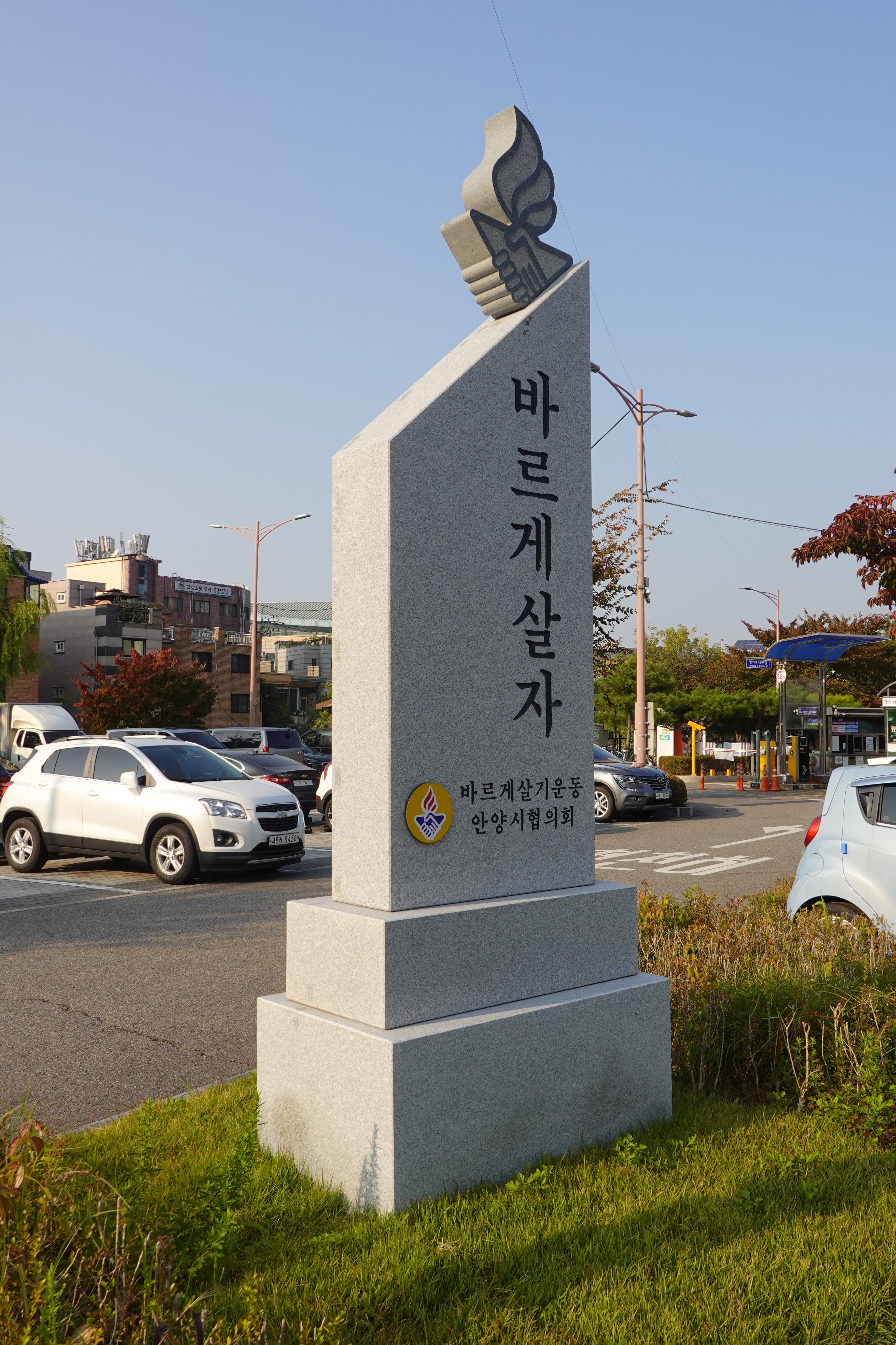 2022.10.27/ #도시기록 #기념탑 #상징물 #안양4동 #바르게살기협의회/ 안양4동 삼덕공원을 지나가던길 삼덕공원옆 공영주차장 한복판에 처음보는 무엇인가 설치됐다. 바르게살기운동 안양시협의회에서 설치한 "바르게살자"(진실.질서.화합) 기념탑. 설치일자 2022년 6월28일