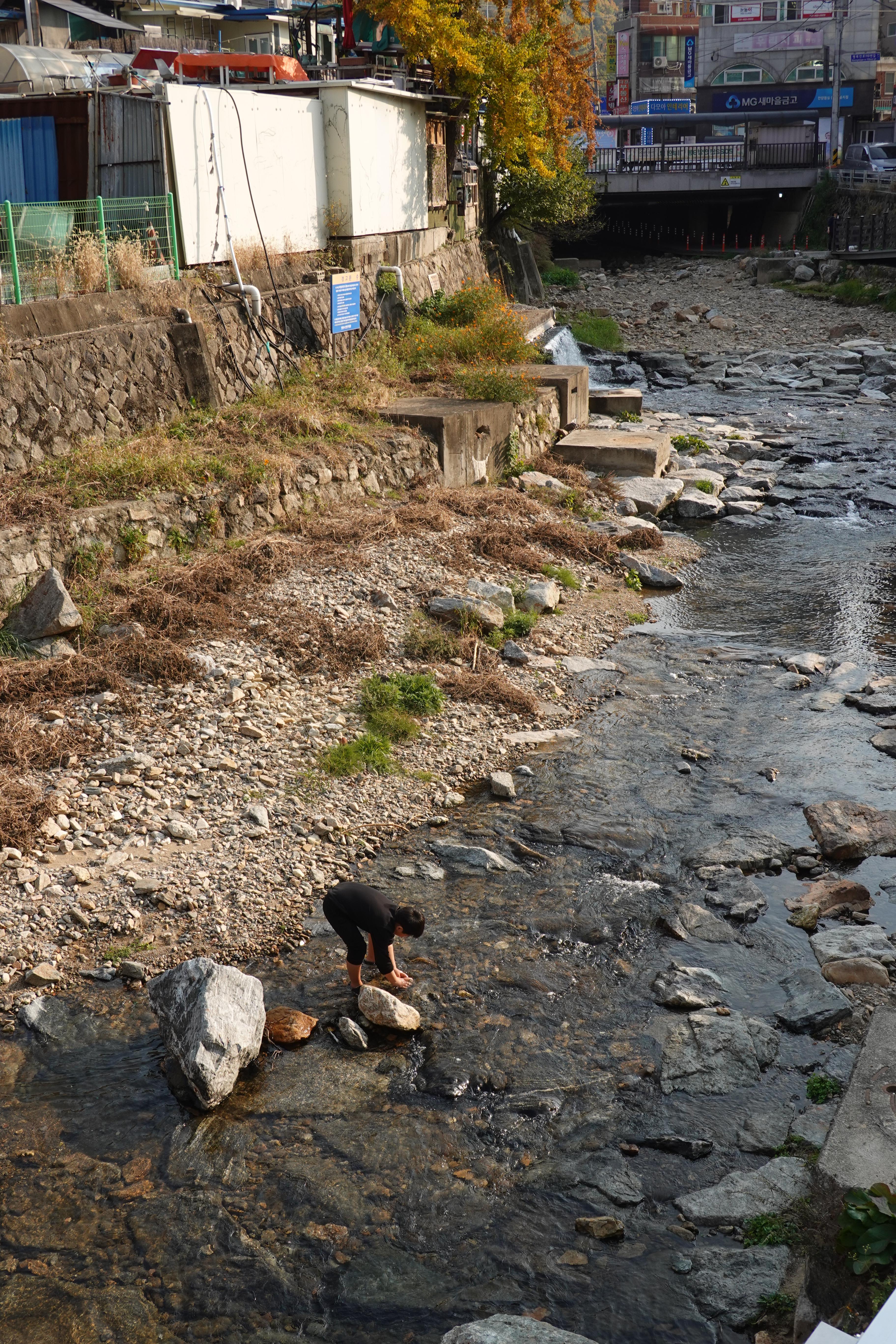 2022.10.27/ #도시기록 #수암천 #물놀이 #양지3교/ 건천이었던수암천에 물이 흐르니 놀이터가 됐다. 10월 27일 쌀쌀한날씨에도 아이들이 물놀이를 하느라 신났다. 양지3교 다리 밑은 아이부터 어른까지 사계절 마실 나오는 쉼터이자 놀이터다. 문화도시, 공공예술 차원에서 제대로 된 쉼터가 마련됐으면 좋겠다.