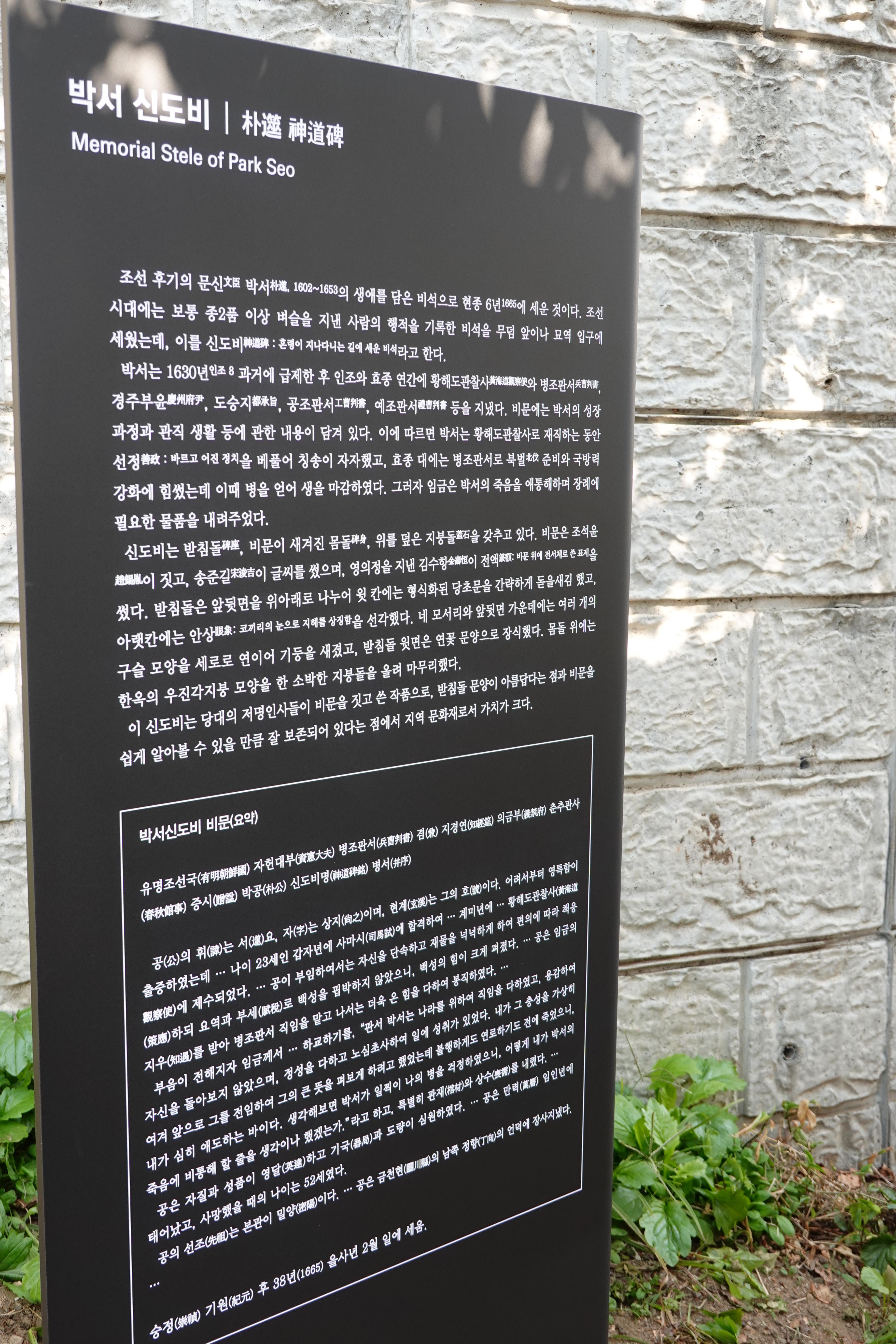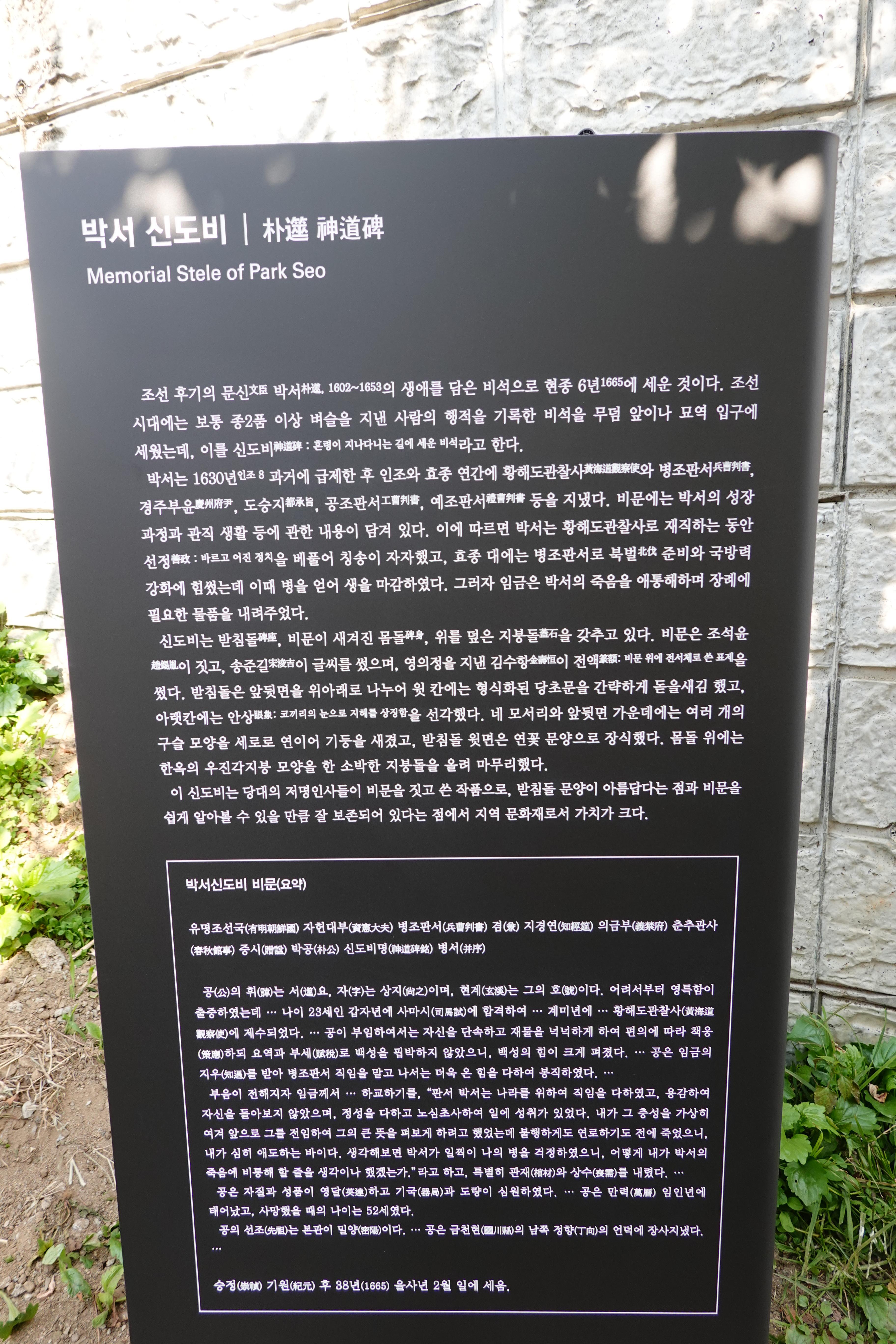 안양 석수2동 화창마을 뒤 석수배수지 건너편 산자락(만안구 석수동 산168)에는 조선 중기의 문신으로 이항복 문하에서 수학하고, 과거에 급제한 후 인조 때에는 황해도관찰사, 사간원 대사간, 의금부총관을, 효종 때에는 도승지, 공조판서, 예조펀서, 병조판서를 지낸 박서(1602-1653) 신도비와 묘쇼가 있다.