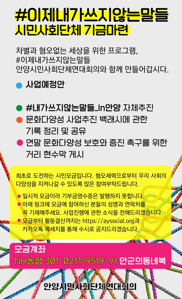 연대회의는 11월 1일부터 15일까지 사업재개를 위한 기금을 모금한 뒤 12월 1일부터 #이제내가쓰지않는말들in안양을 재개한다고 밝혔다.