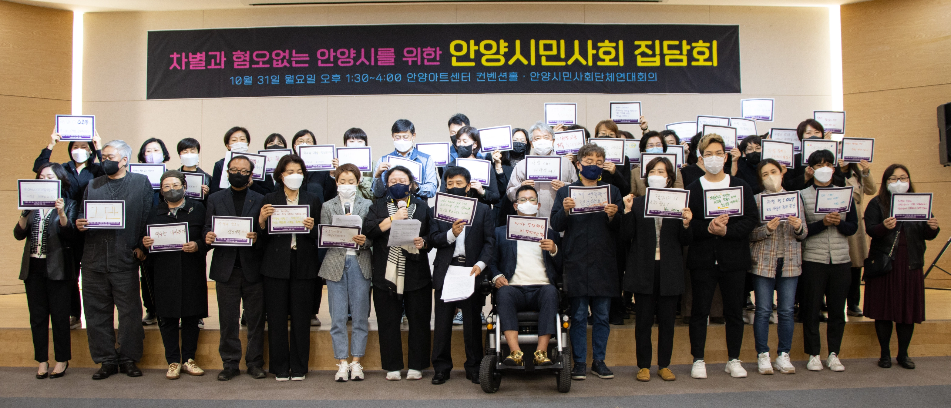 안양시민사회단체연대회의(이하 연대회의)는 10월 31일 안양아트센터 컨벤션 홀에서 “차별과 혐오없는 안양시를 위한 안양시민사회 집담회”를 열었다. 본 집담회는 2022년 6월 말 중단된 안양시문화다양성 촉진과 기반조성에 관한 사업 (이하 안양문화다양성사업) 중단을 배경으로 한다. 연대회의는 문화다양성 사업 자체 추진을 선언하고 일부 민원세력에 굴복해 안양시와 안양문화예술재단이 사업중단을 요구한 것에 관한 항의, 향후 재발방지대책을 촉구하기 위한 연대구성을 위해 본 집담회를 개최하였다고 밝혔다.