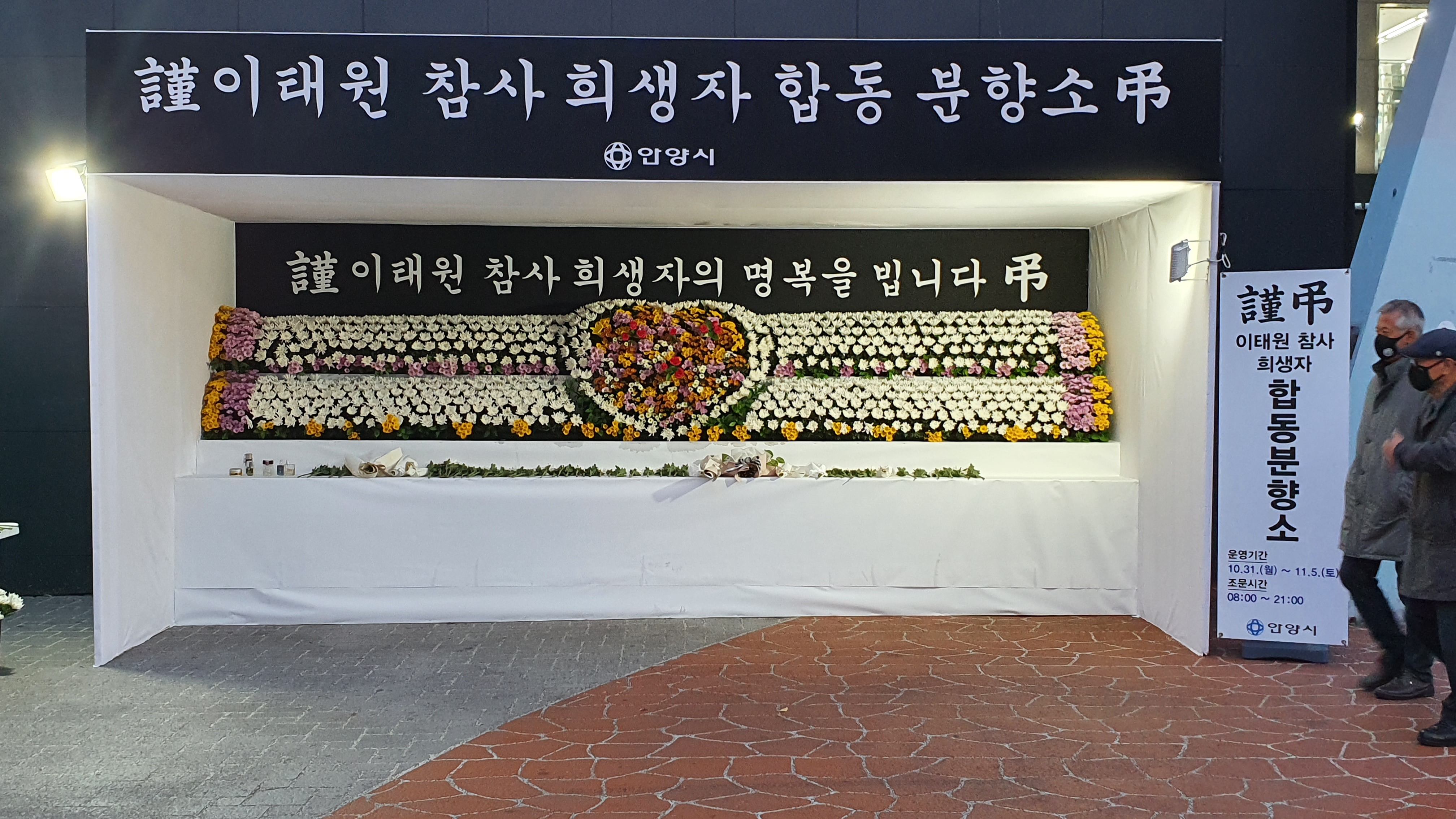 2002.11.03/ #기록 #이태원참사 #분향소 #안양역/ 이태원 참사와 관련한 안양시 분향소 현수막이 '이태원 참사 희생자 합동분향소'로 변경됐다. 안양시는 10월 31일 분향소 설치시 행안부 지침대로 (이태원 사고 사망자 합동분향소)로 했다가 안양시의원들의 요청과 시민 민원을 고려하여 11월 1일 오전 (이태원 사고 희생자 합동분향소)로 바꾸었다가 11월 1일 저녁 9시 (이태원 참사 희생자 합동분향소)로 다시 바꾸는등 표현을 세차례나 변경했다. 행안부는 일선 지자체에 보낸 공문을 통해 10월31일부터 별도 종료시점까지 시도별 1곳에 합동분향소를 설치하도록 했다. 설치 장소는 시도 청사를 원칙으로 하되 주민들이 접근하기 쉽고 질서가 유지되는 조용한 실내 공간으로 명시했다. 분향소 표시는 '이태원 사고 사망자 합동분향소'로 하고 제단 중앙에는 '이태원 사고 사망자'라고 쓰도록 했다. 주변을 국화꽃 등으로 장식하고 영정사진이나 위패는 생략하라는 지침도 내렸다. 이태원 사고 사망자라 명시하고 위패나 영정은 놓지 않는다." 고 명시했다. 이 때문에 각 지자체에서는 행안부 지침대로 진행했다가 시민 항의, 의회의 문제제기로 갈팡질팡하다가 단체장 결단에 따라 이태원 (참사) (희생자)라는 표현이 제대로 쓰여지기 시작했다.