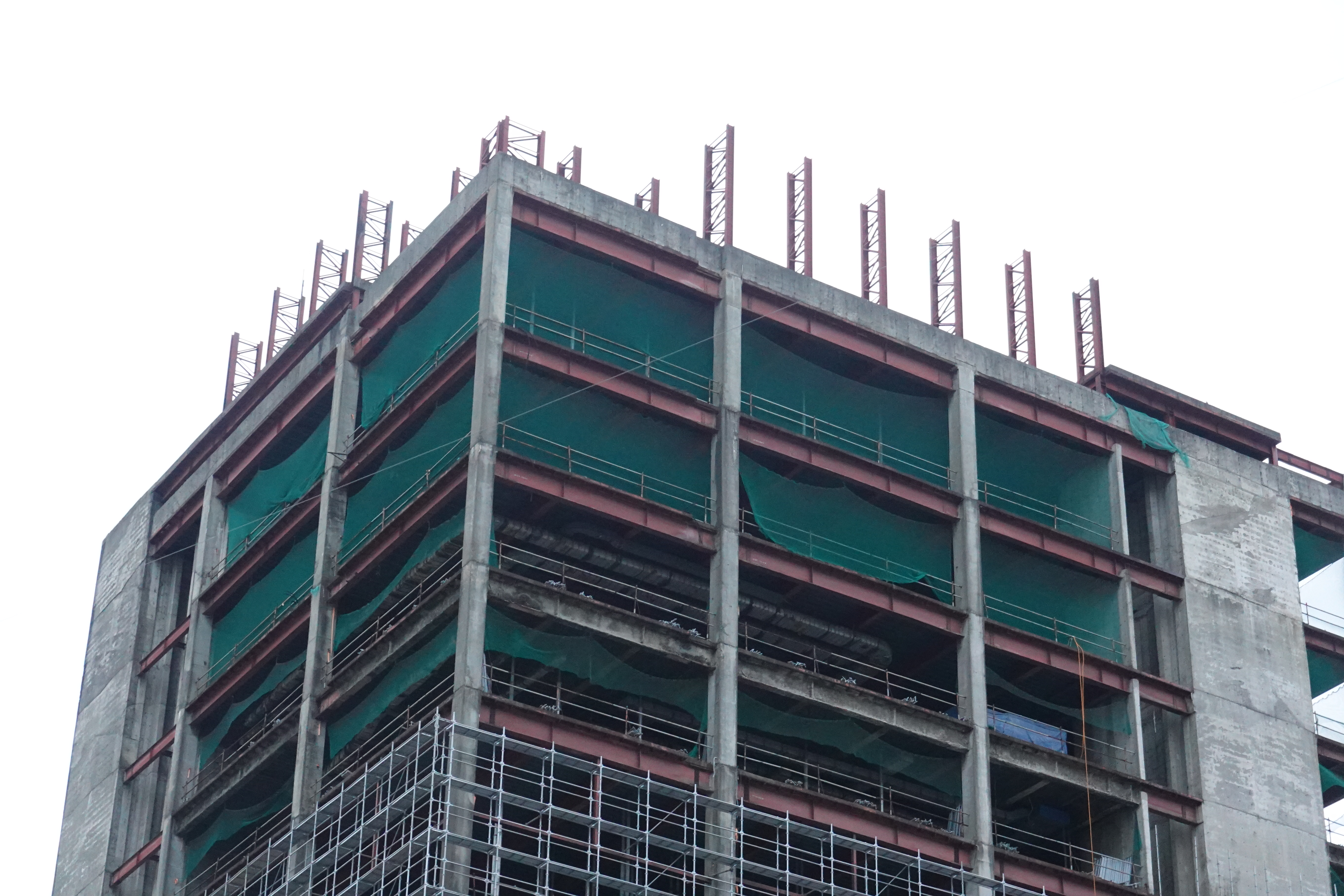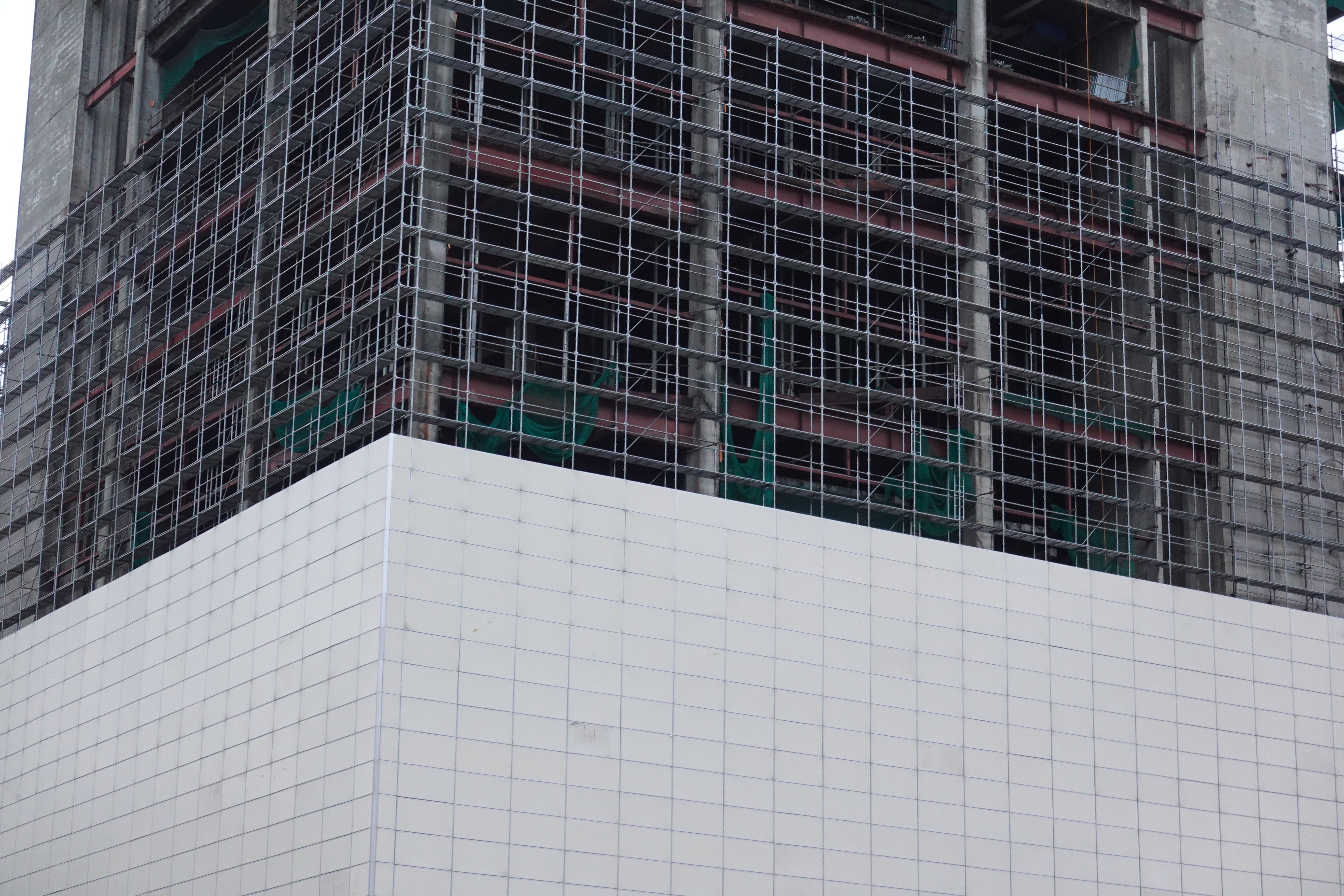 원스퀘어 철거 공사는 현재 건물 외곽으로 12층 높이의 2/3까지 철골 펜스를 설치하고 공사시 폐기물 추락과 비산 먼지 방지를 위한 시스템비계(흰색 가림막)을 설치하던중 중단된 상태다.,