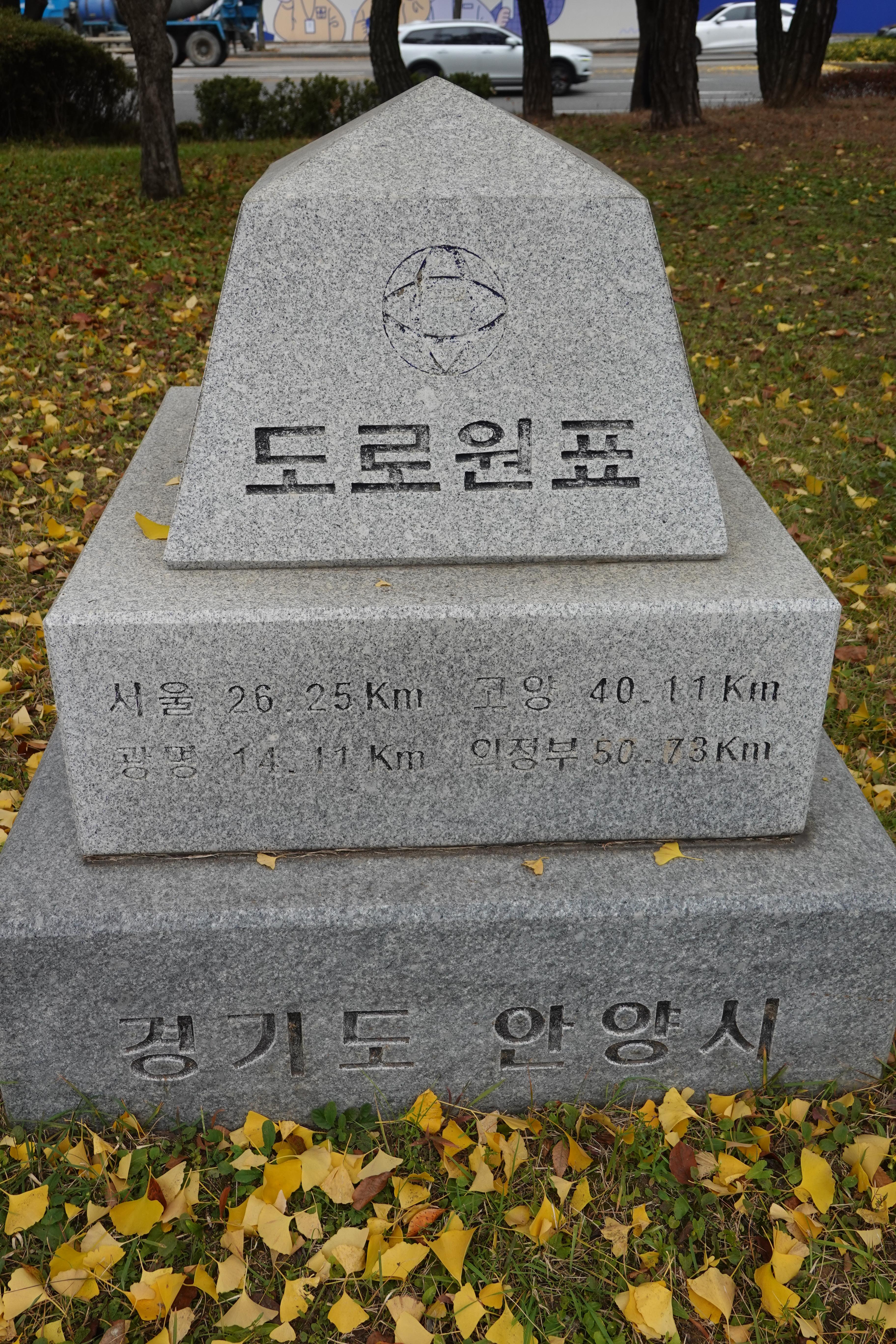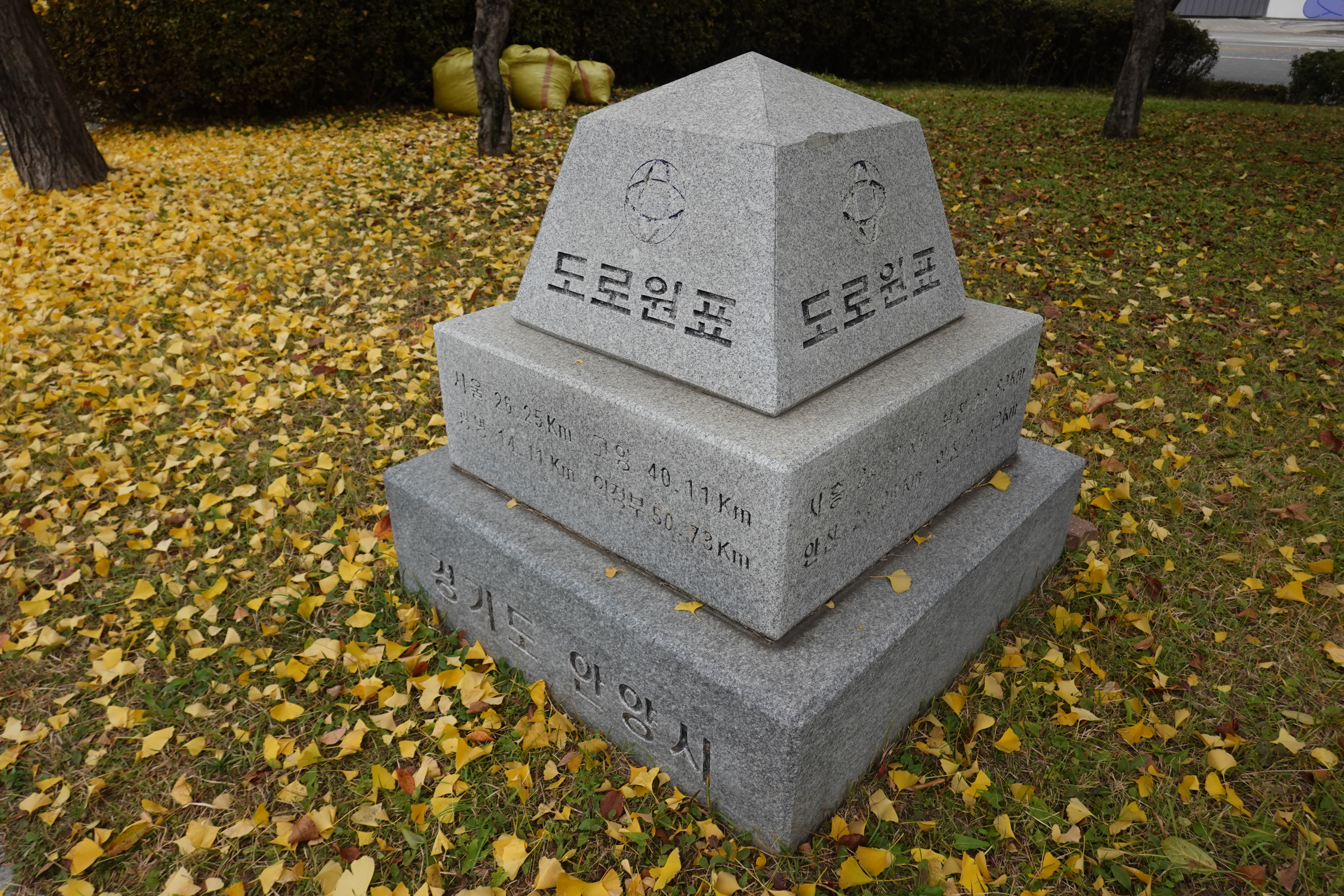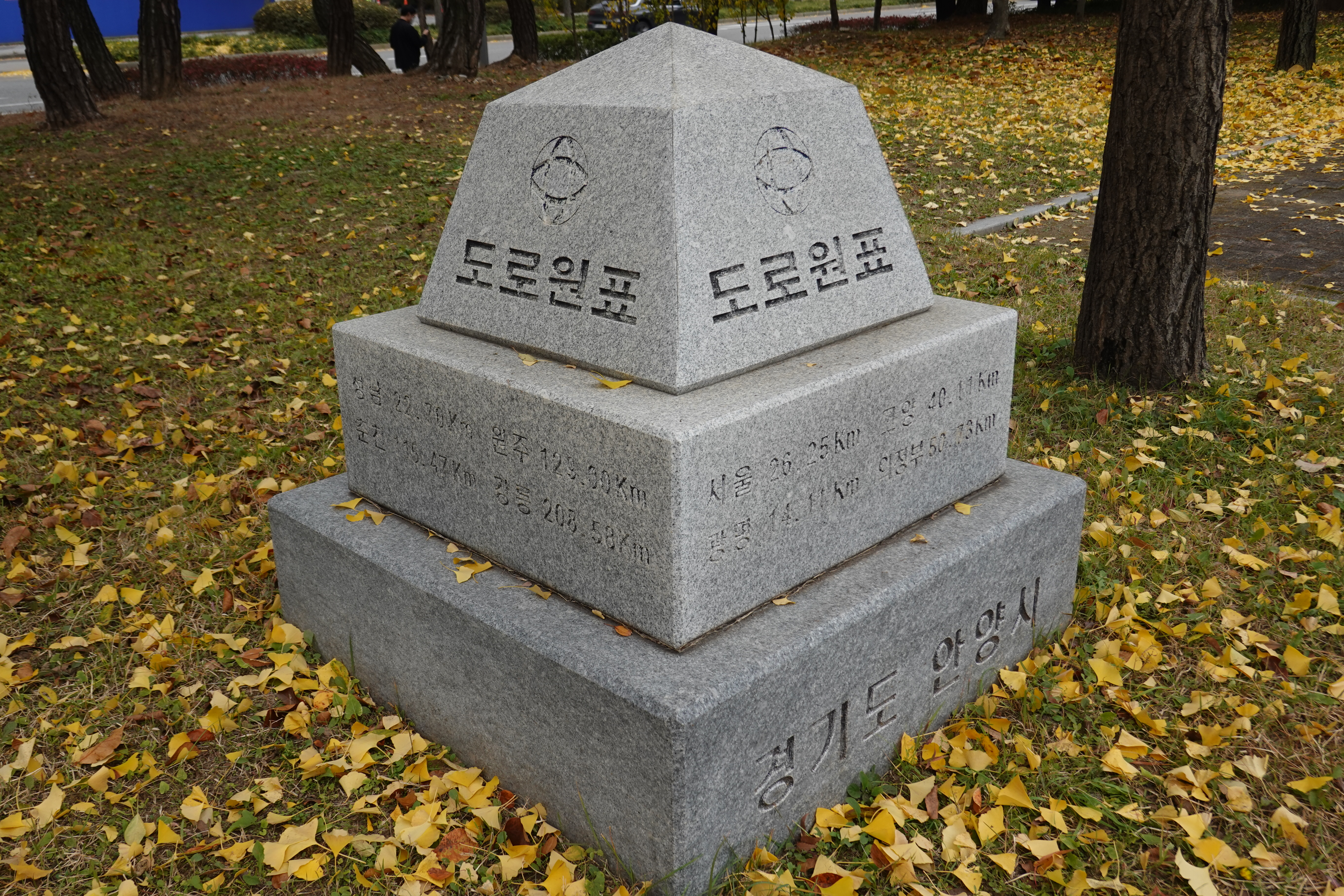 2022.11.03/ #도시기록 #안양 #도로원표 #안양시청 #기준점 #이정표 #표지석/ 목적지를 향해 달리다 보면 이정표가 얼마 남았는지를 알려주지요. 그런데 행선지와 함께 거리가 적혀 있는 경우, 이를테면 '이천 20Km', ‘속초 95Km’ 이런 식으로 표기되어 있을때 이천과 속초의 어디까지인지 궁금하지 않습니까?