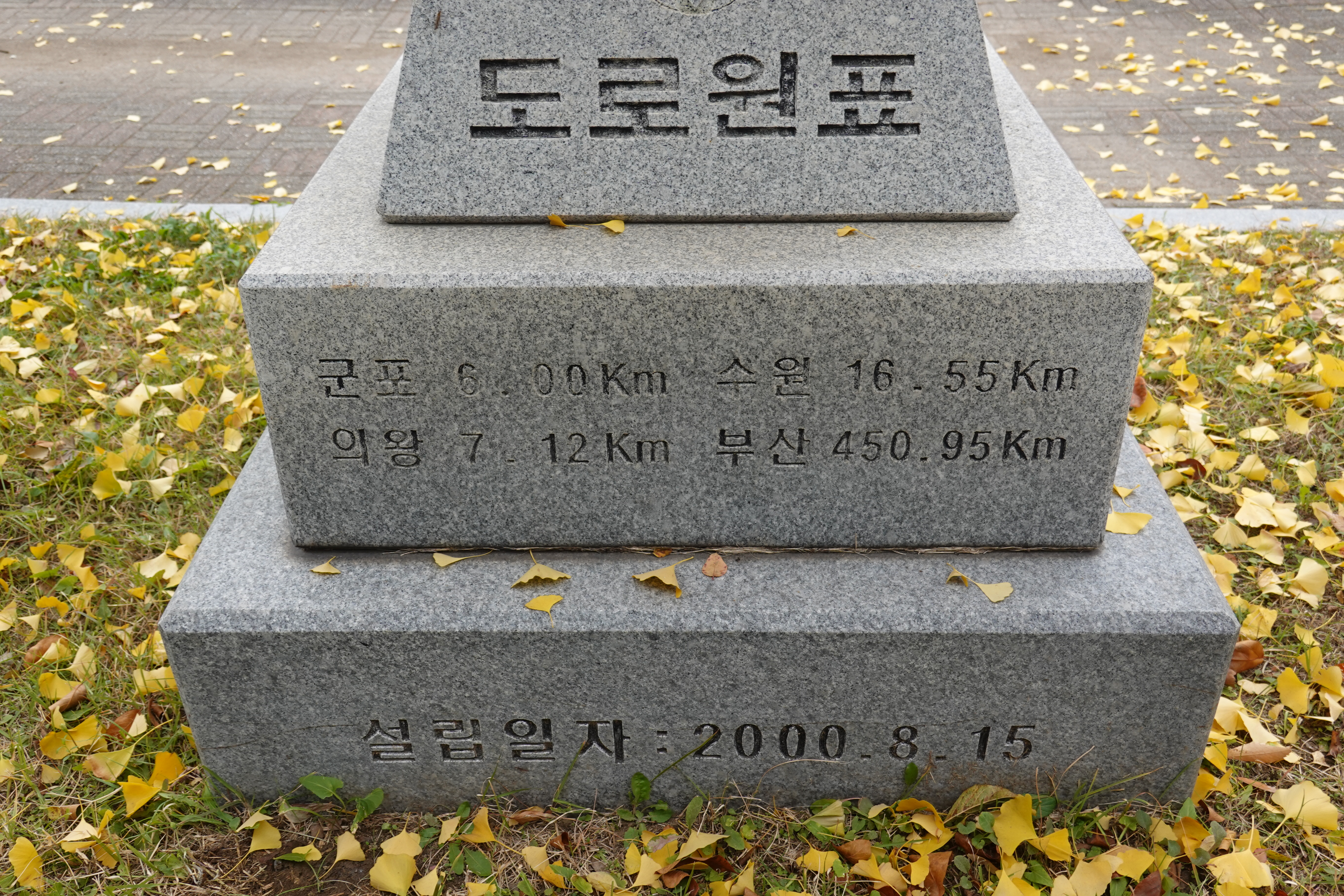인터체인지야 따로 설명할 필요없을 것이지만 도로원표는 다소 생소하시지요. 도로원표(道路元標)는 도로의 기점(起點) ·종점(終點) 또는 경과지를 표시하는 기준점 표시이지요. 도로원표에는 주요 도시간 거리가 표시돼 있고요. 이 도로원표를 설치하는 곳은 도청과 시청, 군청 등 행정의 중심지에 있는 도로교차로 중앙, 이른바 ‘교통섬’ 정가운데 또는 인근에 설치합니다. 안양시의 경우 안양시청 민원실 앞에 설치돼 있습니다. 군포시에서는 시청앞 이마트 사거리아 인도에 설치돼 있더군요.