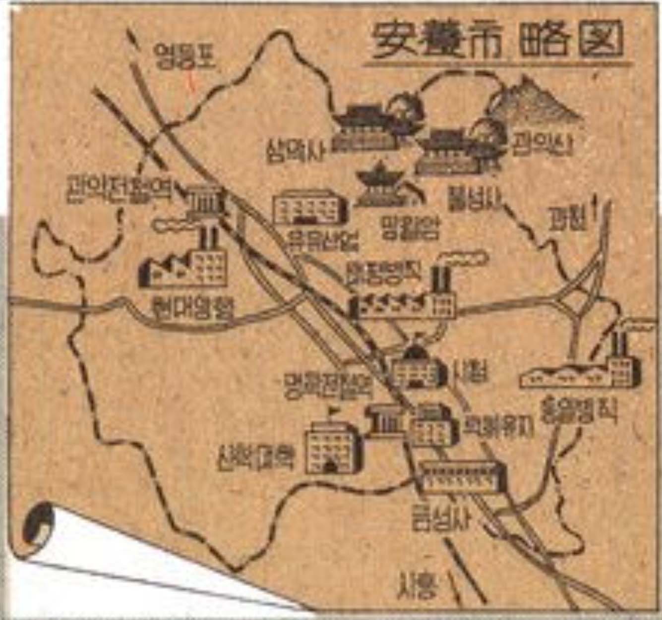"安(안양)은 관악산과 수리산의 정기를 이어받아 나날이 발전해가는 공업도 시이며 수도 서울의 관문으로서 아름다운 자연은 이 고장의 자랑입니다"