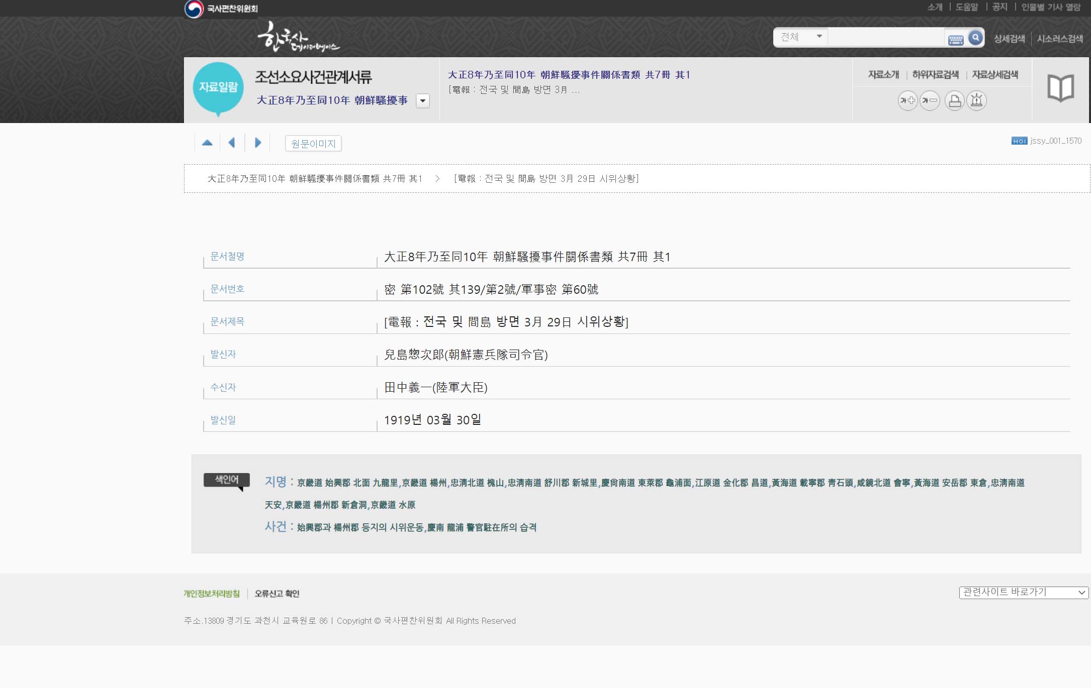 2차세계대전 종전 후 미국이 일본 육군성으로부터 압수해 간 이 문서는 워싱턴 소재 미국 국회도서관(Library of Congress) 내의 Photoduplication Service에서 MF로 촬영·보관하고 있으며, 1958년 3월 일본으로 반환된 후 현재 일본 방위청 방위연구소에서 소장하고 있다(청구기호 : 陸軍省-朝鮮事件-T8-1-75~81). 재일사학자 강덕상, 김정명 등에 의해 선집(選集)이 발간되었고, 한국 국회도서관에서도 마이크로필름을 수집하여 1970년대 후반 『韓國民族運動史料』(三一運動 篇 基1~3)으로 번역집을 발간했다. 우리 위원회는 미국 국회도서관본 마이크로필름을 복제 소장하고 있다.